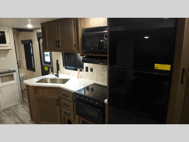 The Autumn Ridge travel trailers by Starcraft are easy to tow and easy to love! Each one is constructed with a durable Magnum Roof system, black front diamond plate protection, and fiberglass insulation so you can camp well into the colder months. The kid and pet friendly residential vinyl flooring will be easy to keep clean, and you'll love the hardwood cabinet doors, pleated blackout night shades, and pressed membrane kitchen countertops. An AM/FM/Bluetooth radio with indoor/outdoor zoned speakers means you can listen to your favorite tunes as you visit with friends and family, plus there is a power awning with LED lights for an inviting outdoor living space.