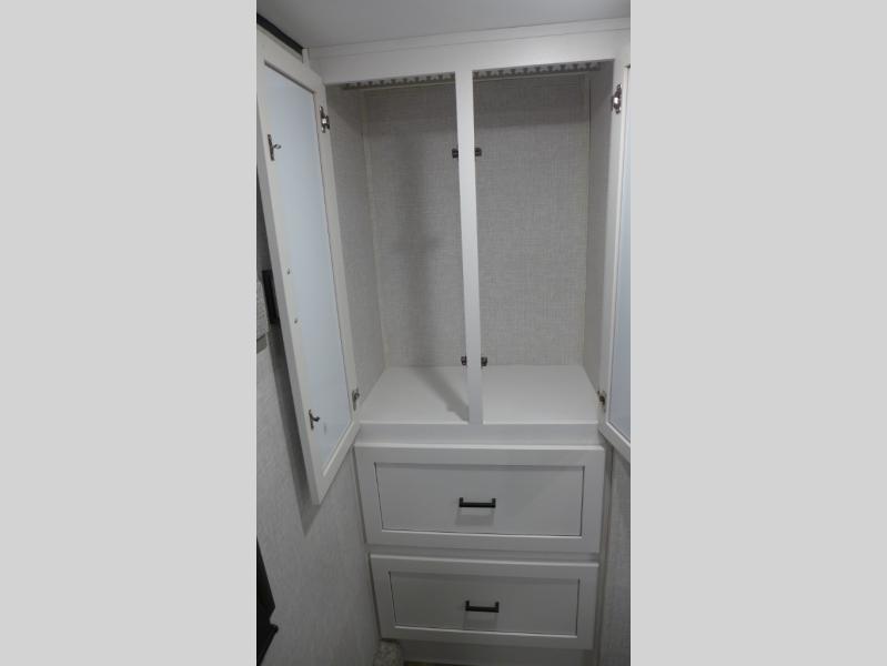 You will have the perfect couple coach in this GSL Light Duty fifth wheel! With a bi-fold sofa you could easy sleep one or two more if needed. Cook and dine just like home with a table and four chairs, or opt for the theater seating. You will love the modern interior with hardwood cabinet doors, 75 lb. ball bearing drawer glides, LED lighting, stainless steel appliances, and a flush floor slide. The front private bedroom features a comfortable queen bed with storage overhead, plus nightstands and shirt wardrobes on either side and an extra wardrobe. The bathroom offers a shower with skylight for more natural lighting, plus a vanity with sink so you can get ready with ease each morning. Outside, a 16' power awning provides a space to relax with camp chairs protected from the elements both day and night, and there is TV hook-up available as well as hook-up for a griddle, plus LP quick connect too. Outside storage is also available, as well as an outside shower to quickly rinse off dirty feet before heading inside.