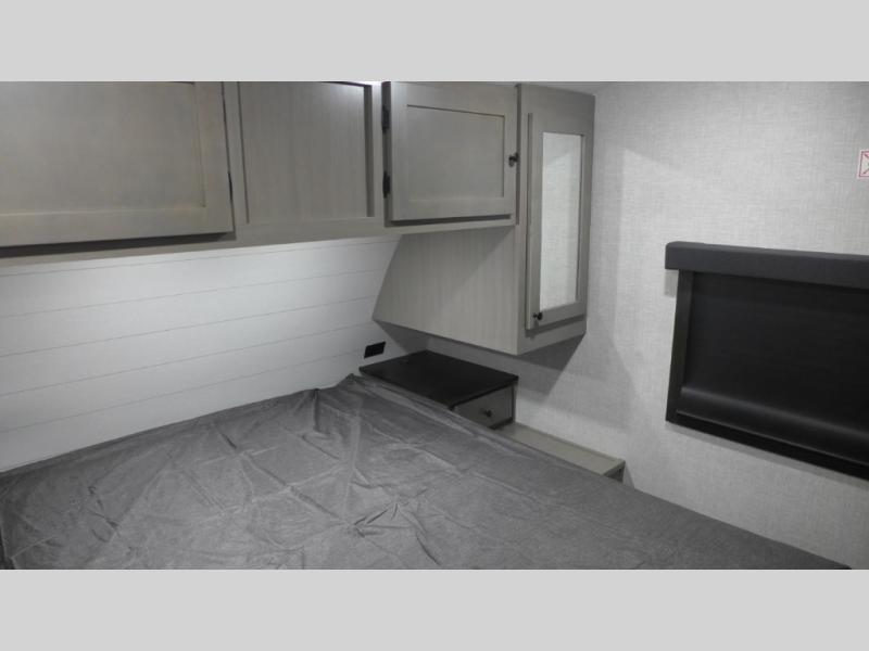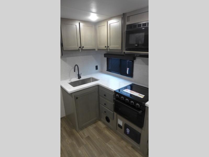 With any Starcraft Super Lite travel trailer, the solid and lightweight construction includes a fully walkable roof with a PVC roofing membrane that easily reflects solar heat and UV rays and TuffShell vacuum bonded laminated construction, reinforced with heavy-duty fiberglass and welded aluminum frames. There is also a molded front cap with LED lighting to protect against elements, a power tongue jack for easy towing, plus a power awning with LED lighting. The interior is spacious with an 81" living room ceiling height, hardwood cabinet doors, and flush floor slides with residential vinyl flooring and pressed membrane countertops for easy cleanup. Don't wait for your next adventure, take a Super Lite with you today!