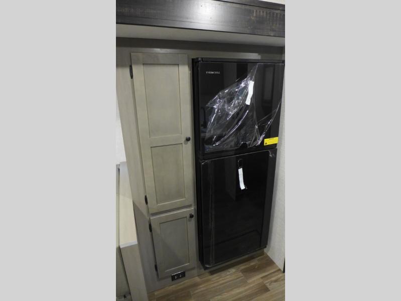This trailer allows a bigger group enough space to sleep eight, plus an inside kitchen with full amenities and an outside kitchen to feed everyone! The combined living and kitchen area is spacious with a large slide out that includes the U-shaped dinette which doubles as sleeping space, a pantry and the 10 cu. ft. 12V refrigerator which allows more floor space when inside. The cook will enjoy the L-shaped area to make meals with overhead storage for cooking items, and everyone can watch the smart HDTV/entertainment center, and store their jackets in the entry closet. The full bathroom will keep everyone clean before bedtime, and the exterior spray port will keep your shoes and bikes clean.