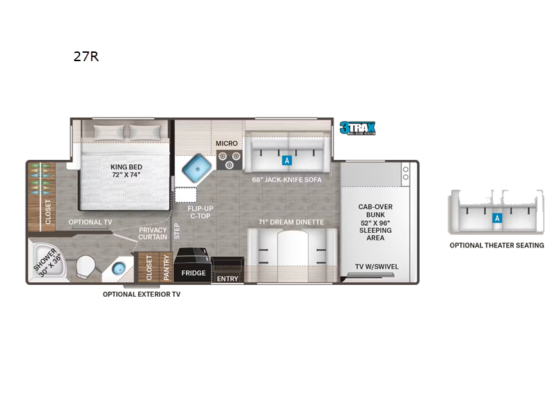 Enjoy a home on wheels with this motorhome! The private bedroom has a 72" x 74" king bed slide for you to get a good night's rest each night, a closet for your clothes, an optional 32" TV, and a privacy curtain to draw. It is conveniently next to the rear corner bathroom too which has a 30" x 36" radius shower with a skylight above for more natural lighting. You can prepare a delicious home cooked meal with the flip-up countertop extension and three burner cooktop then enjoy it at the 71" Dream Dinette. The 68" jackknife sofa offers a comfortable place to take an afternoon nap or you can switch it out for the optional theater seating instead. If you need more sleeping spaces then you will appreciate the 52" x 96" bunk over cab with a 40" TV on a swivel!