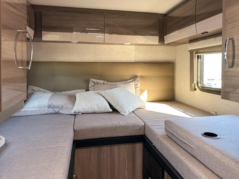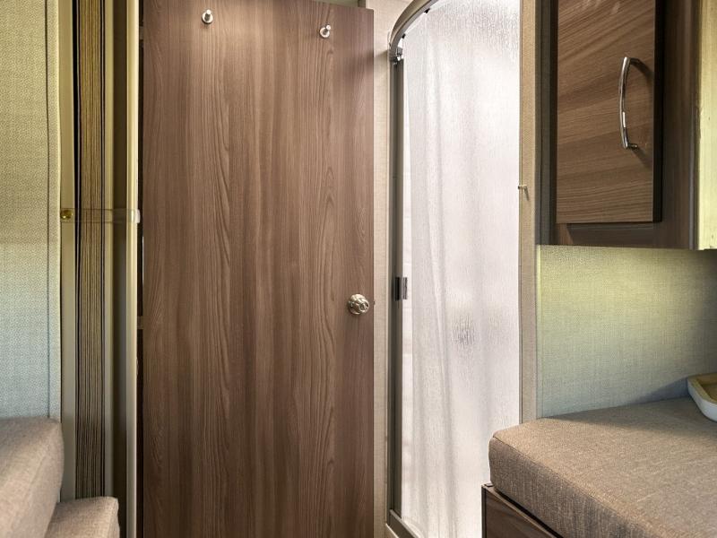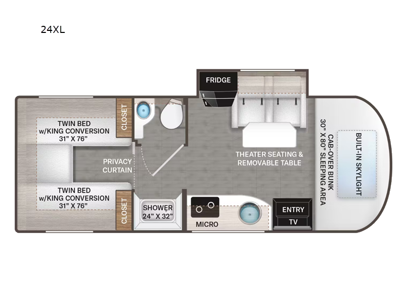 Experience a comfortable road trip in this motorhome! You will get a good night's rest on the two rear twin 31" x 76" beds that can convert into a king bed with a privacy curtain and two closets to store your clothes. After a long day of traveling, rinse the day off in the 24" x 32" shower while another uses the private toilet and sink. Fill your bellies with delicious home cooked meals with the two burner cooktop and 12V refrigerator then enjoy them at the theater seating with removable table slide. There is extra sleeping space with the 30" x 80" bunk over cab and the built-in skylight above it adds extra natural lighting!