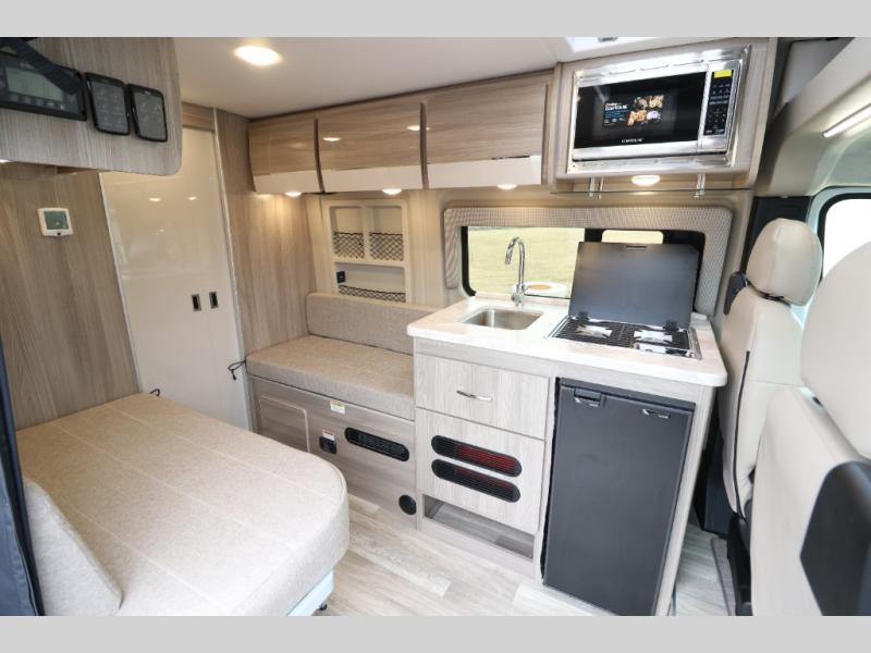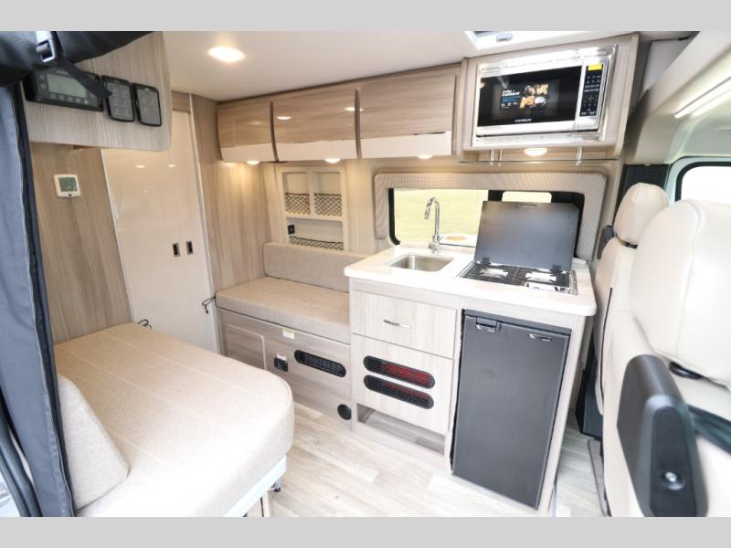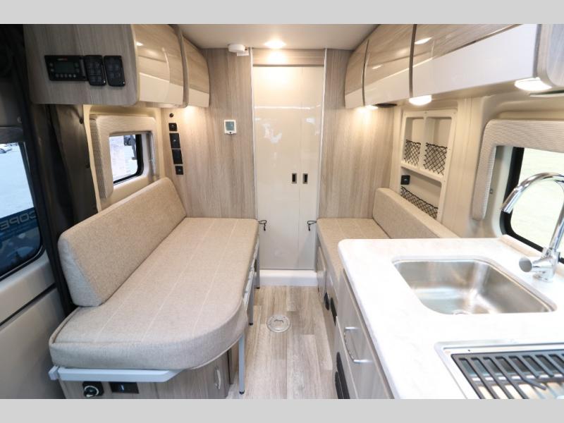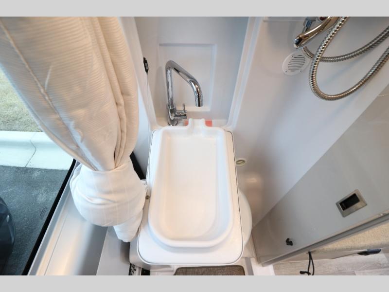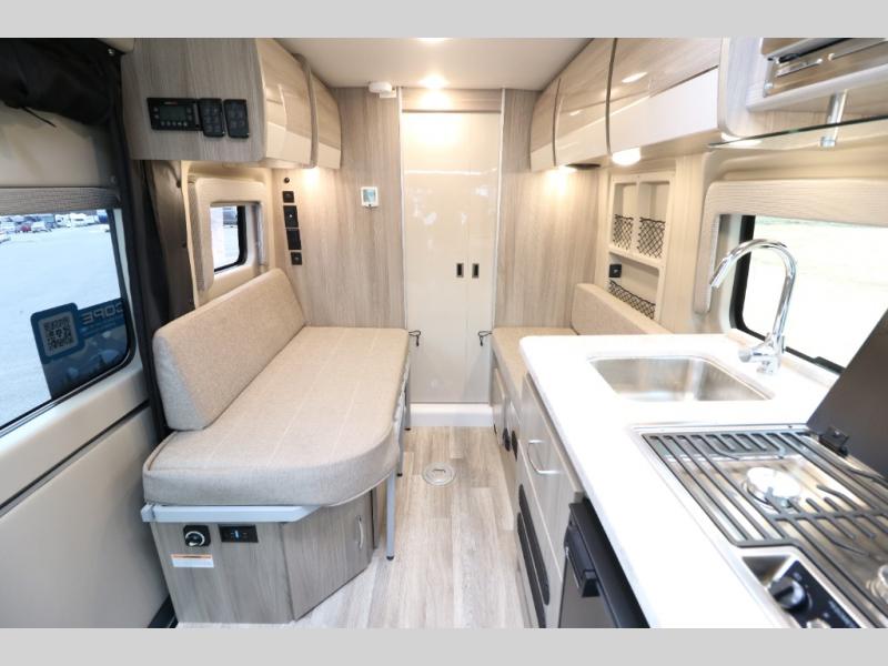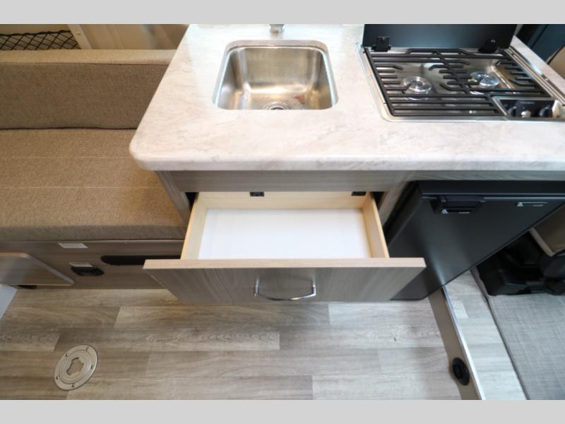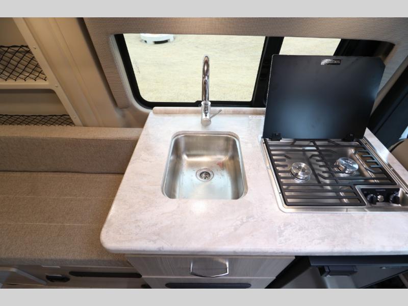 Get comfortable in this Scope Class B motorhome! The seating area includes an expanding sleeper sofa which converts to a roomy 44" x 70" bed. For additional guests, there's the option to add on the Sky Bunk™ with a retractable roof top. You'll have everything you need with the rear wet bath. The driving experience will delight you with swivel captain's chairs, touchscreen dash radio with Apple CarPlay™ & Android Auto™, keyless entry, and a telescoping steering wheel with audio buttons. You'll also appreciate the kitchen, which includes a two burner gas cooktop, microwave oven, and single door electric refrigerator. The stainless steel double bowl sink includes a cover and single handle faucet.