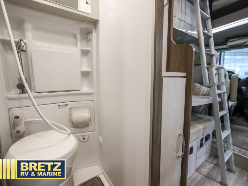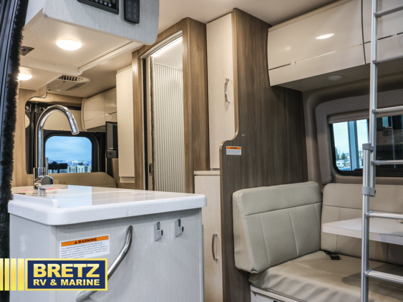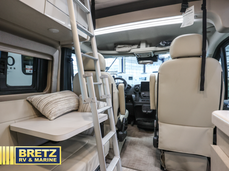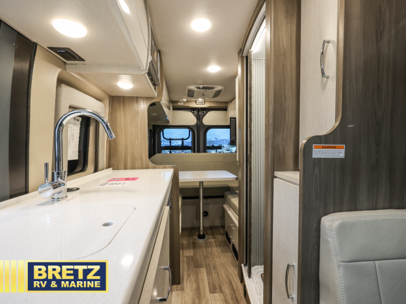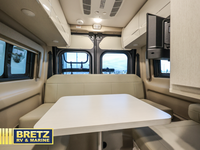 You'll want to take this Tellaro Class B gas motorhome out on the road as your permanent home when you see the comfort it provides! There is a removable table on a swing arm in front of a seating area, so you have a place to work each day. This area can also be used for dining later on in the day. The large skylight in the living area provides you with sunshine while you work, and the fully enclosed wet bathroom has a cassette toilet for easy disposal of waste. The manual rear sofa bed system is where you will spend your nights sleeping like a baby, and you even have a 24" Smart TV back here by the sofa to watch while you're lounging or resting for the night. You can easily take this coach from a two-person sleeping capacity to a three-person sleeping capacity by adding the optional retractable roof top with SkyBunk® sleeping area.