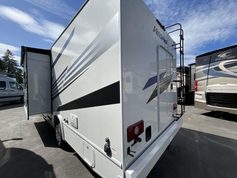 You'll find excellent drivability with the Thor Motor Coach Vegas Class A gas motorhome! These RUVs (Recreational Utility Vehicle) have been built intentionally as a short Class A RV on a Ford E-Series chassis. They allow you to set up camp with ease thanks to the Rapid Camp+ multiplex system which is your all-in-one control center. You won't even have to get up while you're outside relaxing when you want the power patio awning to extend because you can open it with the click of a button on your phone. If you hook up a grill to the exterior LP connection, you'll also have a place to cook while you're outdoors, and the 100W solar panel with a controller helps you get away from the crowds. The HD-MAX exterior with graphics package will catch everyone's eye at the campground, and the premium one-piece Crossflex roof will last through years of use.
