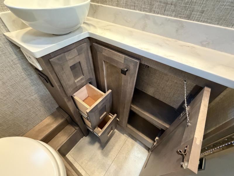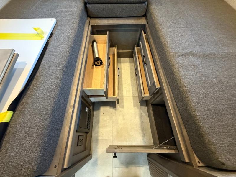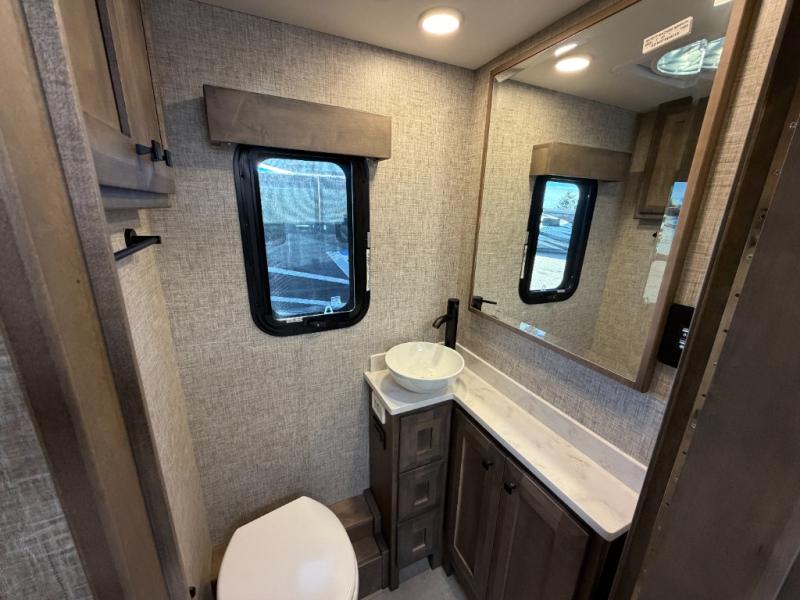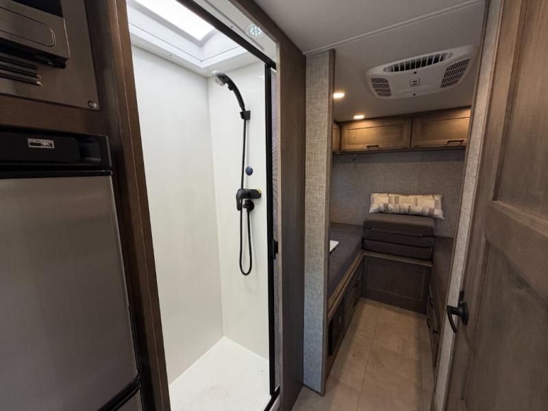 This spacious coach is perfect if you want to bring along any number of people! Twin beds in the rear can be combined to create a comfortable and roomy king bed. If you need even more sleeping space, the jump seats at the center table can convert to a day/child bed. In the kitchen area, you will appreciate the induction cooktop or use the stainless steel convection microwave, and leftovers can go in the 8 cu. ft. refrigerator. This model includes a full bath with a solid surface lavatory top, a vessel bowl porcelain sink, and a one-piece fiberglass shower. Take a seat in the black leather adjustable captain's chairs and enjoy easy access to the controls, including a multi-function touch screen AM/FM stereo with SYNC 3, Bluetooth, Smartphone integration, navigation, and dual USB ports for the ultimate driving experience!