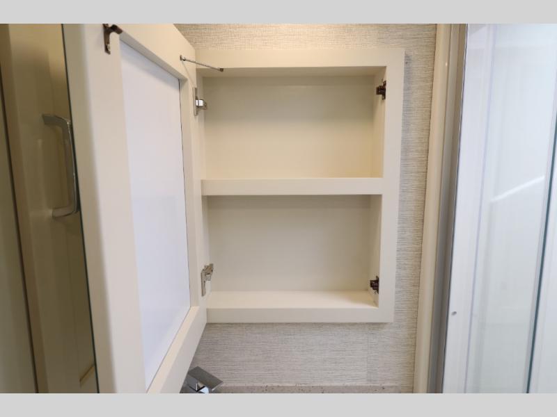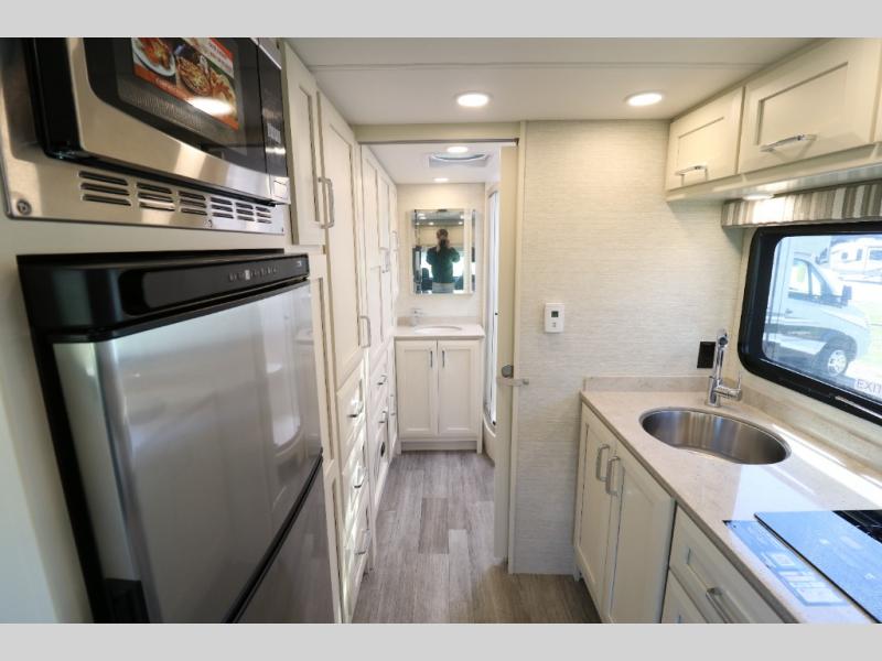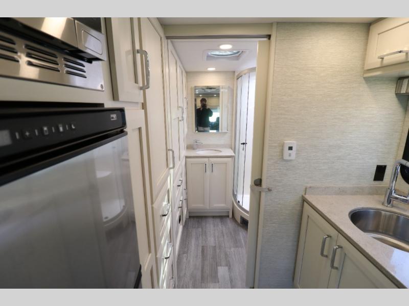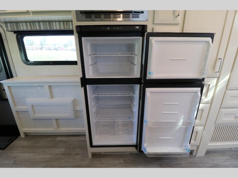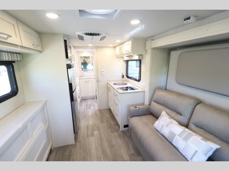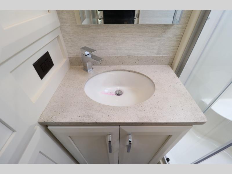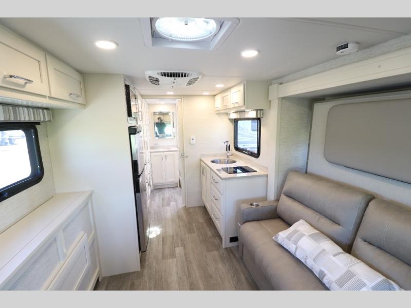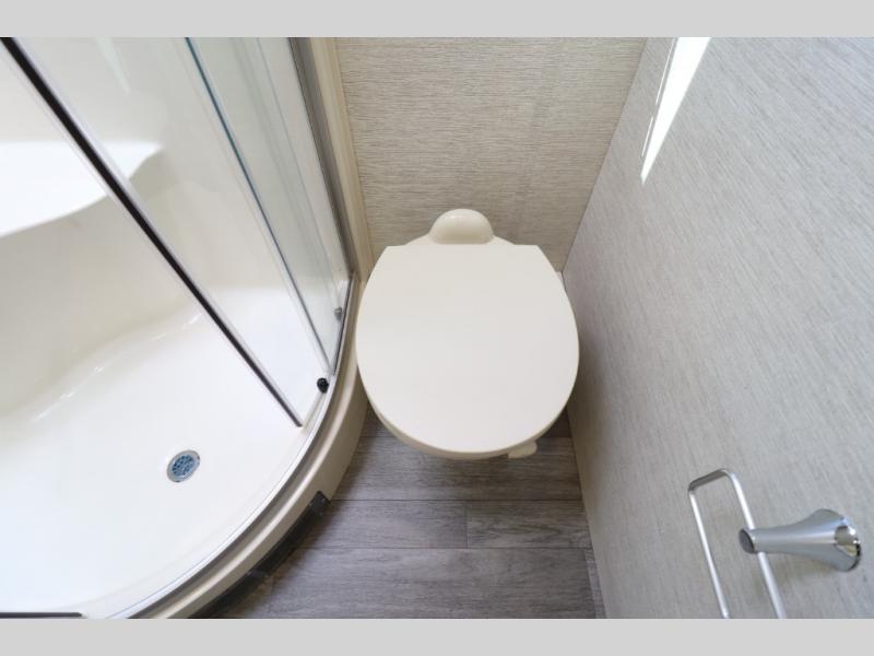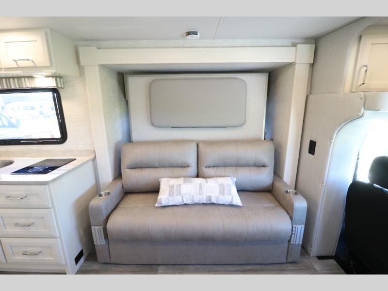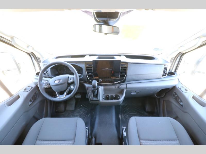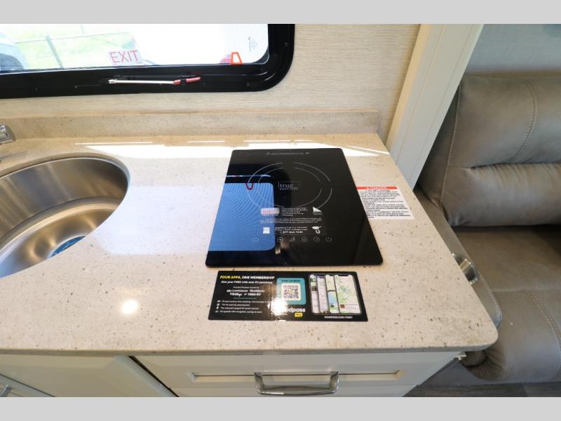 Comfort is found throughout in this spacious coach. There is a comfortable queen-sized Murphy bed to sleep on at night and a sofa to relax on during the day. You can prepare breakfast on the induction cooktop or use the stainless steel convection microwave, and leftovers can go in the 8 cu. ft. refrigerator. This model includes a full bath with a solid surface lavatory top, a roof vent fan, and a radius shower, and you'll find plenty of storage space between the two storage closets and the wardrobe! When you're ready to head to the next campground, you will enjoy the adjustable captain's seats and colored multi-function touch screen AM/FM stereo with SYNC 3, Bluetooth, navigation, and dual USB ports for the ultimate driving experience!