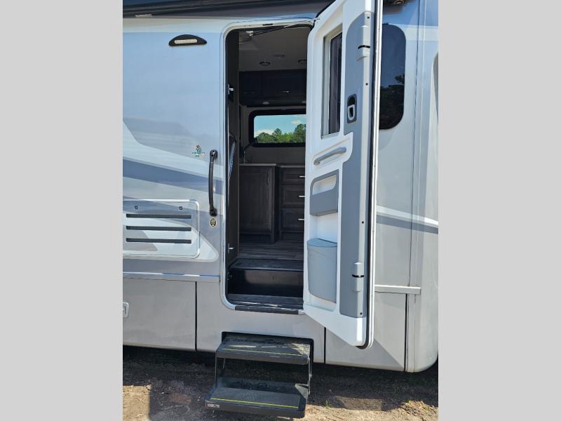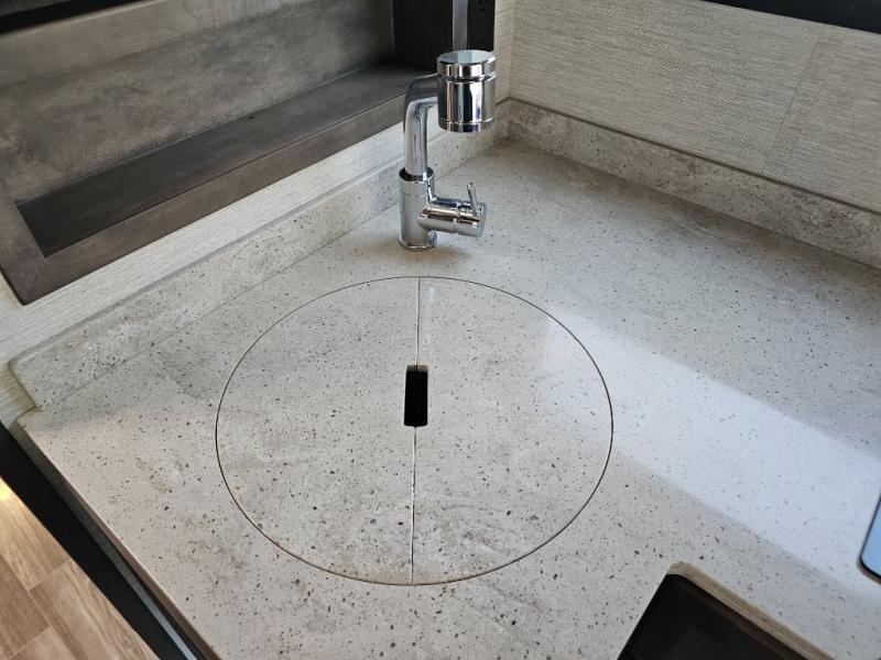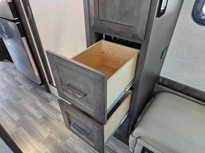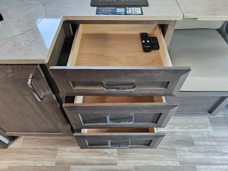 Handcrafted cabinetry and solid-surface countertops reflect Tiffin’s legendary attention to detail.