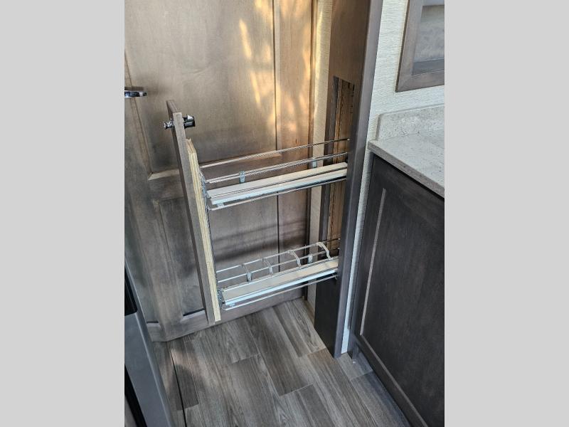 Flip-down countertop extension and kitchen pantry enhance storage and workspace.