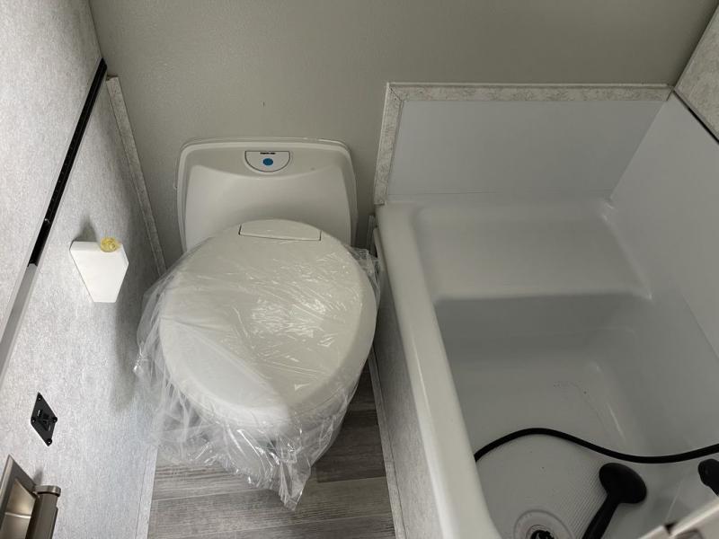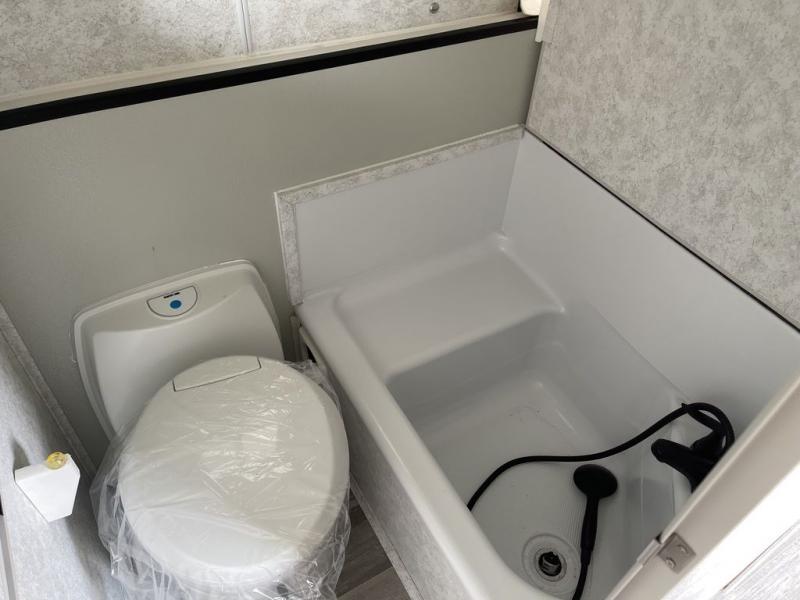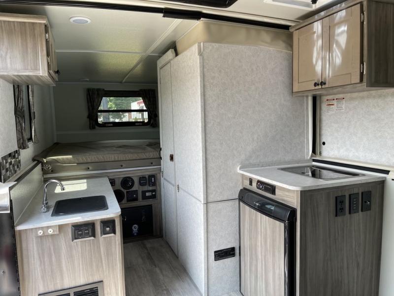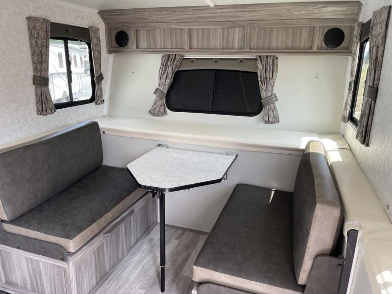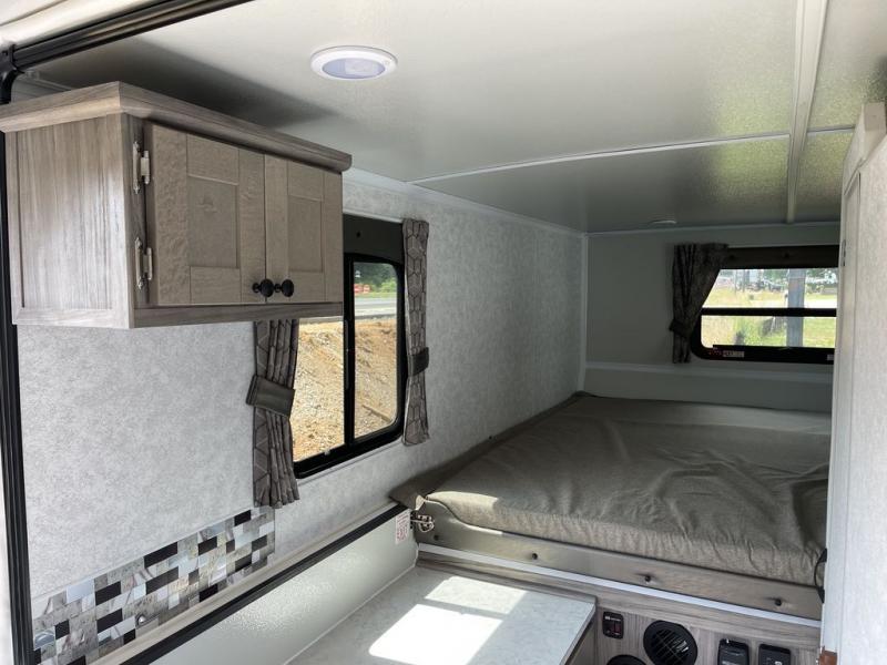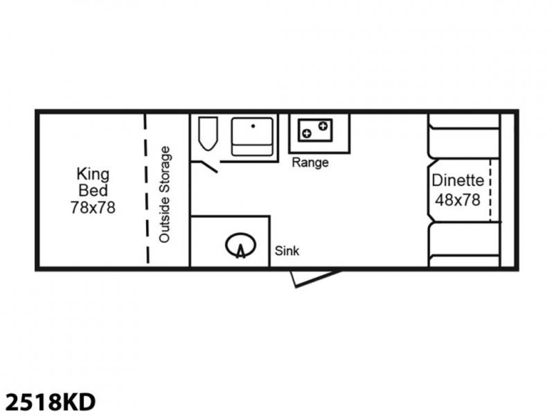 Rear King bed. Front dinette slide with 42"x78" convertible dinette that sleeps up to two. Bath with shower and Cassette toilet. When opened up the total length is 25'. Closed length is 18'. Open height is 118", towing height is 82". Tongue weight is 320 lbs..