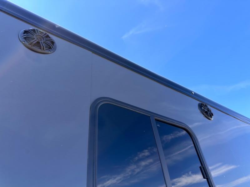 Inside you will see a bench with seats, 4 bunks, and a coach. You will also see kicker speakers and a subwoofer, a bathroom toilet/shower combo.
