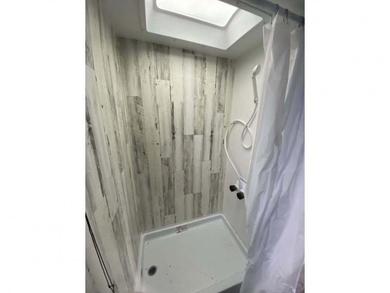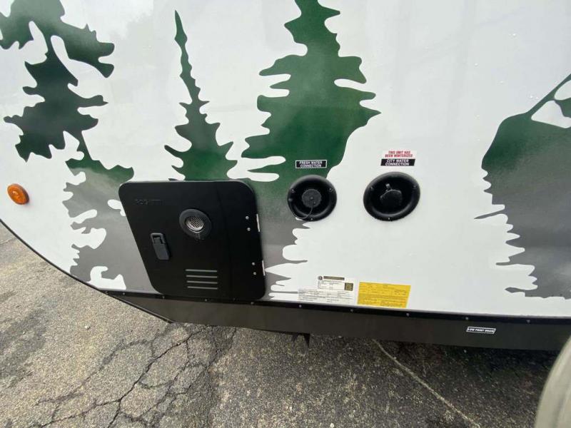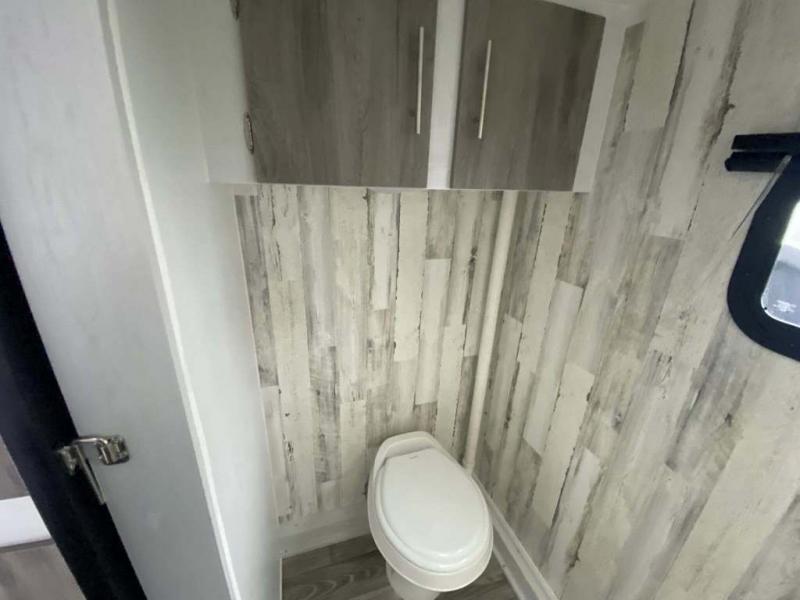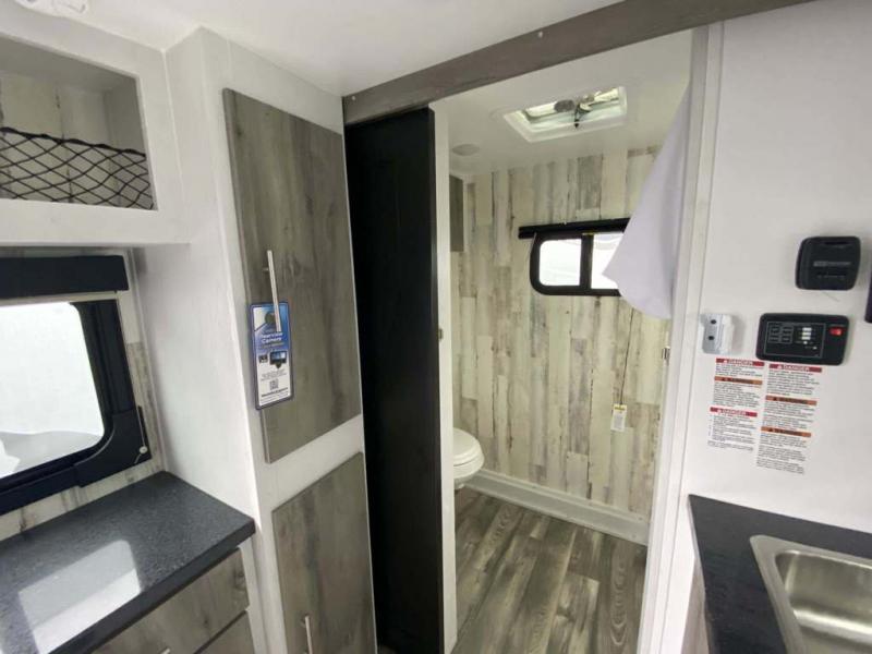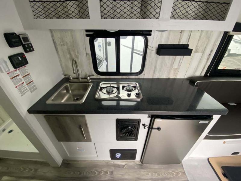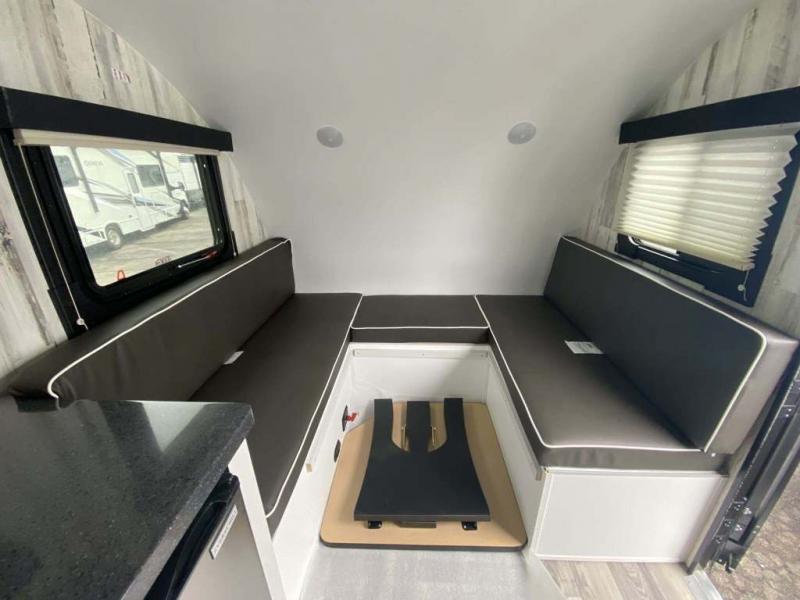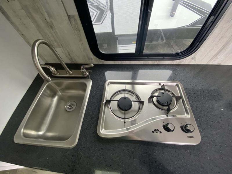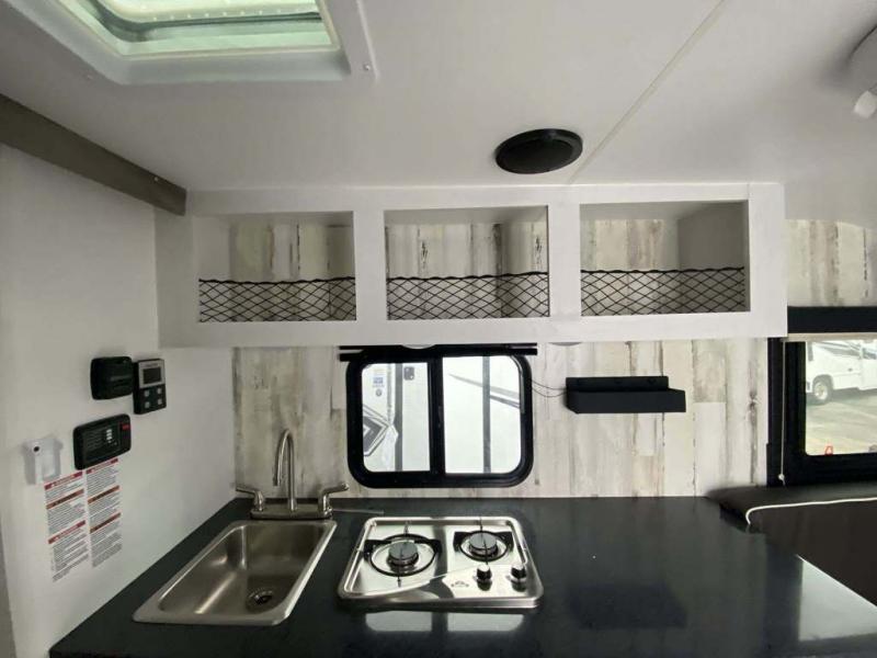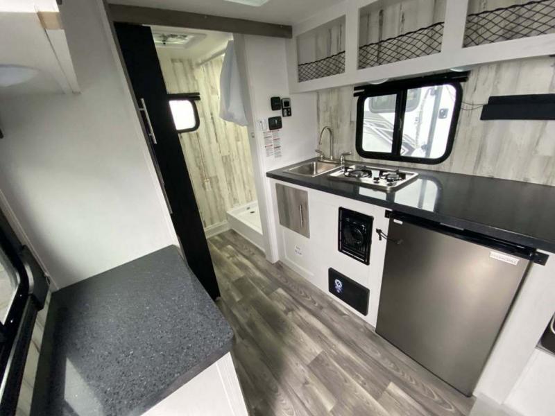 This Rove Lite can be the perfect couples adventure companion when you love the outdoors! This unit features a front booth dinette that transforms into a 54" x 74" bed to sleep on at night. There is also a full rear dry bath including a 24" x 36" shower and toilet with overhead storage for your towels and toiletries. A 13" x 15" sink is just outside the space saving sliding barn door for convenience. You will easily be able to whip up a meal or snacks with the two-burner cooktop, plenty of counter space, and a 3.3 cu. ft. 12V refrigerator for your perishables. There is storage throughout the inside for your camping necessities with several overhead cabinets and a pantry.