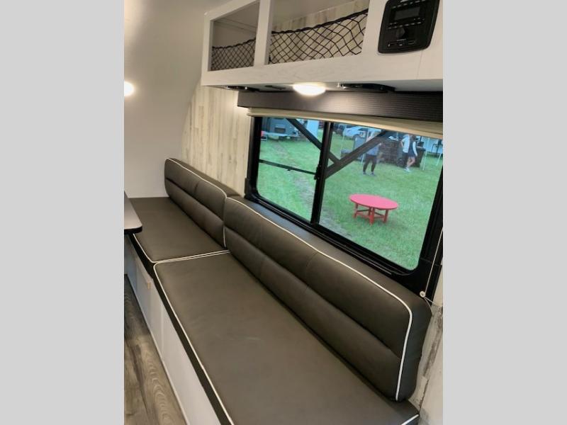 You will have everything you need for a comfortable camping trip in this travel trailer! It features a front booth dinette that transforms into a 54" x 74" bed to sleep on at night. There is storage throughout the inside for your camping necessities between the overhead cabinets and the base cabinet. The fully equipped kitchen has a 3.3 cu. ft. 12V refrigerator below a solid surface countertop, and a two burner cooktop, and a single bowl stainless steel sink for easy clean up. Rinse off each night in the rear corner wet bathroom or you can even rinse off your feet with the outside shower!