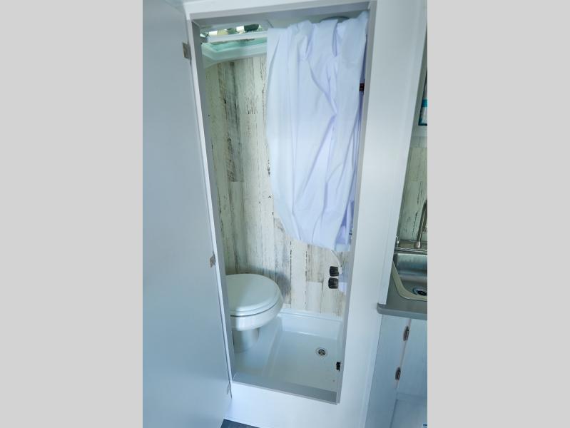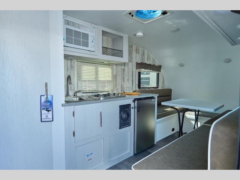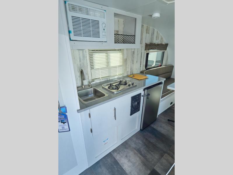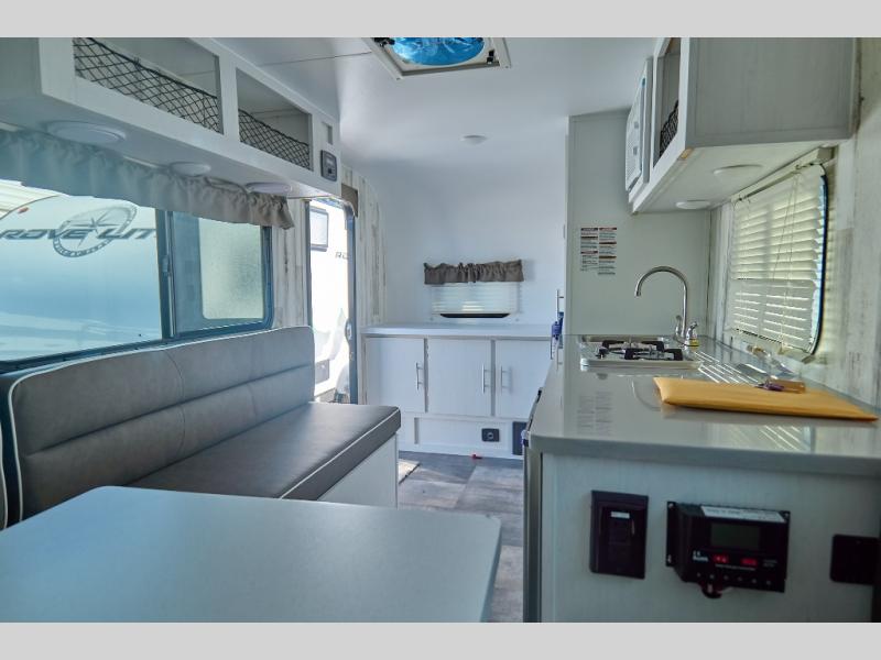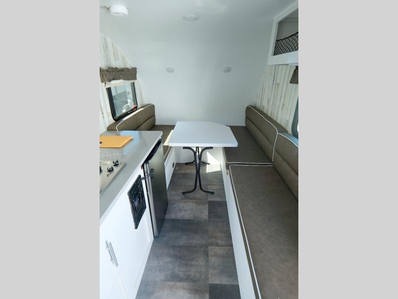 You will have everything you need for a comfortable camping trip in this travel trailer! It features a front booth dinette that transforms into a 54" x 74" bed to sleep on at night. There is storage throughout the inside for your camping necessities between the overhead cabinets and the base cabinet. The fully equipped kitchen has a 3.3 cu. ft. 12V refrigerator below a solid surface countertop, and a two-burner cooktop, and a single bowl stainless steel sink for easy clean up. Rinse off each night in the rear corner wet bath after a day outdoors!