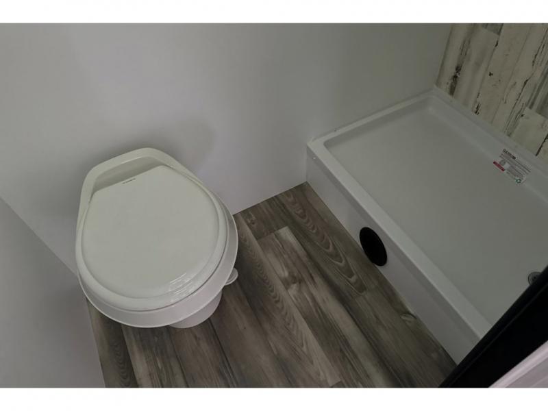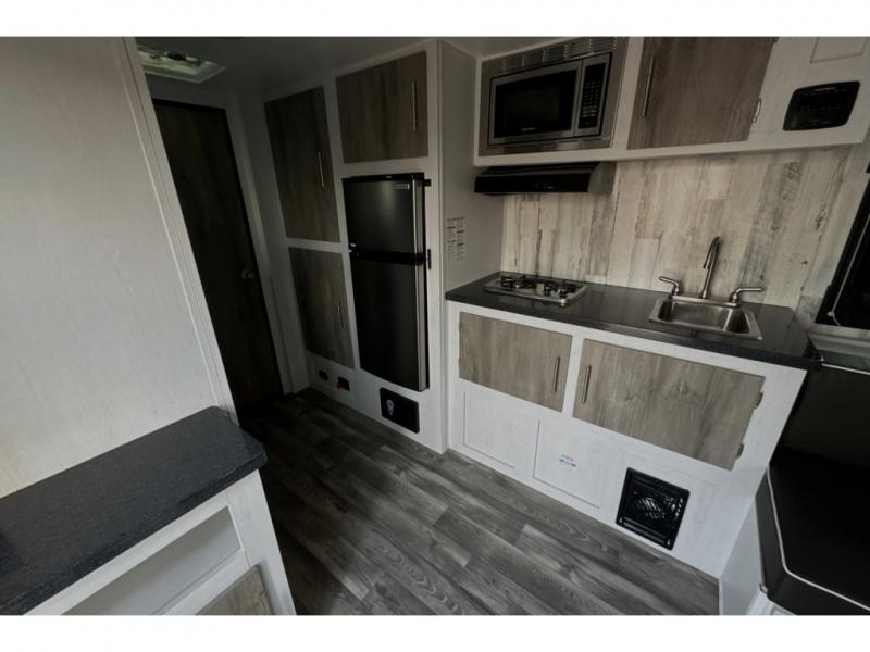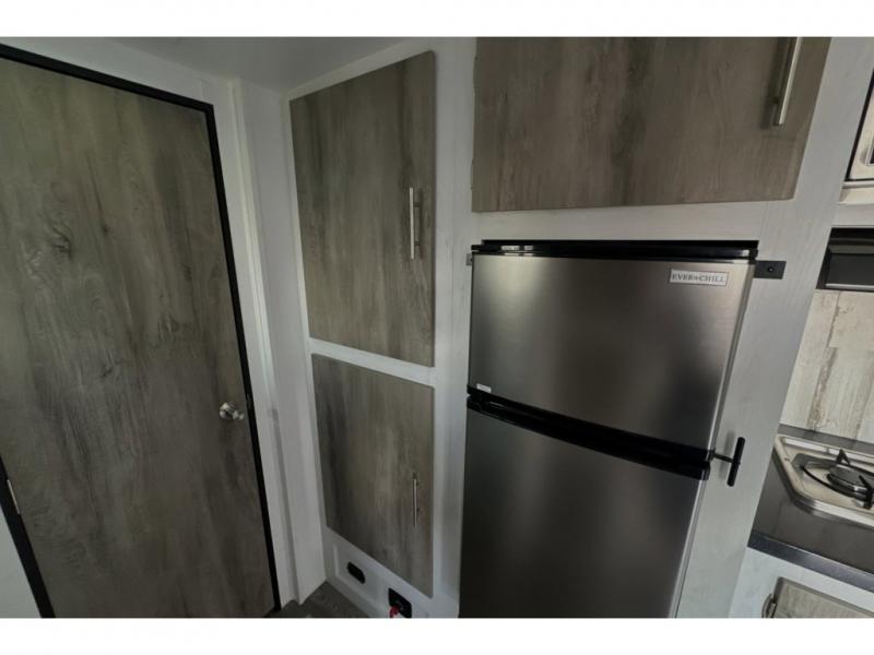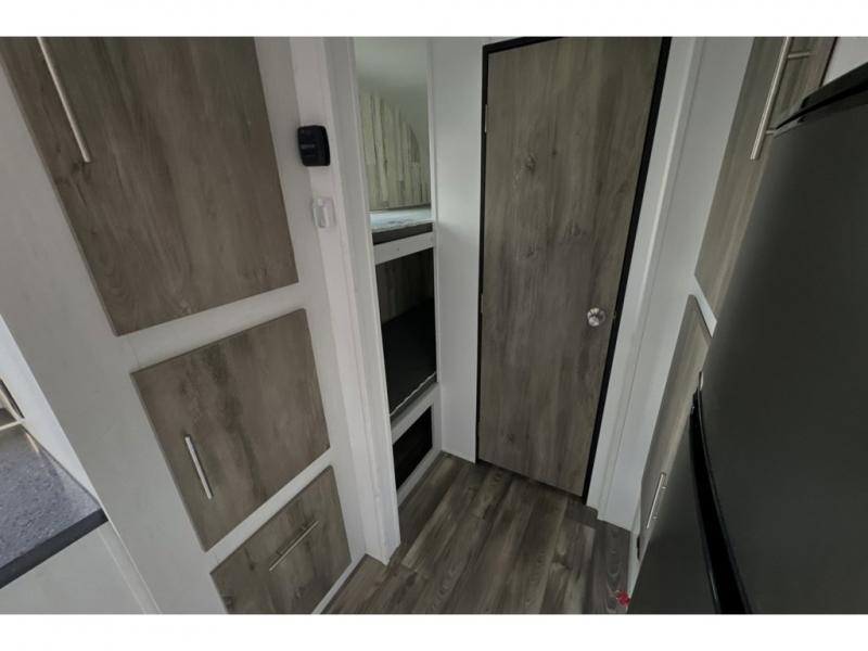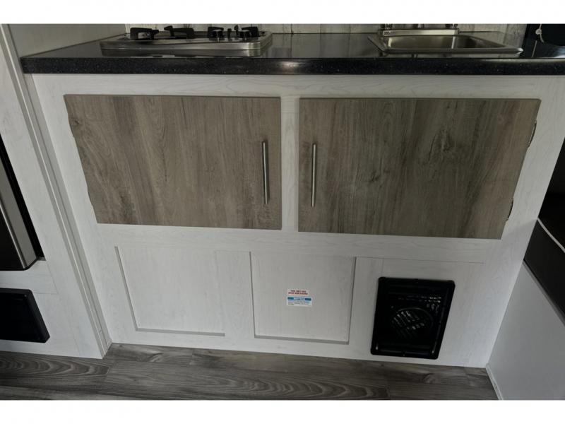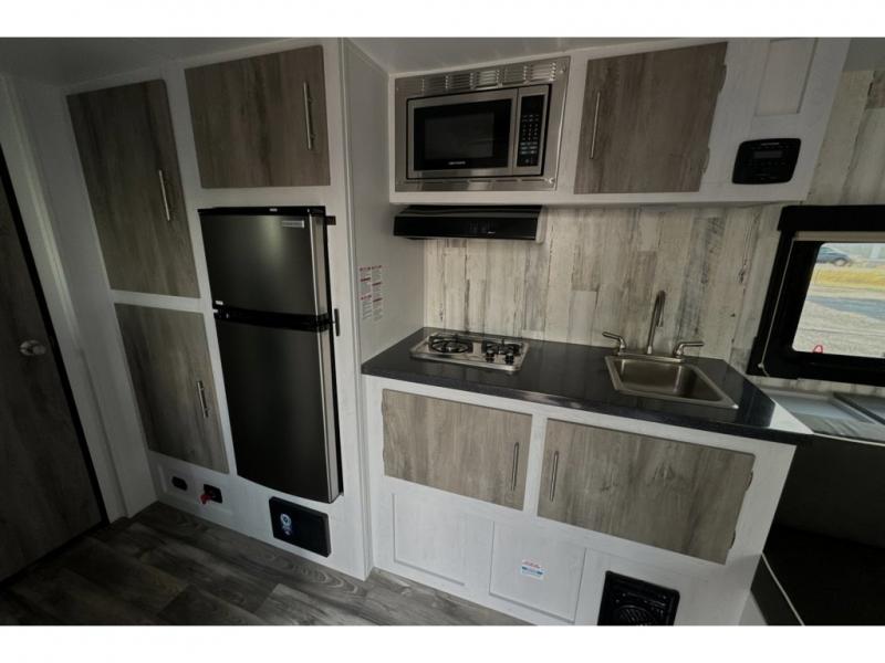 Weekends at the campground are made easy with this travel trailer that can sleep four each night. Once you've unpacked your things, you can stretch your legs around the camp, then head inside to make lunch. You'll find a two burner stainless steel cooktop in the kitchen, along with a 12V refrigerator and a pantry for food storage. There is also a closet with a pull out trash can below that will be perfect to keep cleaning supplies or paper goods in. When it's time to turn in for the night, there are 28" x 72" bunk beds that share the rear of this unit with the private bath, plus a front booth dinette that can convert to a queen-size sleeping space. This travel trailer also includes plenty of storage space, including storage shelves in the bath and above the dinette!