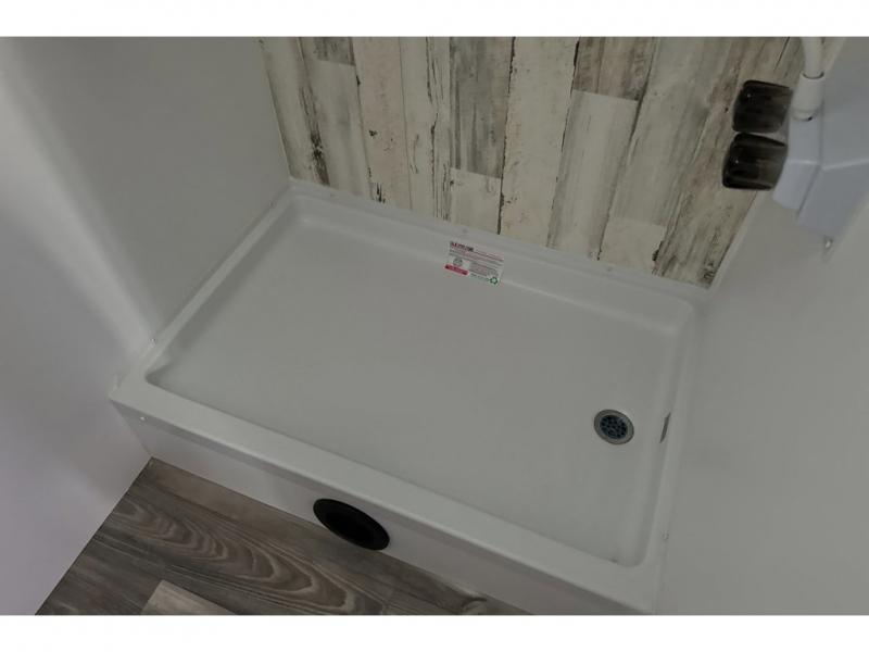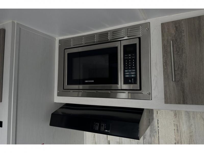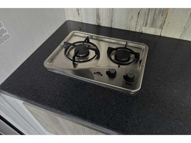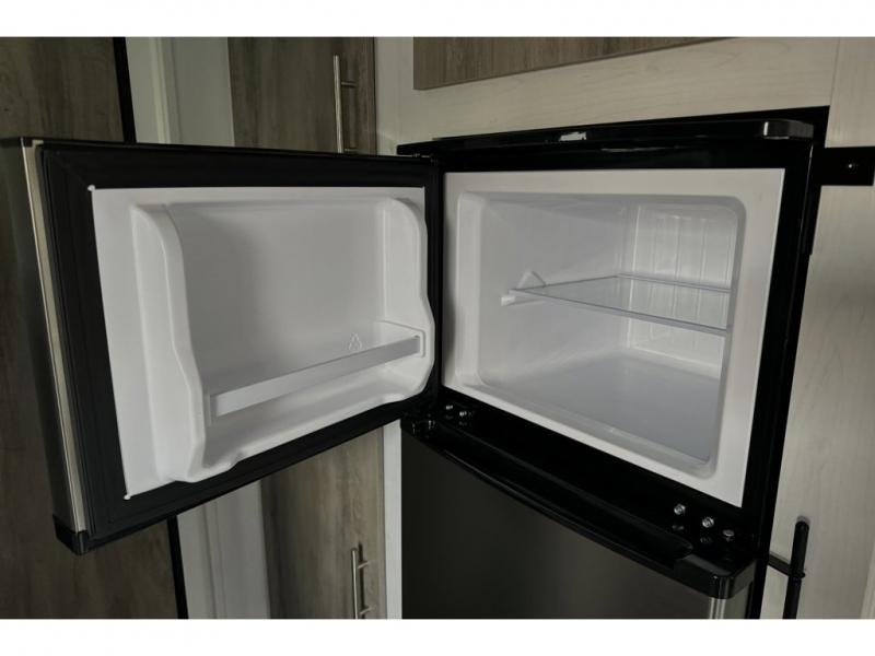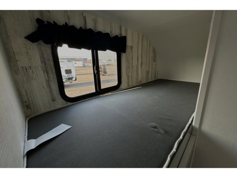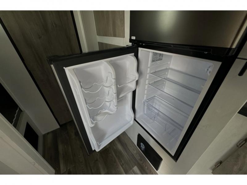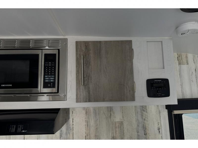 Weekends at the campground are made easy with this travel trailer that can sleep four each night. Once you've unpacked your things, you can stretch your legs around the camp, then head inside to make lunch. You'll find a two burner stainless steel cooktop in the kitchen, along with a 12V refrigerator and a pantry for food storage. There is also a closet with a pull out trash can below that will be perfect to keep cleaning supplies or paper goods in. When it's time to turn in for the night, there are 28" x 72" bunk beds that share the rear of this unit with the private bath, plus a front booth dinette that can convert to a queen-size sleeping space. This travel trailer also includes plenty of storage space, including storage shelves in the bath and above the dinette!