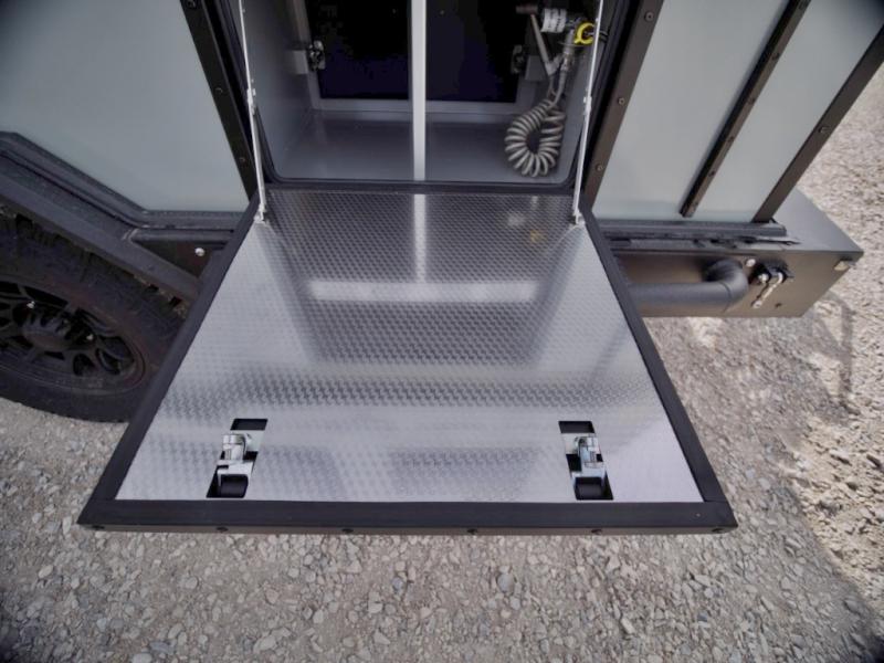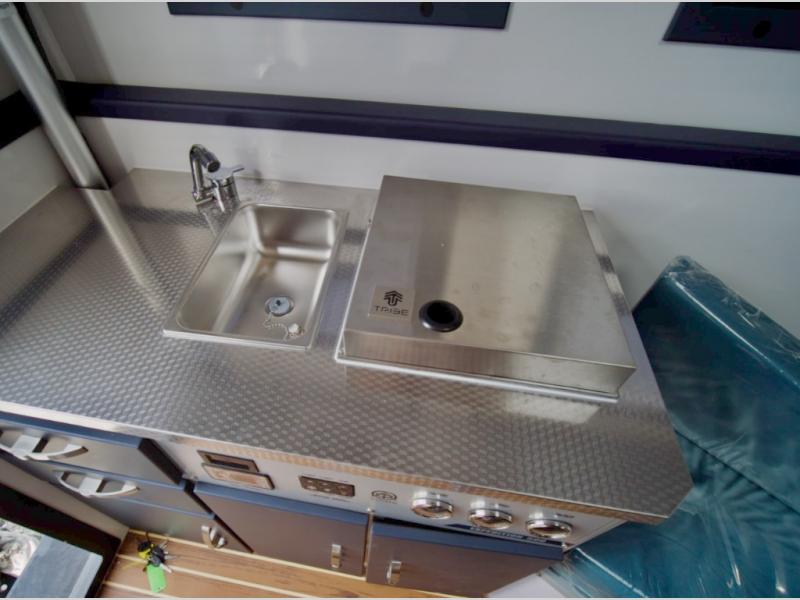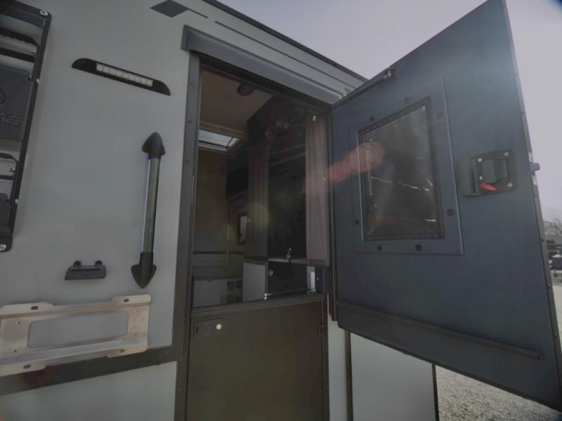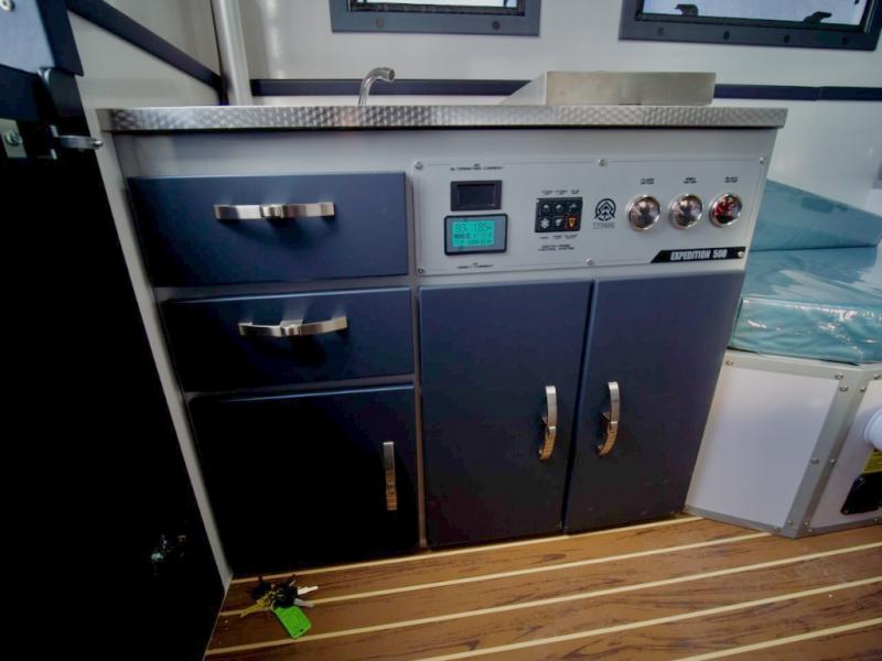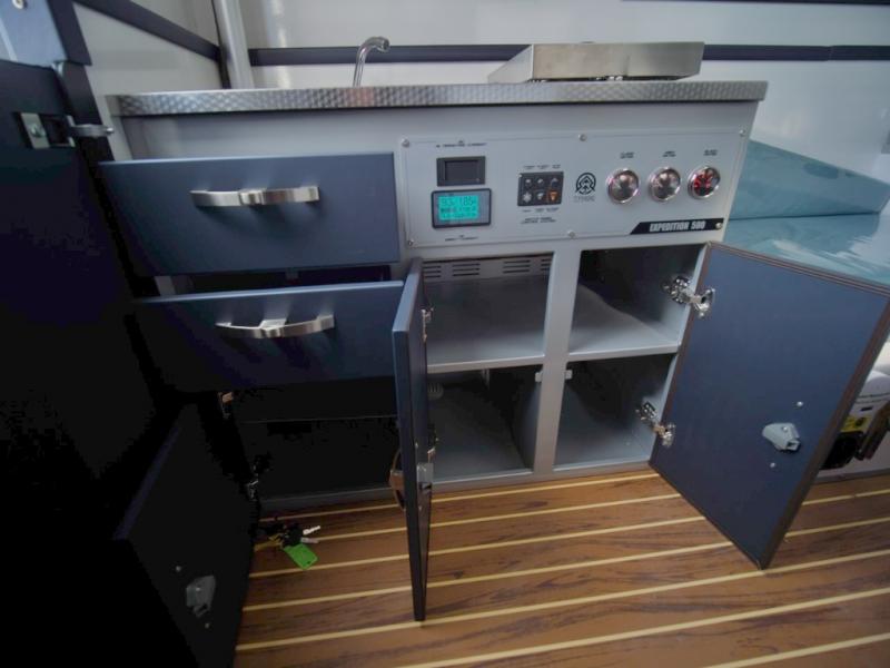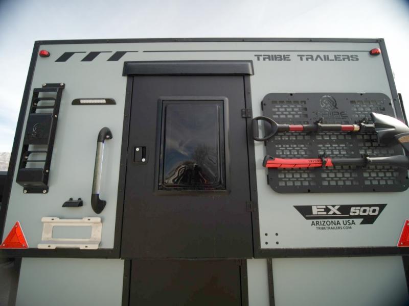 The exterior of the Tribe Expedition 500 is engineered for rugged durability and versatility. Its hard-sided pop-up design ensures a low profile for easy towing and expands to provide ample space when at camp. The independent A-arm and air-ride suspension system allow the trailer to handle heavy-duty off-roading while maintaining suitability for smooth on-road towing. This robust construction ensures that the Expedition 500 can follow your vehicle across the toughest terrains. The camper also features outdoor kitchen units, providing a convenient and enjoyable cooking experience in the great outdoors.