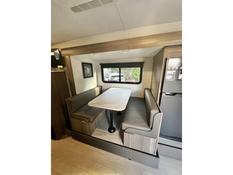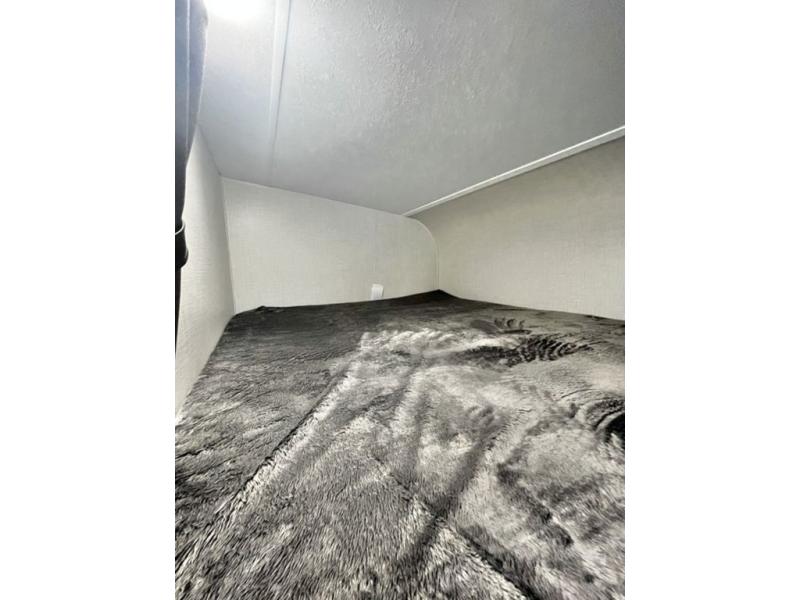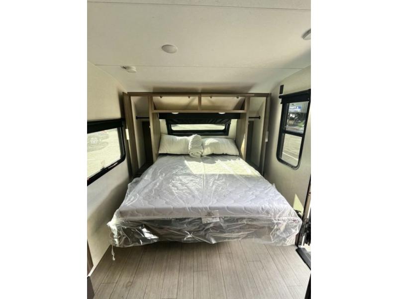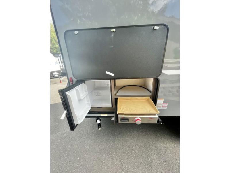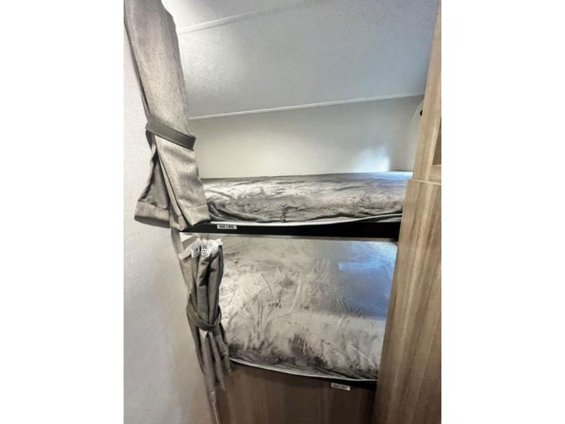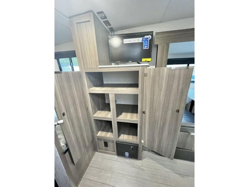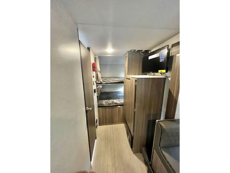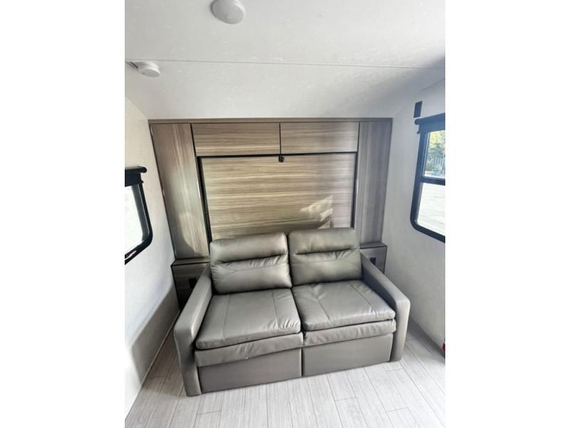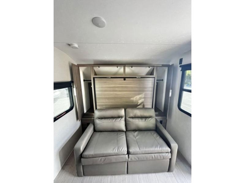 You and your larger group of eight can sleep comfortably in this travel trailer thanks to the Murphy bed up front, the double-size bunks in the rear and the 65" x 48" booth dinette! As the owner you will have the Murphy bed with StorMore bedside nightstands with a 110V outlet and USB charging to keep your phone ready for whatever is next, and the sofa provides a living area up front once the bed is put up into the wall. Your kids or guests will have 48" x 88" bunks and a wardrobe to place their things on the opposite side of the trailer. The cook can make warm meals in the kitchen or outside on the campfire café, and then choose to dine inside at the booth dinette or outside under the 14' power awning after grabbing your camping chairs from the exterior pass-through storage with motion-activated light.