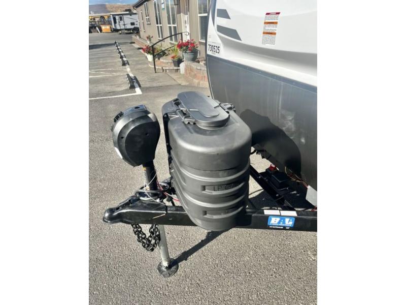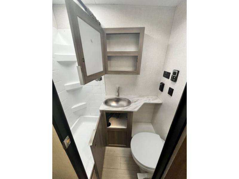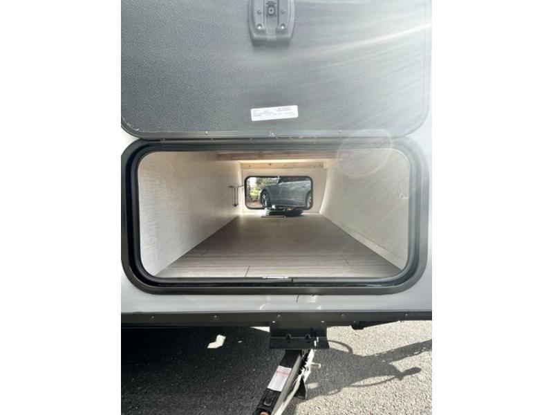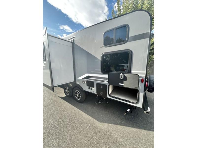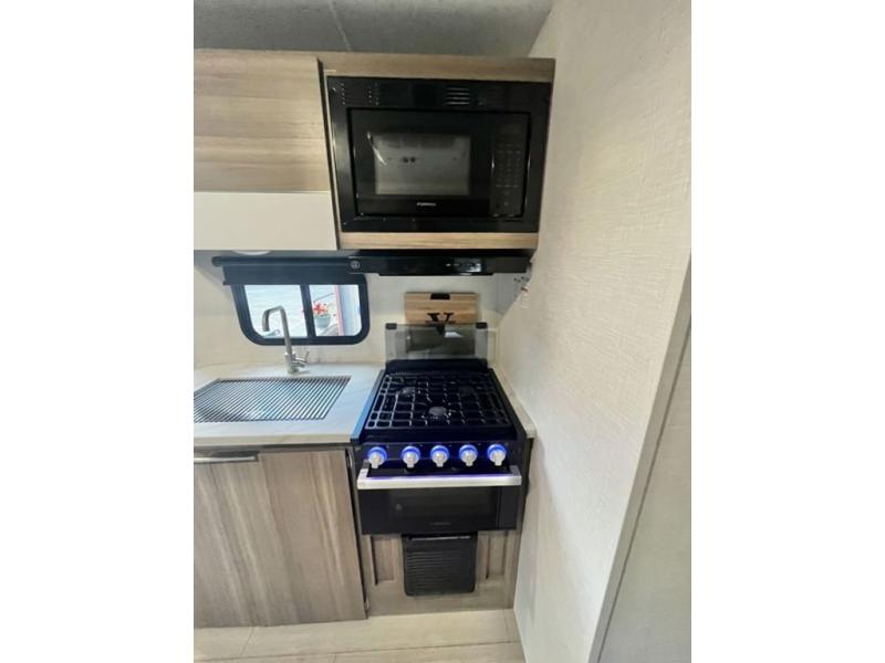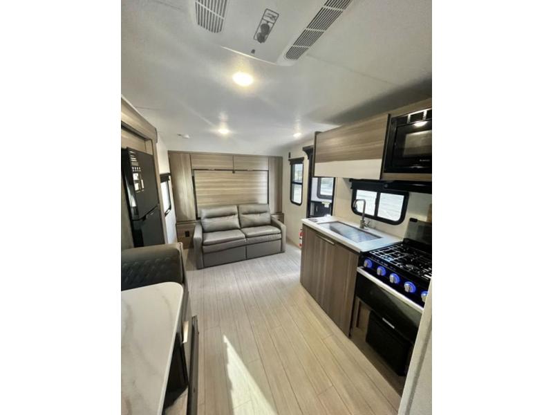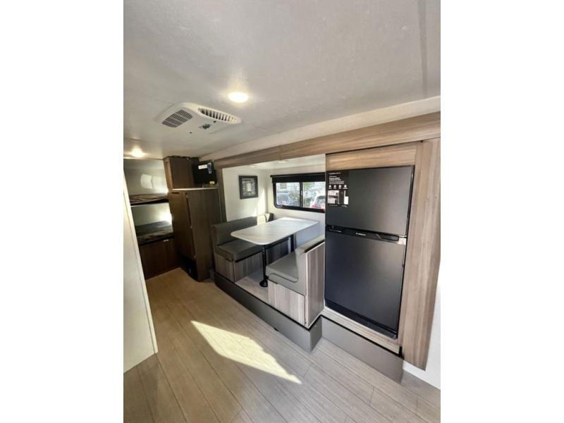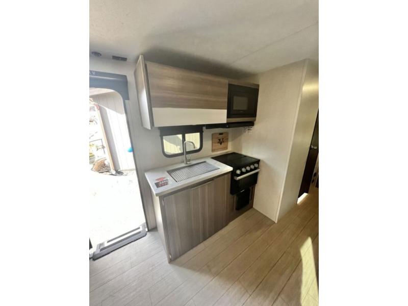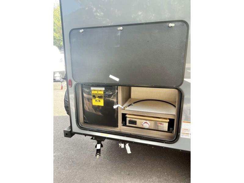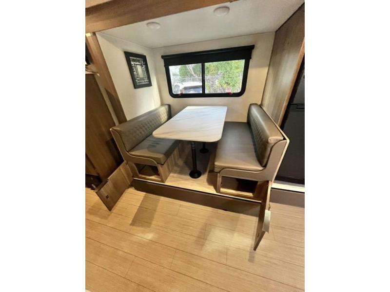You and your larger group of eight can sleep comfortably in this travel trailer thanks to the Murphy bed up front, the double-size bunks in the rear and the 65" x 48" booth dinette! As the owner you will have the Murphy bed with StorMore bedside nightstands with a 110V outlet and USB charging to keep your phone ready for whatever is next, and the sofa provides a living area up front once the bed is put up into the wall. Your kids or guests will have 48" x 88" bunks and a wardrobe to place their things on the opposite side of the trailer. The cook can make warm meals in the kitchen or outside on the campfire café, and then choose to dine inside at the booth dinette or outside under the 14' power awning after grabbing your camping chairs from the exterior pass-through storage with motion-activated light.