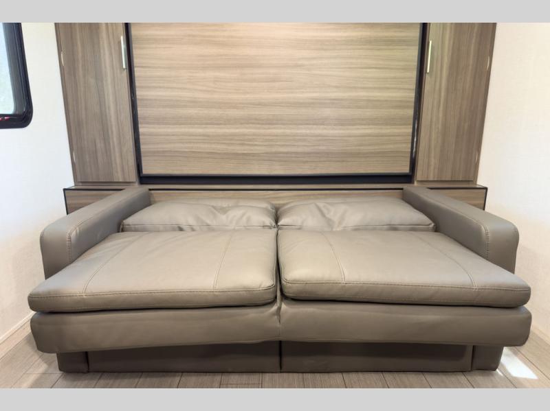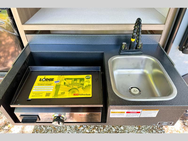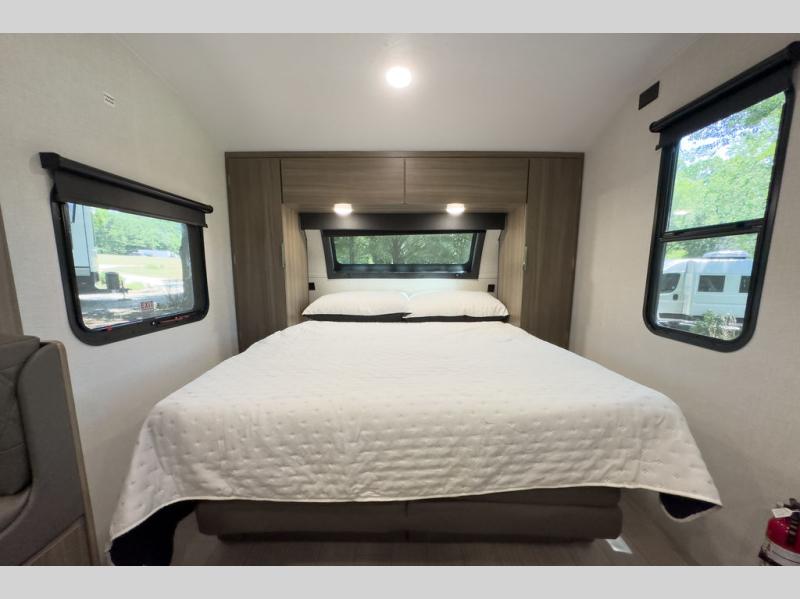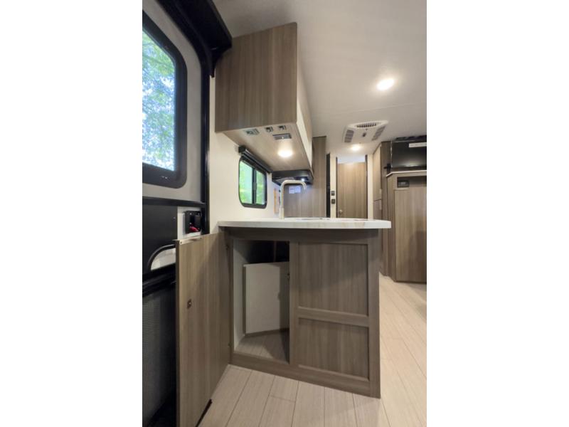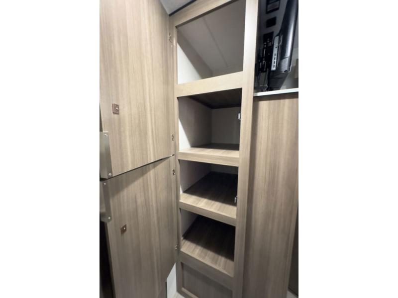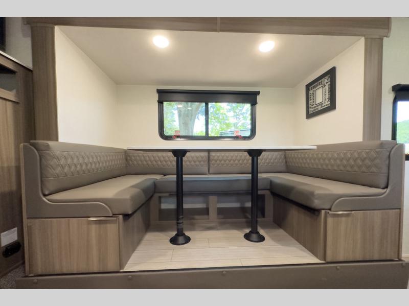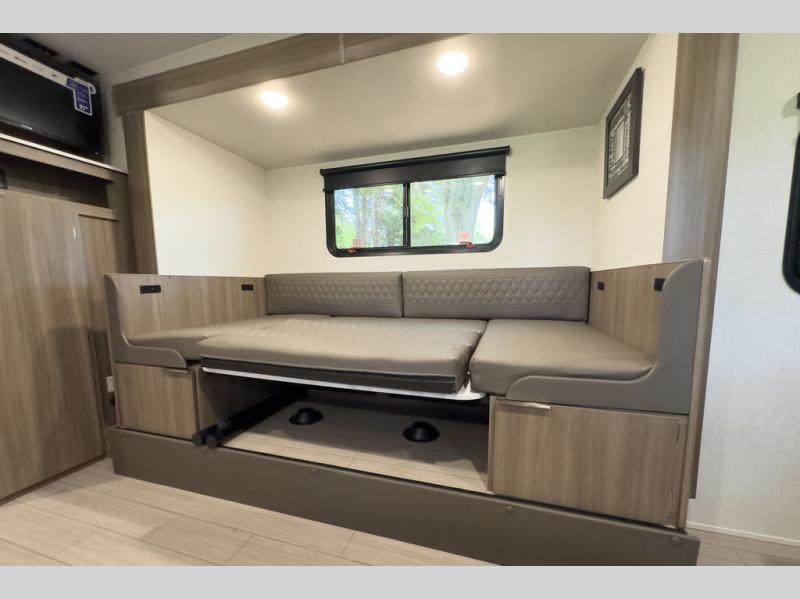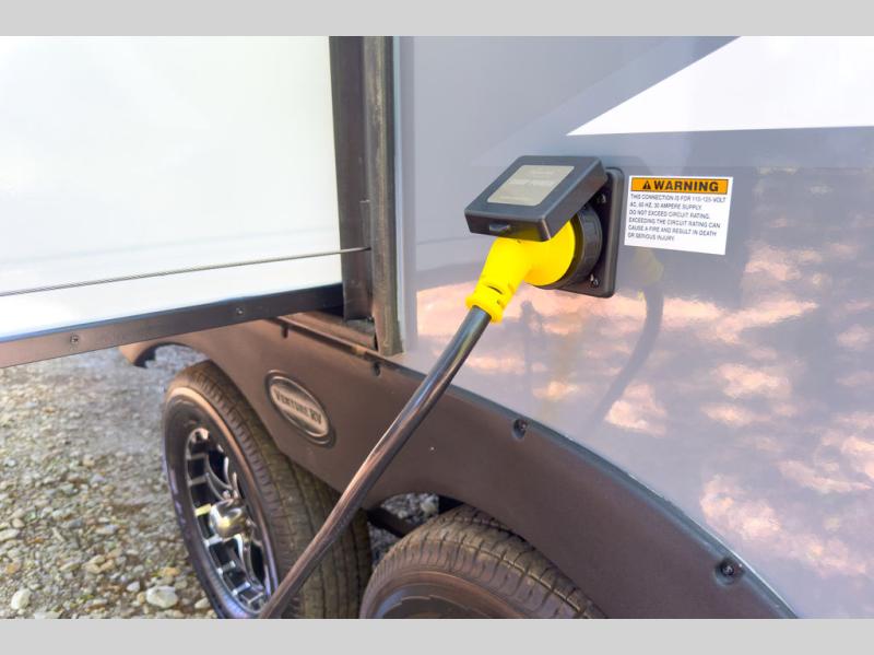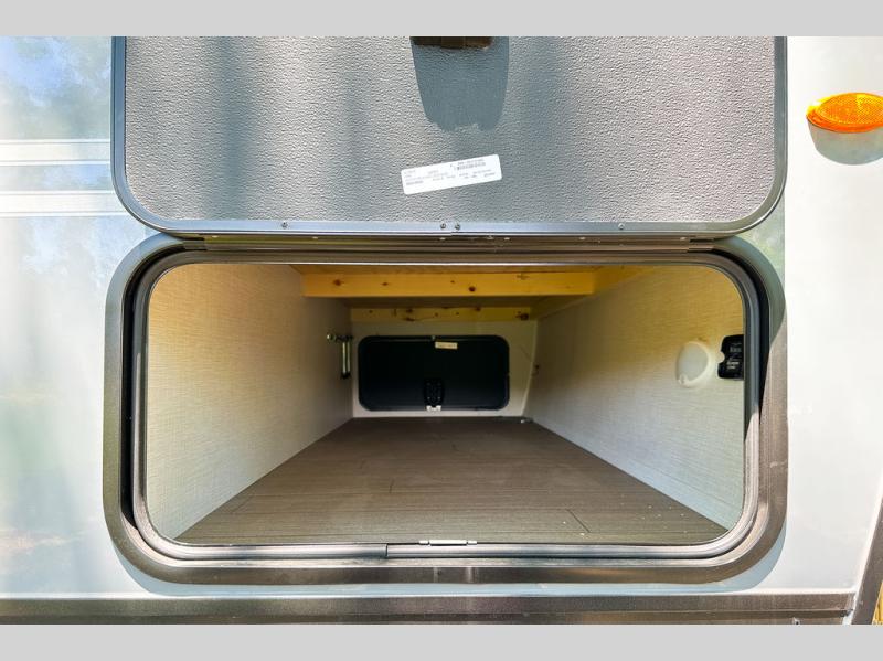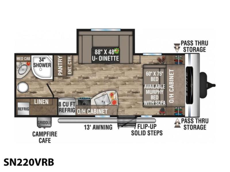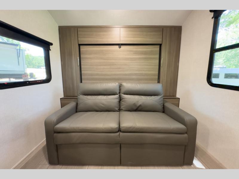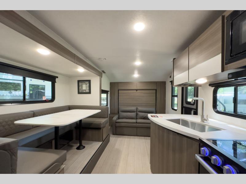 A cook will love this trailer with the choice to make meals inside with full amenities including an 8 cu. ft. refrigerator and a pantry, or outside while using the campfire cafe which offers a griddle and refrigerator, plus counter space to prepare and serve meals. There is sleeping space for four when you utilize the U-shaped dinette slide out that also provides more interior floor space along with the versatile Murphy bed and sofa up front. You will also find a privacy curtain that will section off this area that also features StorMore bedside nightstands with a 110V outlet and USB charging, and two wardrobes.