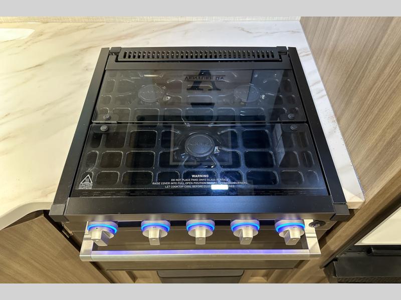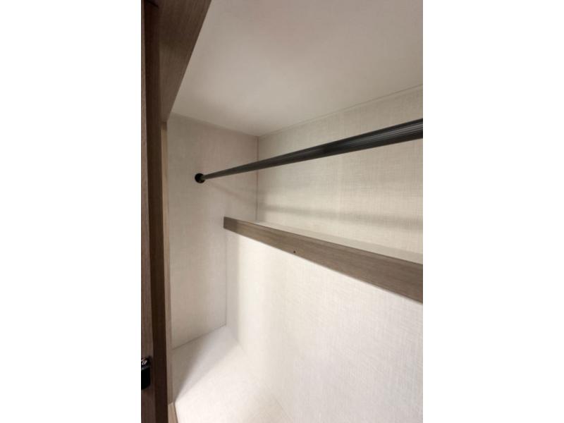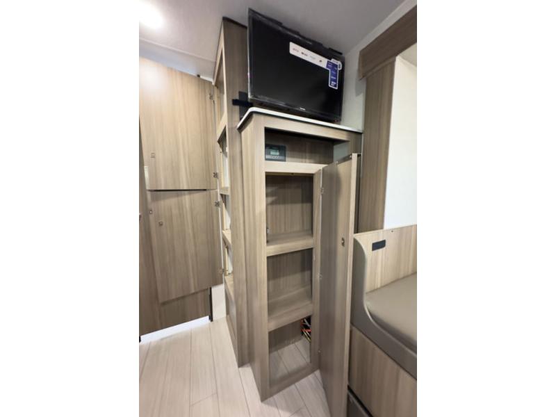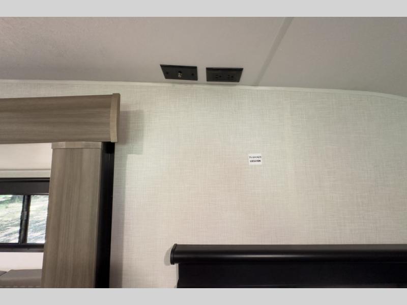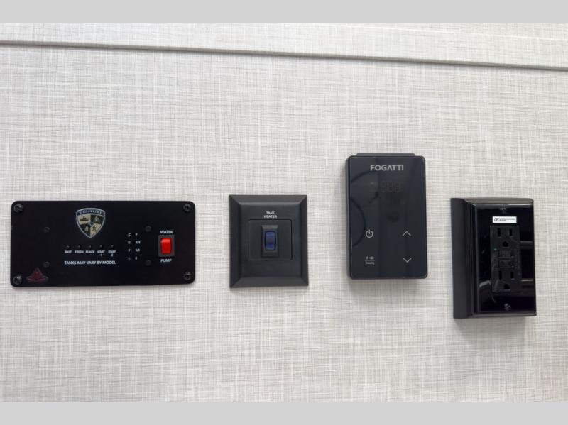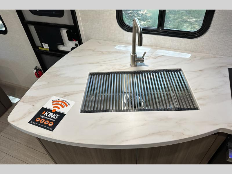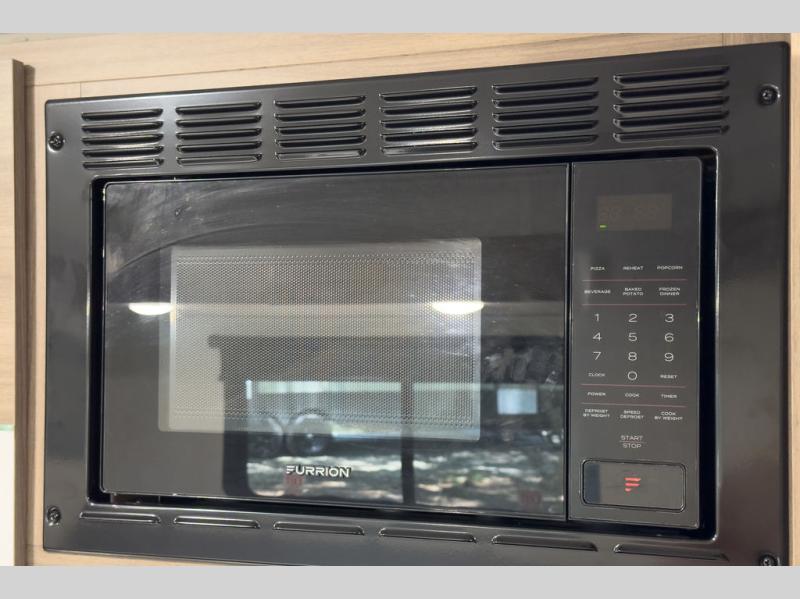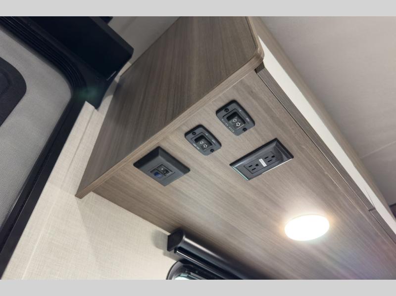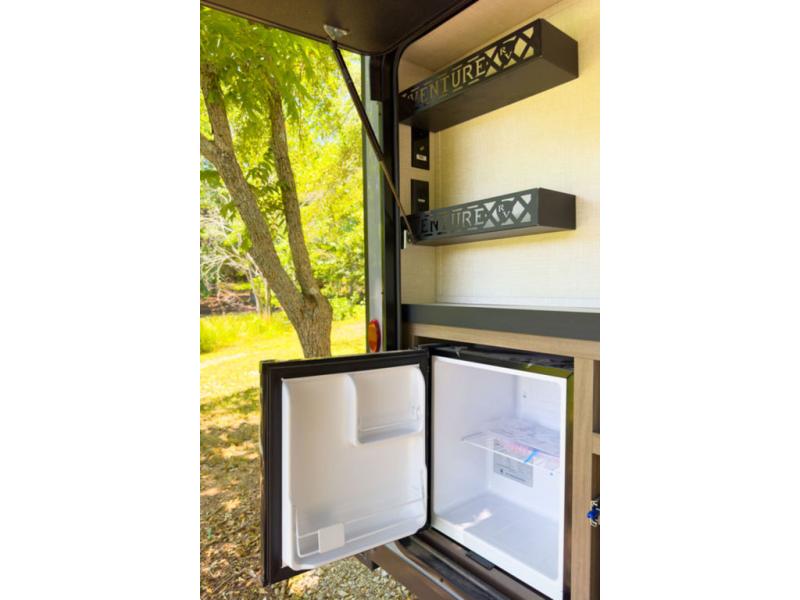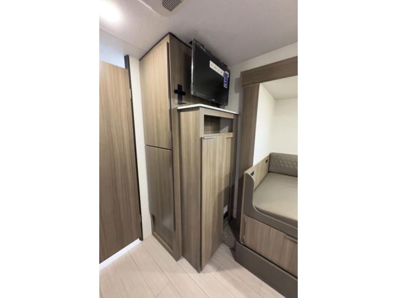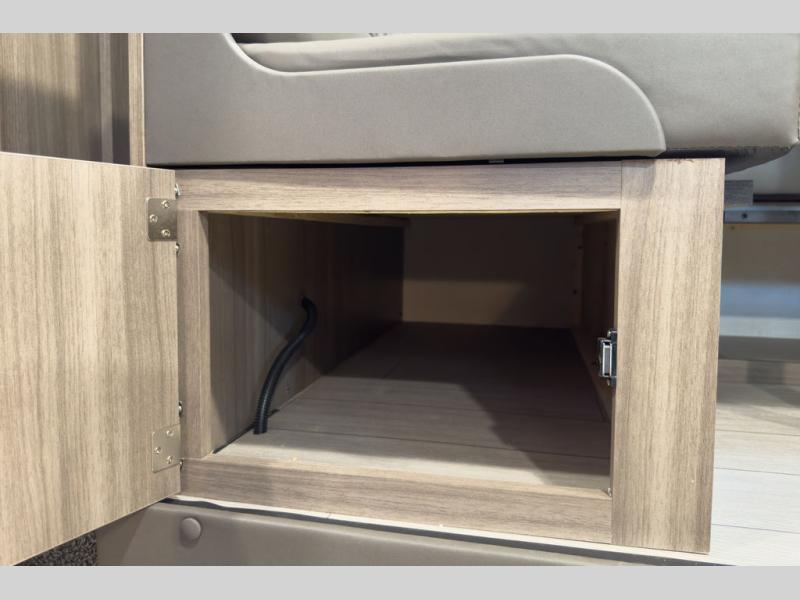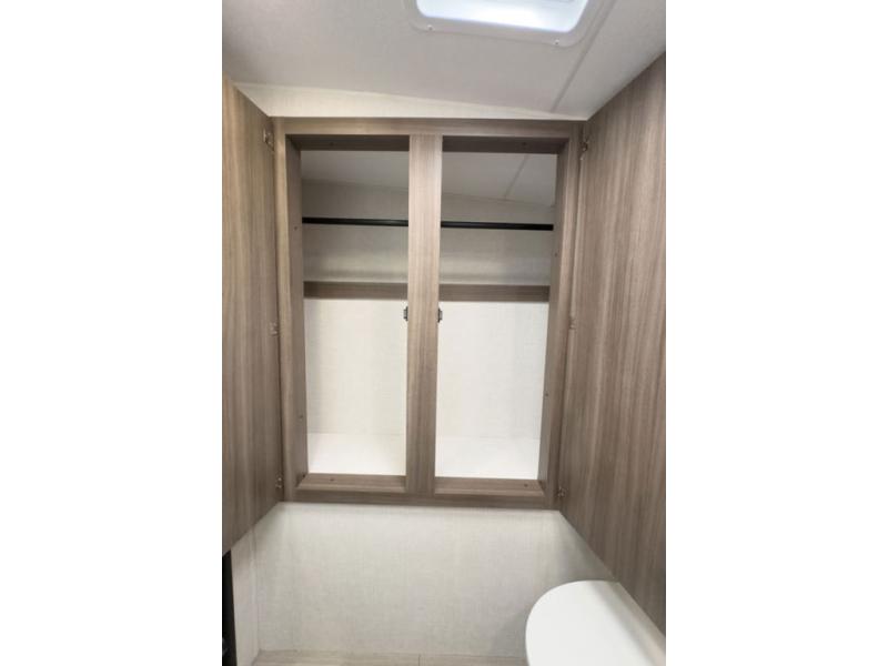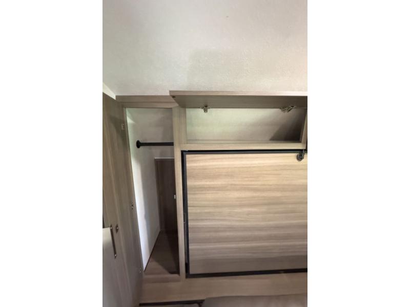 A cook will love this trailer with the choice to make meals inside with full amenities including an 8 cu. ft. refrigerator and a pantry, or outside while using the campfire cafe which offers a griddle and refrigerator, plus counter space to prepare and serve meals. There is sleeping space for four when you utilize the U-shaped dinette slide out that also provides more interior floor space along with the versatile Murphy bed and sofa up front. You will also find a privacy curtain that will section off this area that also features StorMore bedside nightstands with a 110V outlet and USB charging, and two wardrobes.