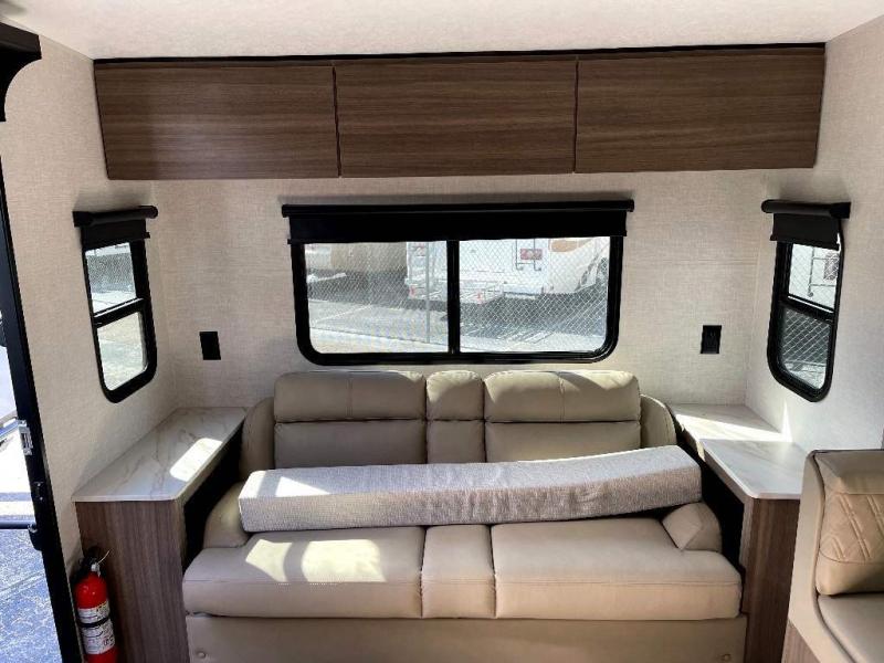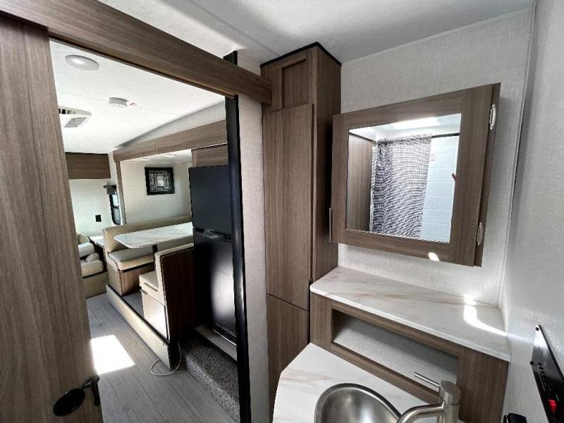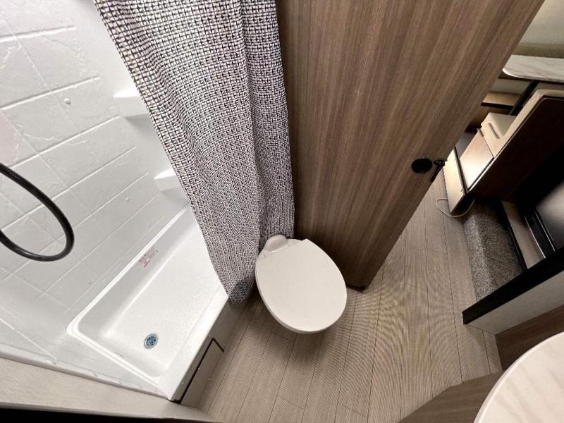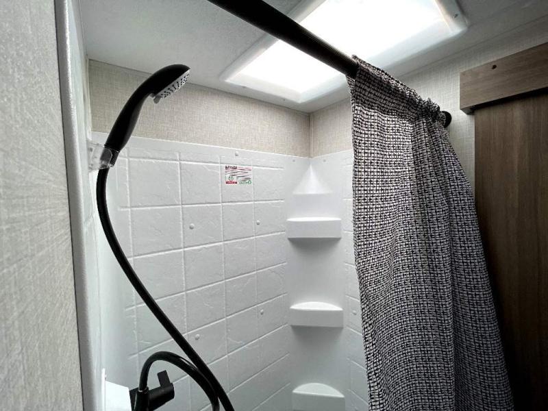Looking for privacy when you camp? Do you enjoy dining at a booth dinette when you are staying in an RV? This Sonic provides all of that plus more! Starting with the private bedroom with an RV queen bed, StorMore bedside nightstands with a 110V outlet and USB charging to keep the electronics ready, dual wardrobes, and access to the walk-through bathroom through a space savings sliding door. The second entry to the walk-through bath is in the main living and kitchen area where you will find a 65" x 48" booth dinette and an 8 cu. ft. refrigerator slide out for more interior floor space, an L-shaped countertop with a large sink and kitchen amenities, plus an entertainment center and a 64" jiffy sofa. And the furniture doubles as extra sleeping space when needed. Don't forget about the 17' power awning offering an outdoor living area, just add your camp chairs.
