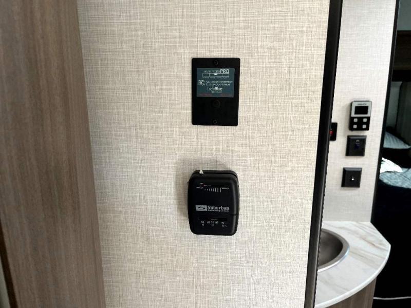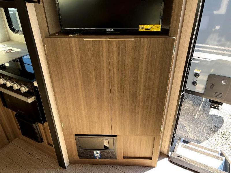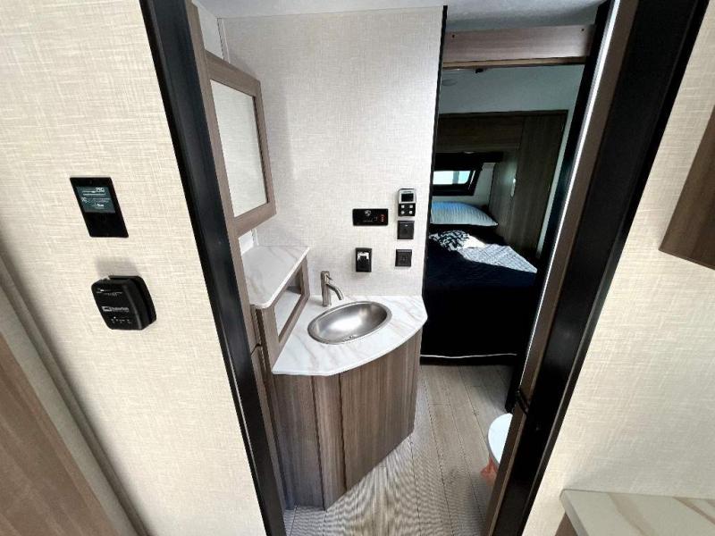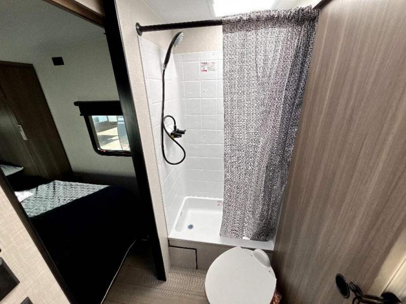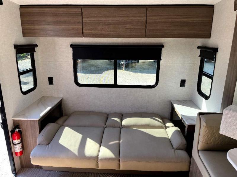 Looking for privacy when you camp? Do you enjoy dining at a booth dinette when you are staying in an RV? This Sonic provides all of that plus more! Starting with the private bedroom with an RV queen bed, StorMore bedside nightstands with a 110V outlet and USB charging to keep the electronics ready, dual wardrobes, and access to the walk-through bathroom through a space savings sliding door. The second entry to the walk-through bath is in the main living and kitchen area where you will find a 65" x 48" booth dinette and an 8 cu. ft. refrigerator slide out for more interior floor space, an L-shaped countertop with a large sink and kitchen amenities, plus an entertainment center and a 64" jiffy sofa. And the furniture doubles as extra sleeping space when needed. Don't forget about the 17' power awning offering an outdoor living area, just add your camp chairs.