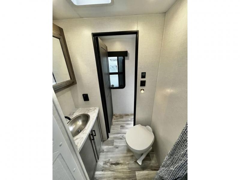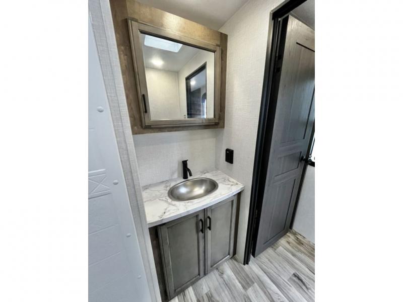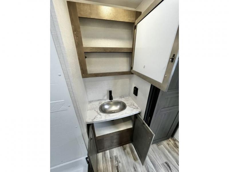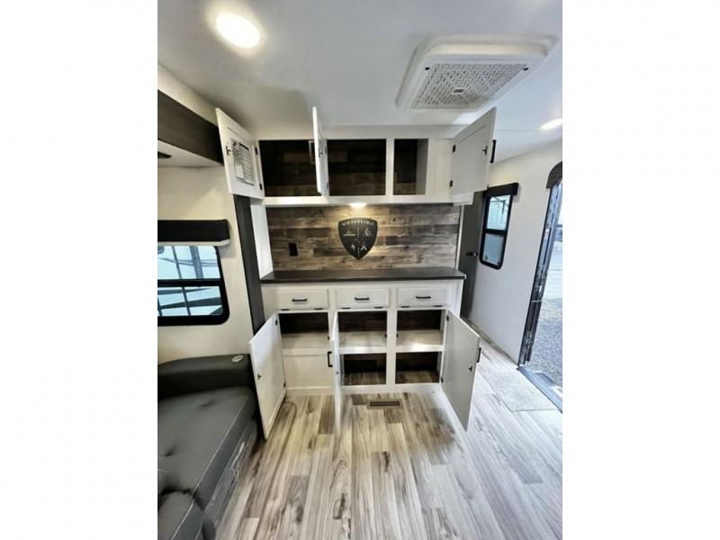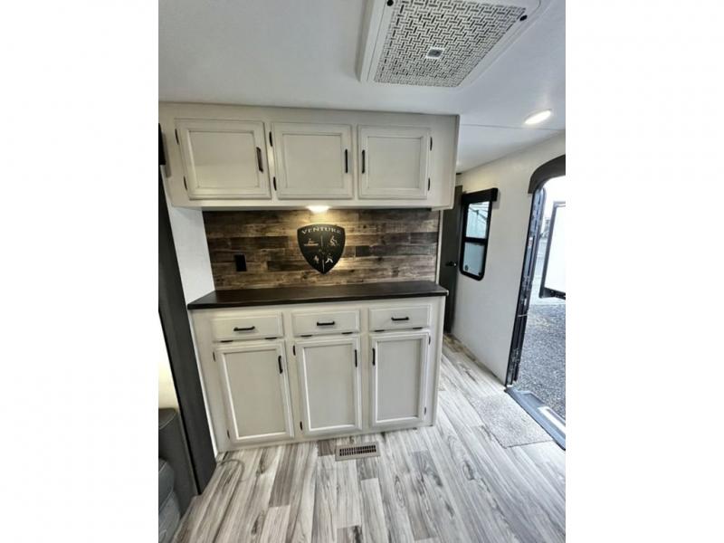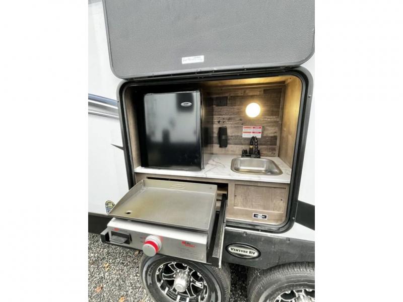 Every Venture RV SportTrek lightweight travel trailer is constructed to offer peace of mind and the comforts of home! Their purposeful residential kitchens are packed with handy features like a Furrion oven and three burner cooktop, a large stainless steel sink with a cover and dish drying rack, plus a 12V refrigerator. You will find plenty of storage throughout, including Safe-Tek hidden storage with a charging center and StorMore nightstands on either side of the bed behind the full-length closets. And the magnetic slam-latch baggage doors and spacious pass-through storage area will hold your outdoor gear in place. They even come with a hot and cold exterior shower and SporTrek's Weather Shield which includes a forced air heated and enclosed underbelly, high output A/C ducting, and more features that will let you extend your camping season. You will also love the new residential upgraded furniture, Serta memory foam mattress, barn style passage doors, and many more comforts!