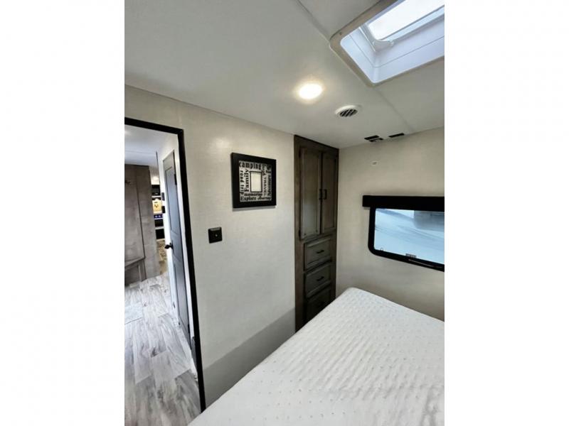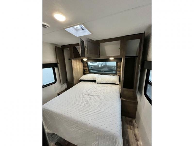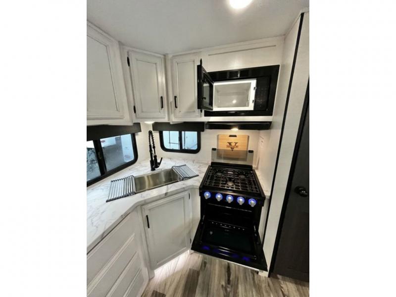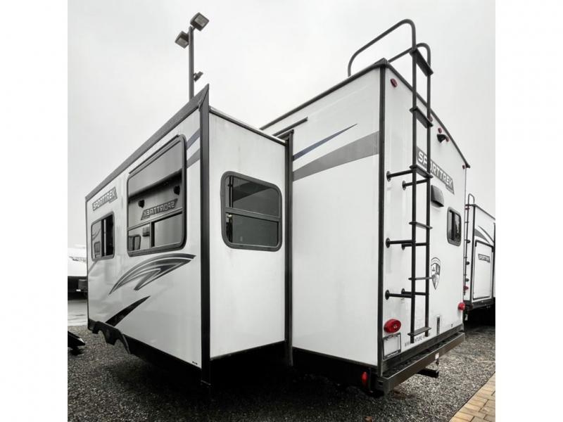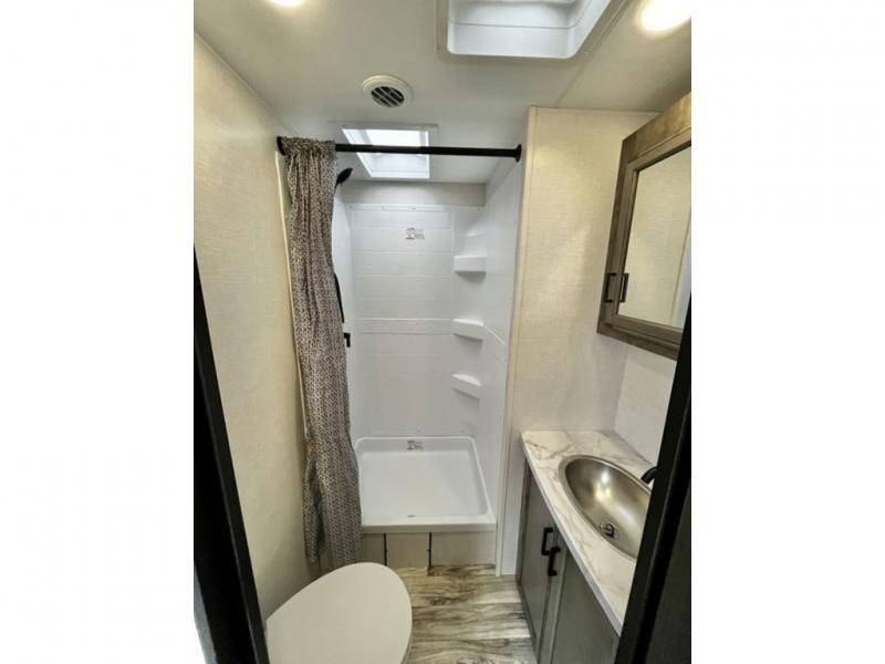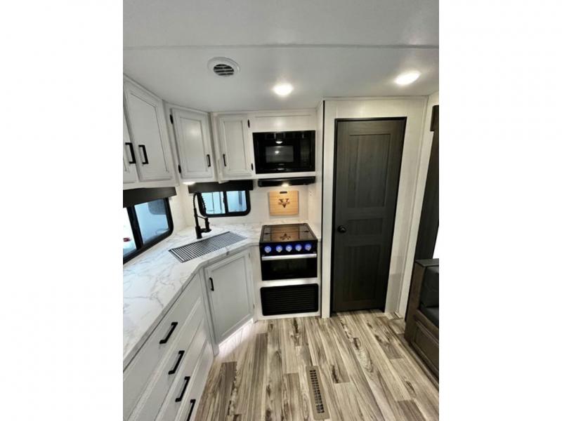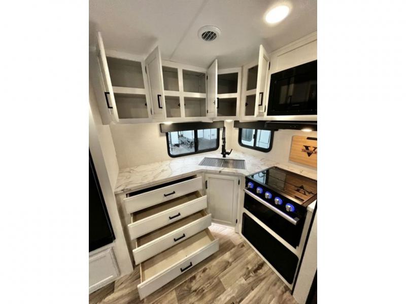 Every Venture RV SportTrek lightweight travel trailer is constructed to offer peace of mind and the comforts of home! Their purposeful residential kitchens are packed with handy features like a Furrion oven and three burner cooktop, a large stainless steel sink with a cover and dish drying rack, plus a 12V refrigerator. You will find plenty of storage throughout, including Safe-Tek hidden storage with a charging center and StorMore nightstands on either side of the bed behind the full-length closets. And the magnetic slam-latch baggage doors and spacious pass-through storage area will hold your outdoor gear in place. They even come with a hot and cold exterior shower and SporTrek's Weather Shield which includes a forced air heated and enclosed underbelly, high output A/C ducting, and more features that will let you extend your camping season. You will also love the new residential upgraded furniture, Serta memory foam mattress, barn style passage doors, and many more comforts!