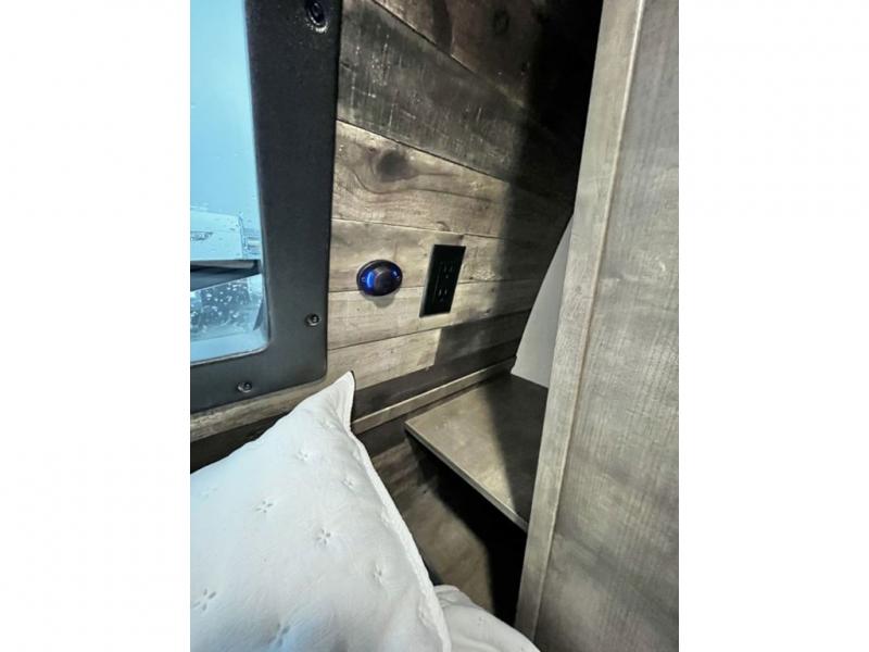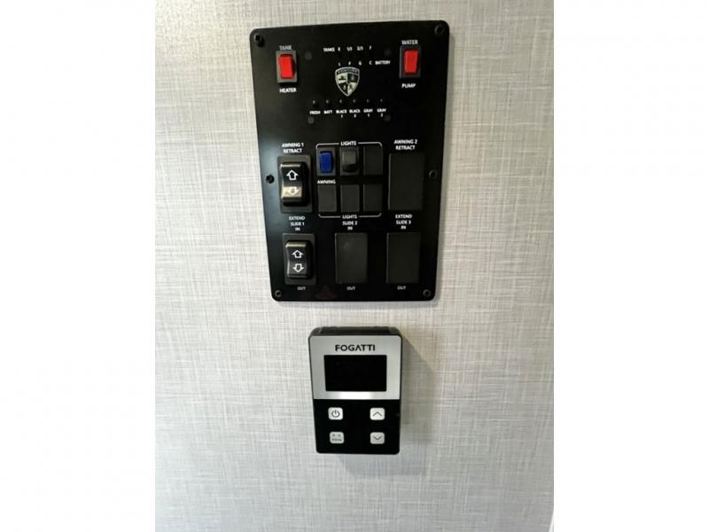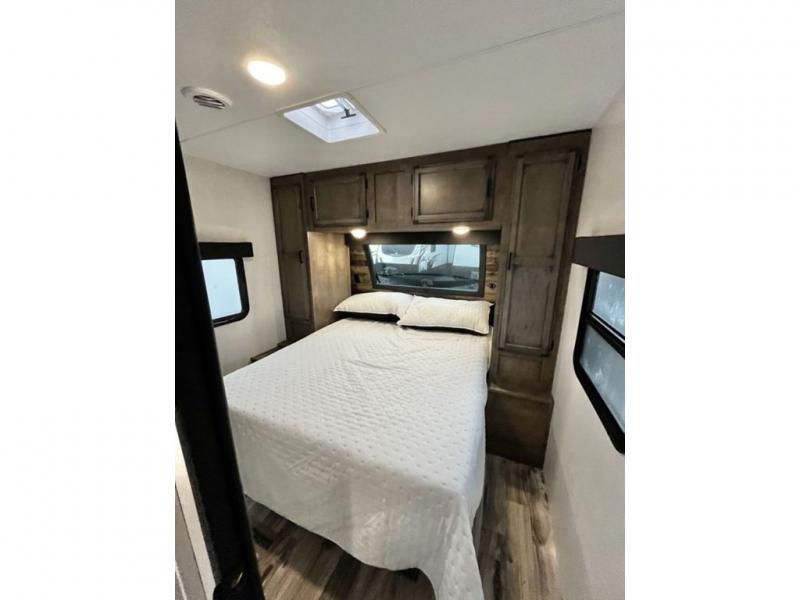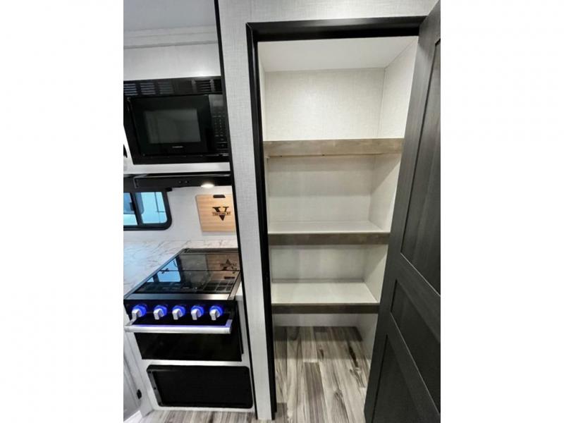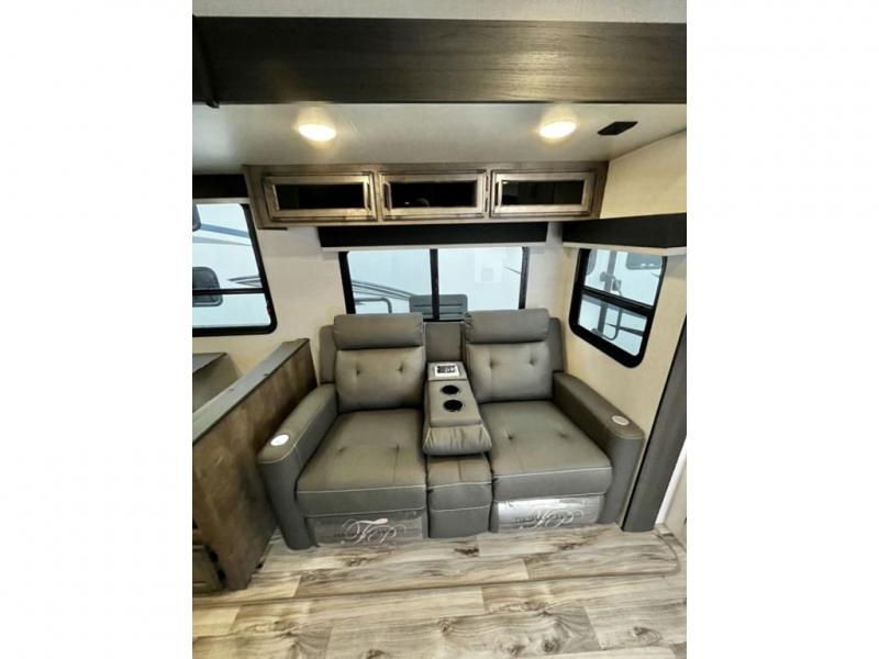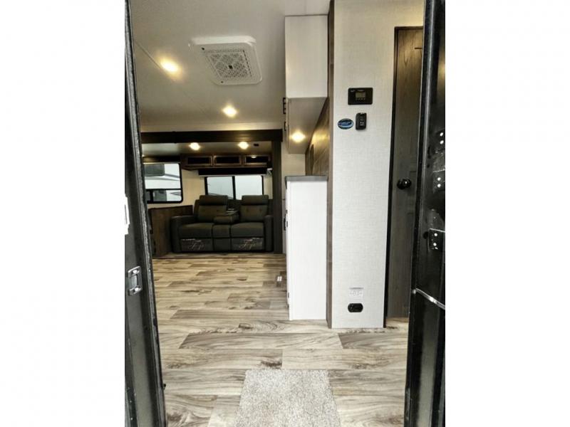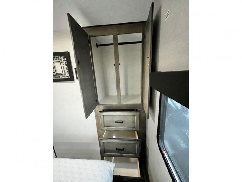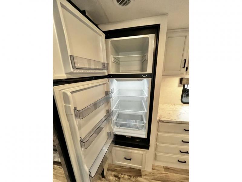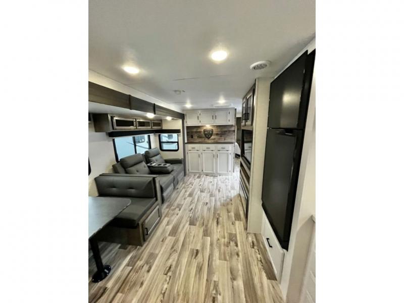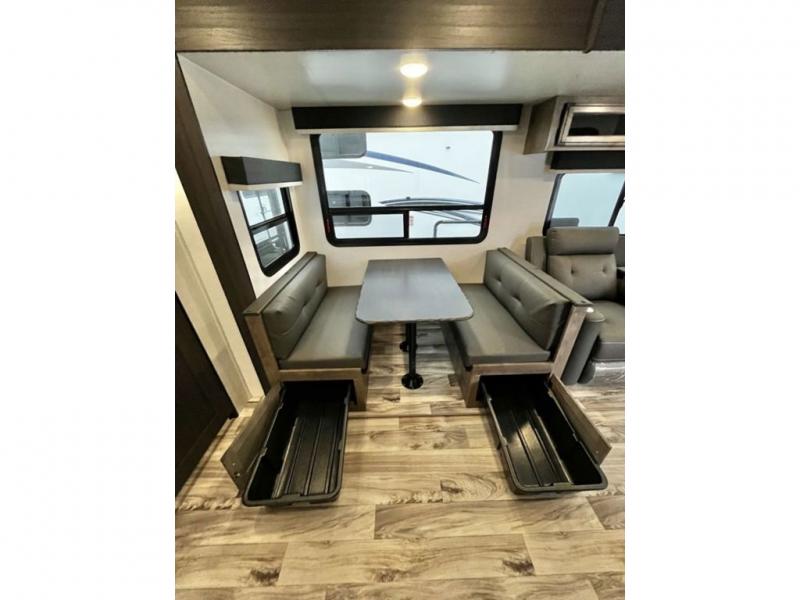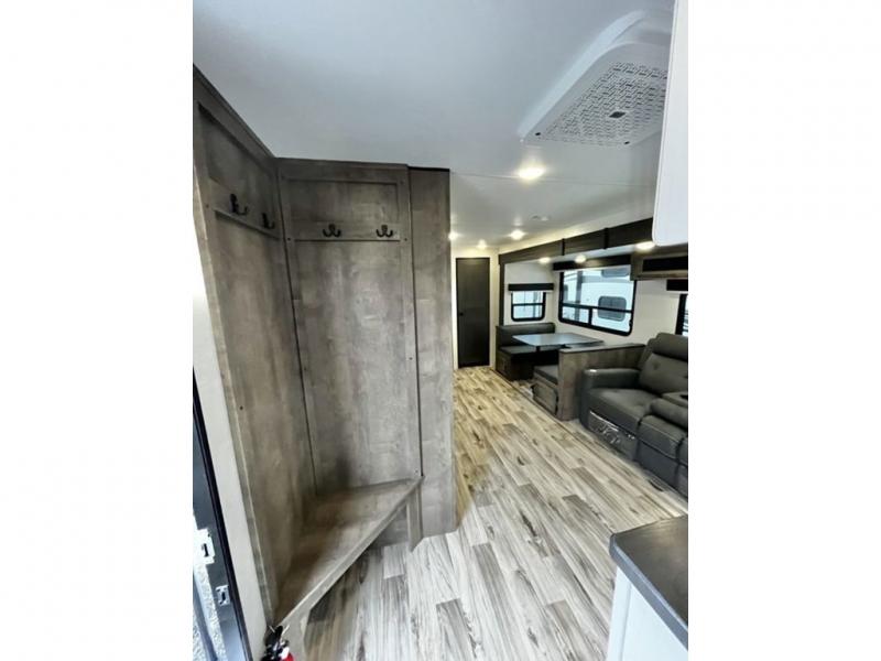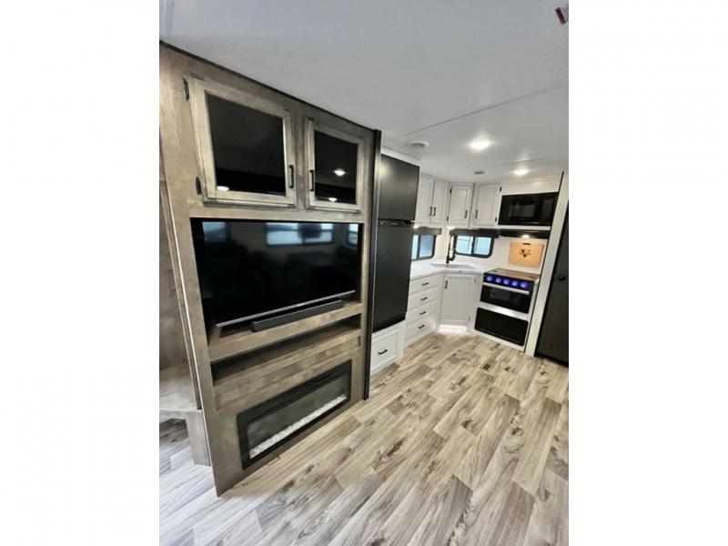 A rear kitchen makes it easy to prepare meals in this travel trailer! The kitchen has a three burner cooktop with a Furrion oven, a 10 cu. ft. 12V refrigerator to keep your perishables fresh, overhead cabinets keep cooking essentials nearby, and a walk-in pantry big enough for all of your snacks and canned goods, plus a hutch for your dishes. You could even prepare meals outside with the campfire café which has a sink, a refrigerator, and a griddle. The bench seat gives you a spot to sit while you put on your shoes and the coat hooks above makes it easy to grab and go. Enjoy your meals and card games at the 42" booth dinette and relax on the 70" sofa across from the entertainment center with a 40" TV on a swing arm and a frameless electric fireplace. The front private bedroom has a Sleep Tight queen bed to lay your head on at night and a closet with drawers to keep your clothes looking their best!