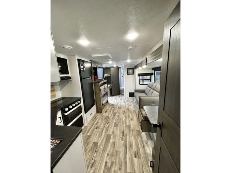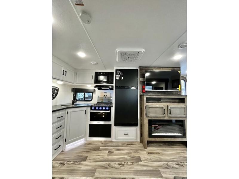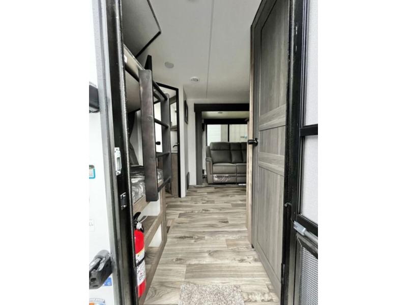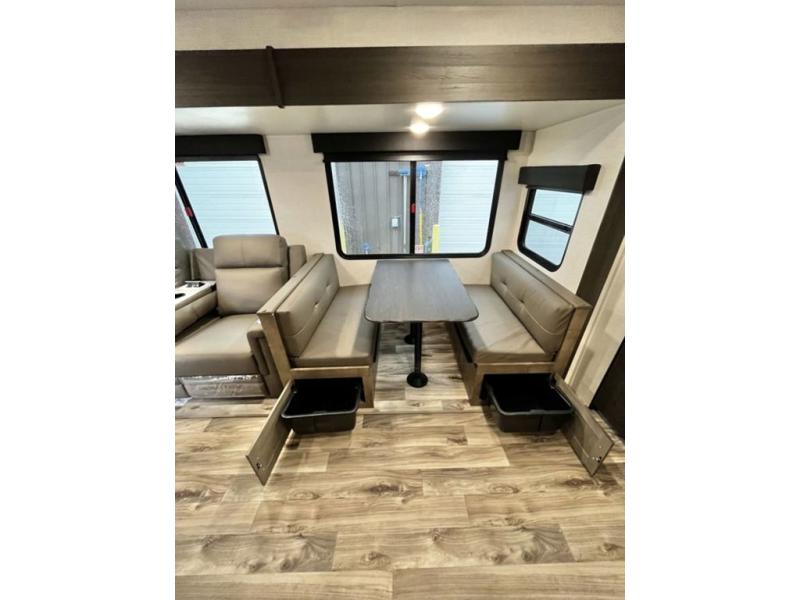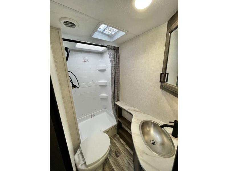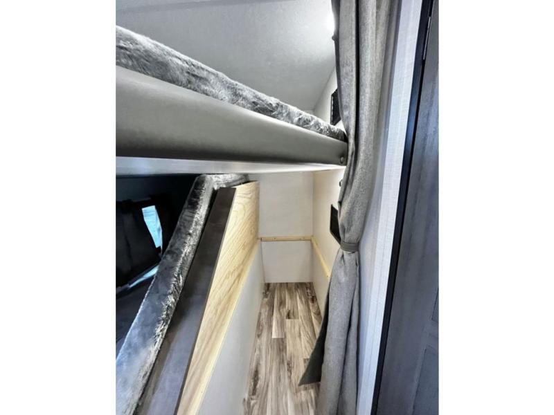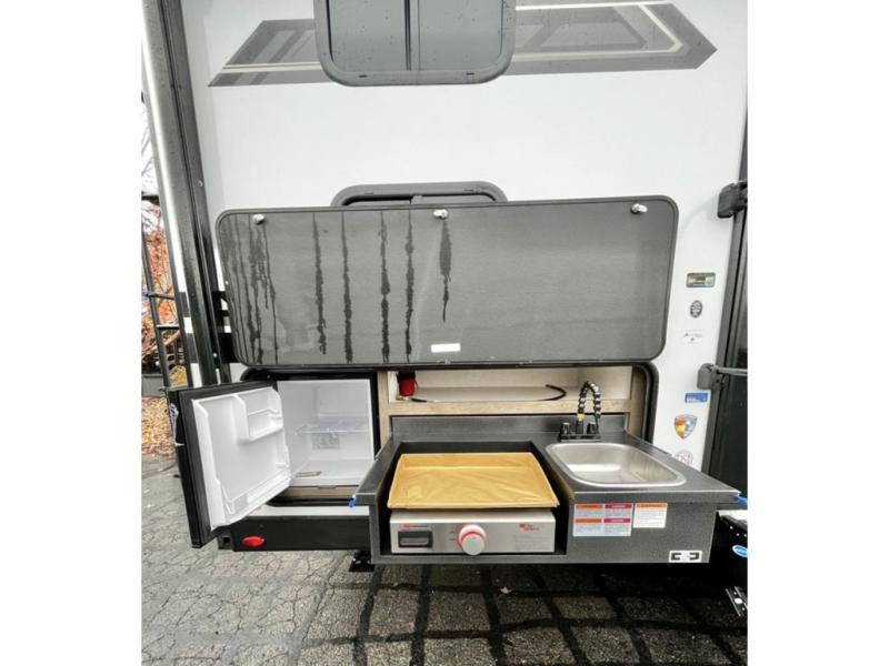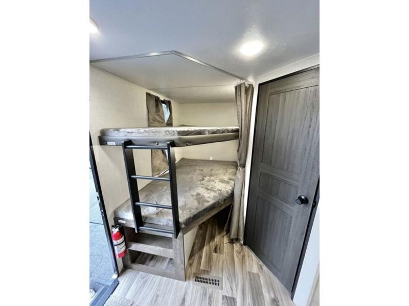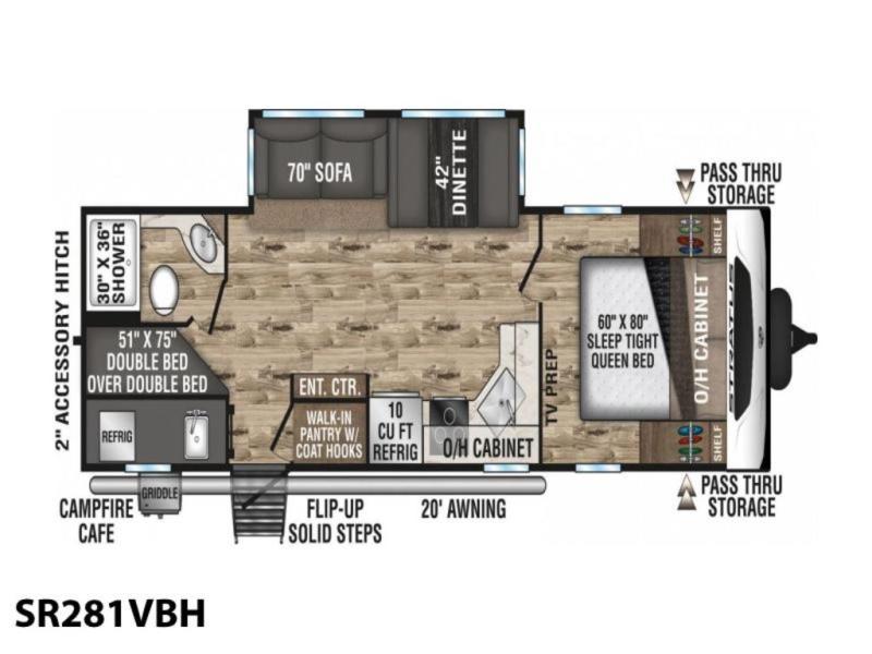 The whole family will have a fun time camping in this travel trailer! You will appreciate having your own space with the front private bedroom that has a sleep tight queen bed to lay your head on at night, and wardrobes on either side to hang your clothes. The kids can sleep on the set of 51" x 75" double bed bunks and can even invite a friend or two to tag along and sleep on either the 70" sofa or the 42" booth dinette once they are converted. Everyone can freshen up in the rear corner bathroom featuring a 30" x 36" shower. Behind the entertainment center is a walk-in pantry with coat hooks so you can store your jacket and groceries. The chef will enjoy cooking at the outside campfire café on the griddle, plus there is a refrigerator, and a sink for cleaning up!