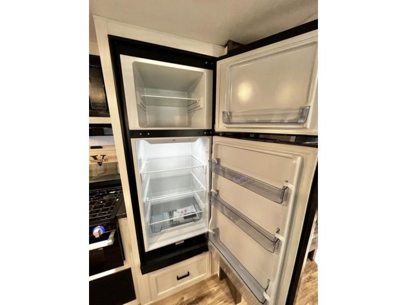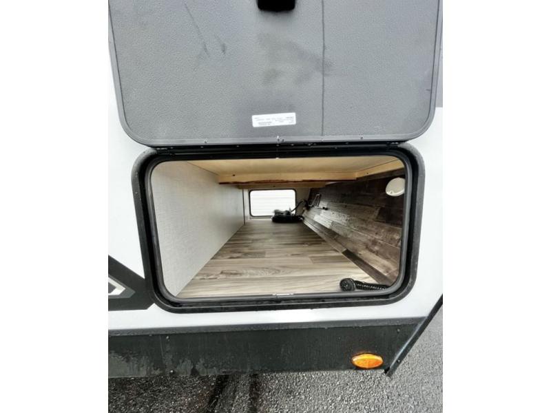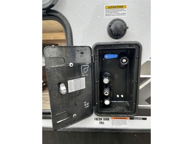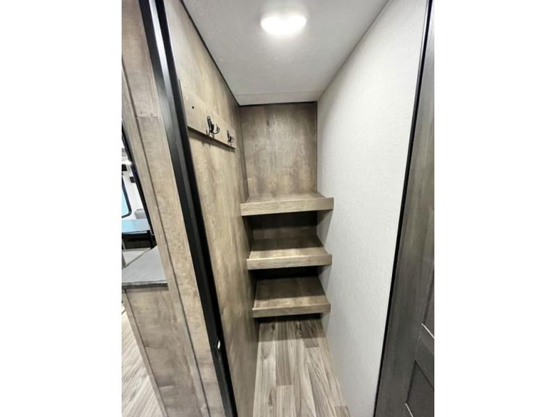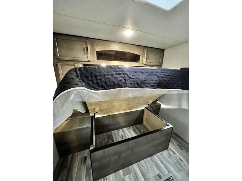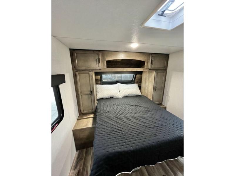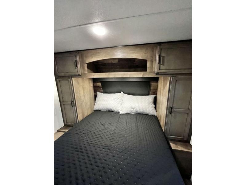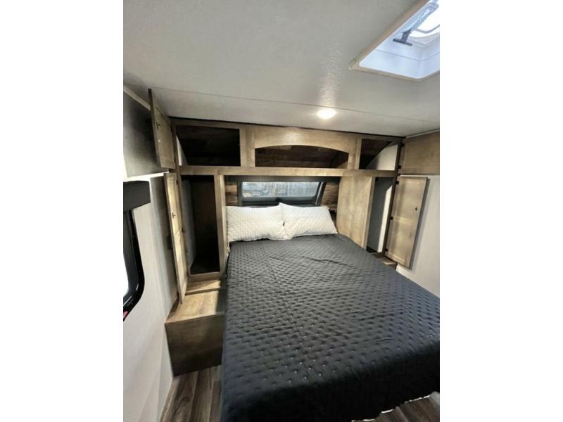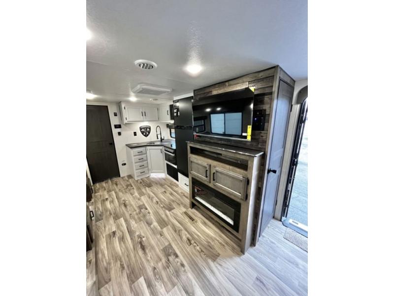 The whole family will have a fun time camping in this travel trailer! You will appreciate having your own space with the front private bedroom that has a sleep tight queen bed to lay your head on at night, and wardrobes on either side to hang your clothes. The kids can sleep on the set of 51" x 75" double bed bunks and can even invite a friend or two to tag along and sleep on either the 70" sofa or the 42" booth dinette once they are converted. Everyone can freshen up in the rear corner bathroom featuring a 30" x 36" shower. Behind the entertainment center is a walk-in pantry with coat hooks so you can store your jacket and groceries. The chef will enjoy cooking at the outside campfire café on the griddle, plus there is a refrigerator, and a sink for cleaning up!