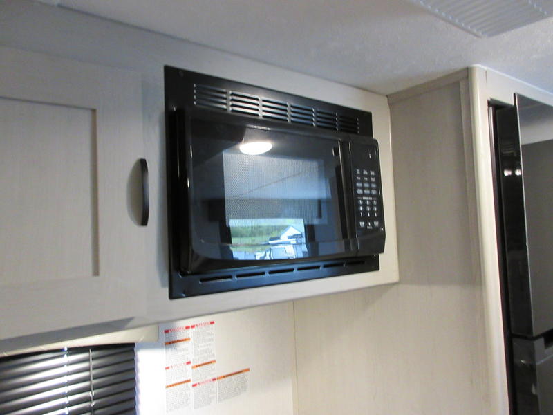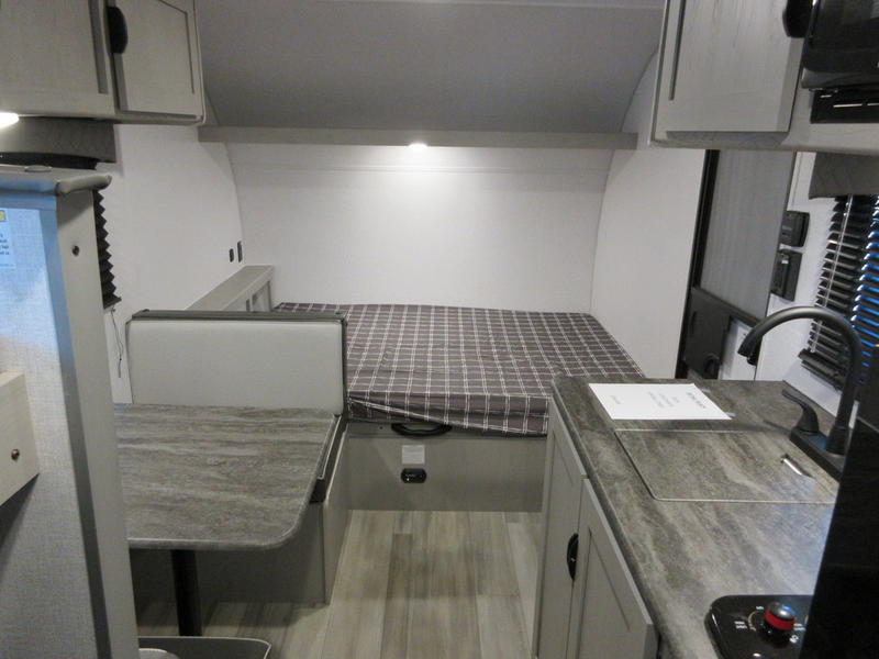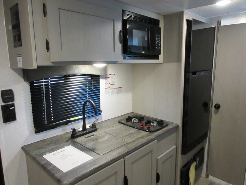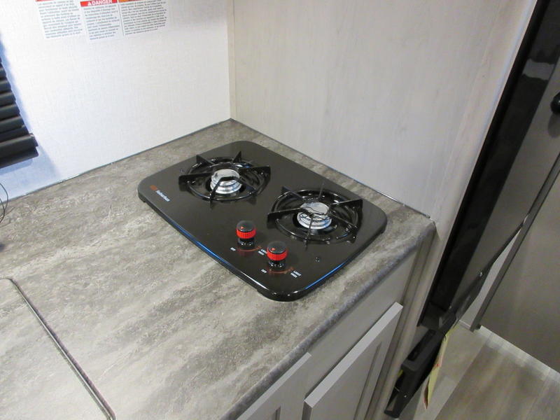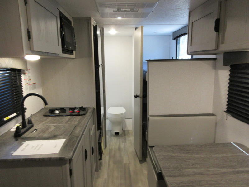 This is the perfect travel trailer for a family of four or five since it includes bunk beds for the kids, and a 54" x 74" bed up front as well as a booth dinette that can be converted to sleep one more. There is a two burner range to cook meals on, and a sink to easily clean up each day. You can dine at the booth dinette or take your plate outdoors to sit under the 10' power awning with LED lighting. This model also includes a 24" x 36" shower to get cleaned up each day, and a shower skylight for more natural lighting. Get an early start on family vacations with this travel trailer in tow!
