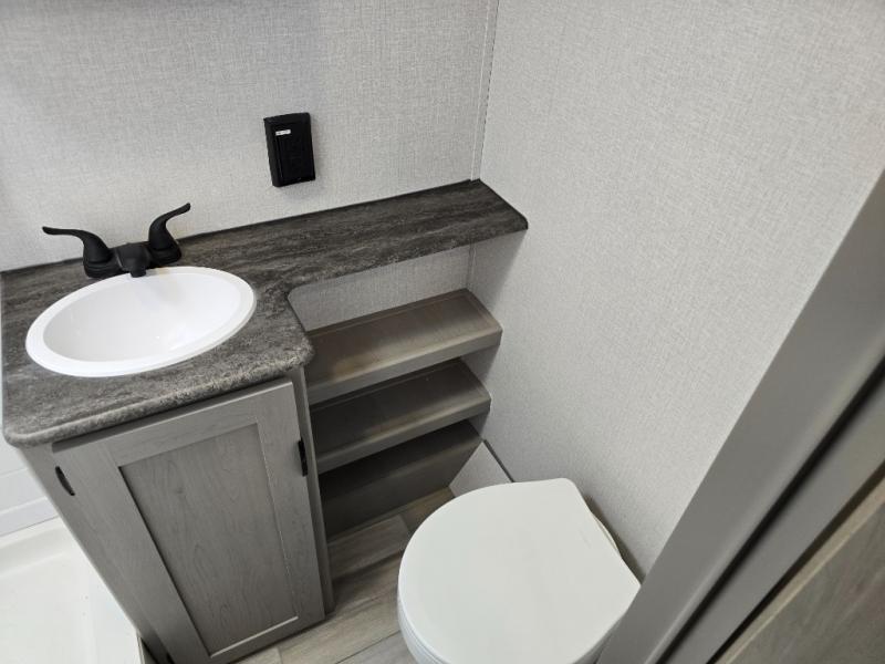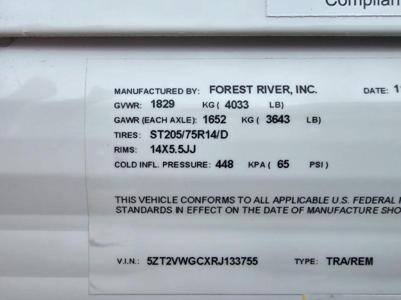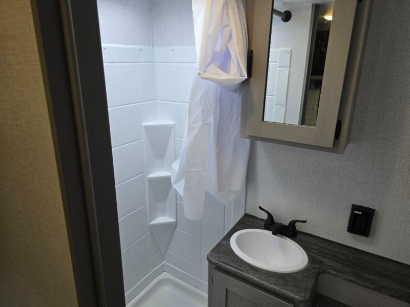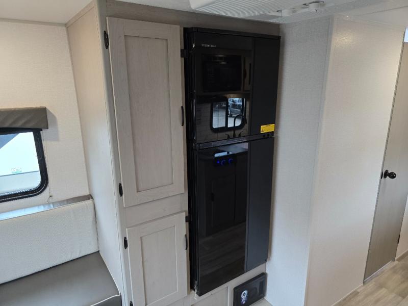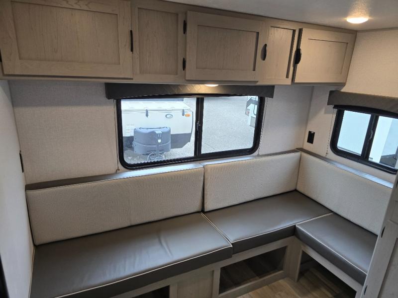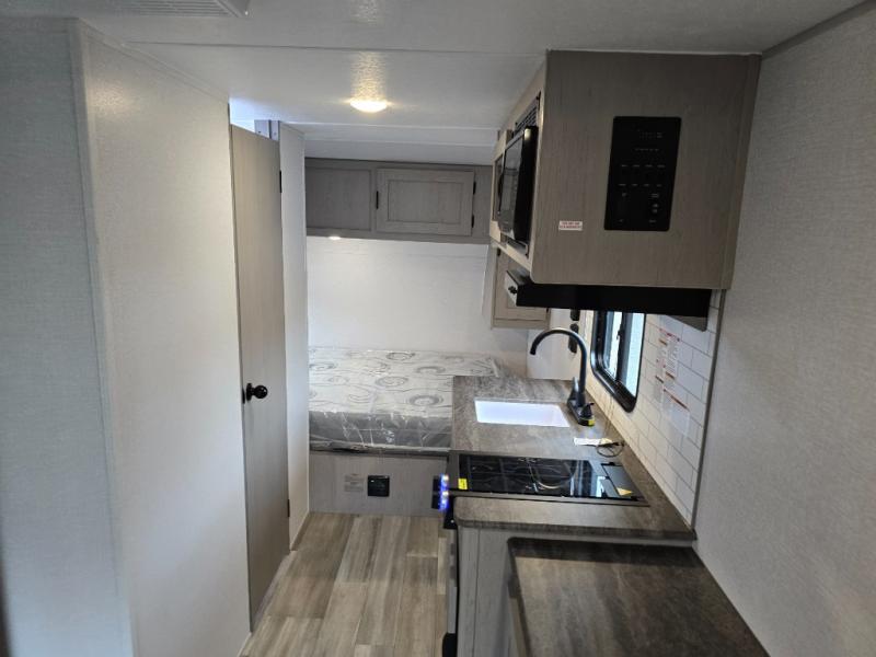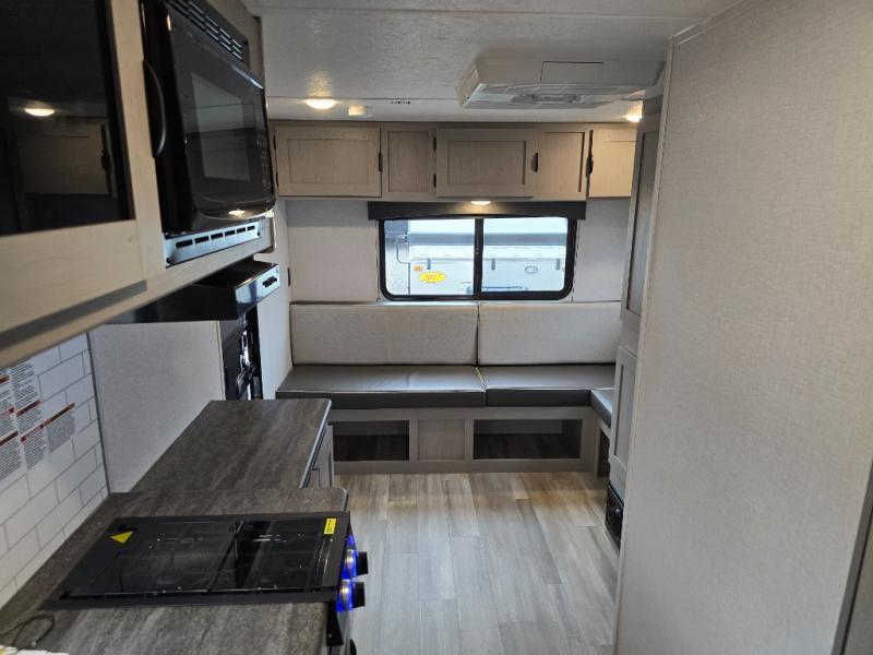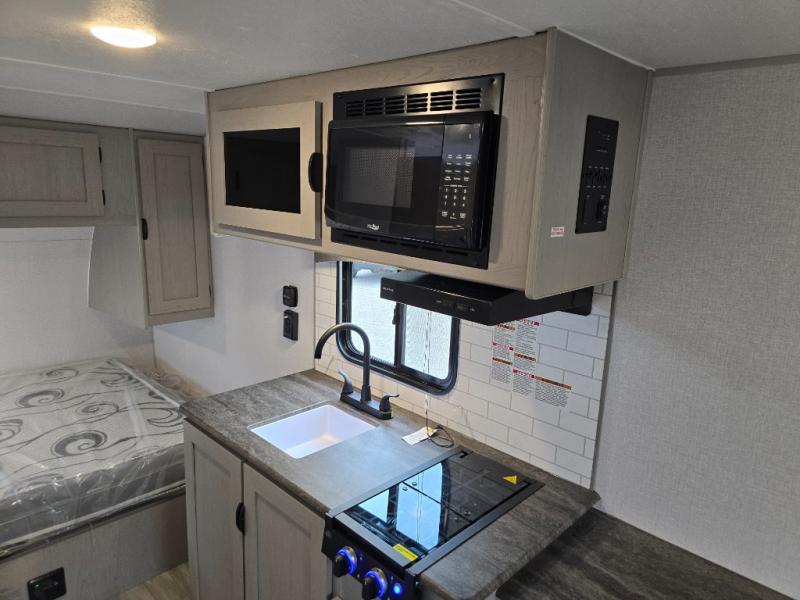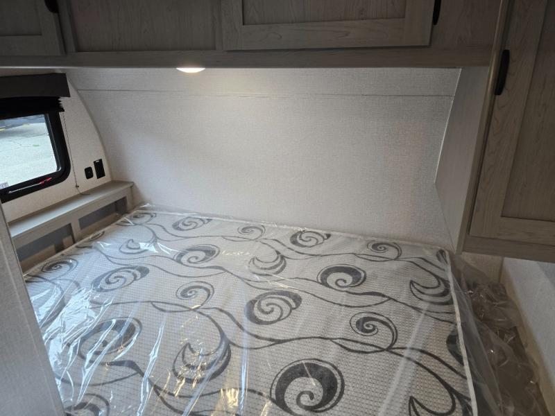 This travel trailer is the perfect cozy trailer for two with a removable and open L-shaped seating in back as you enter. A countertop/desk with storage is also located near the entry door, or you could choose an optional fireplace in it's place. Up front, a mattress for sleeping with a large overhead cabinet and shelf for your things. The kitchen features a two burner cooktop, overhead microwave oven and single sink. The refrigerator is located on the opposite side near the L-seating. You will appreciate having a full bath including a 24" x 36" shower, vanity with sink and linen storage, plus foot flush toilet and skylight for more headroom and natural light. So, no late night running in the dark to a campground bathroom. On the outside, plenty of storage in the large pass-thru compartment and a 10' awning to create even more living space to enjoy!