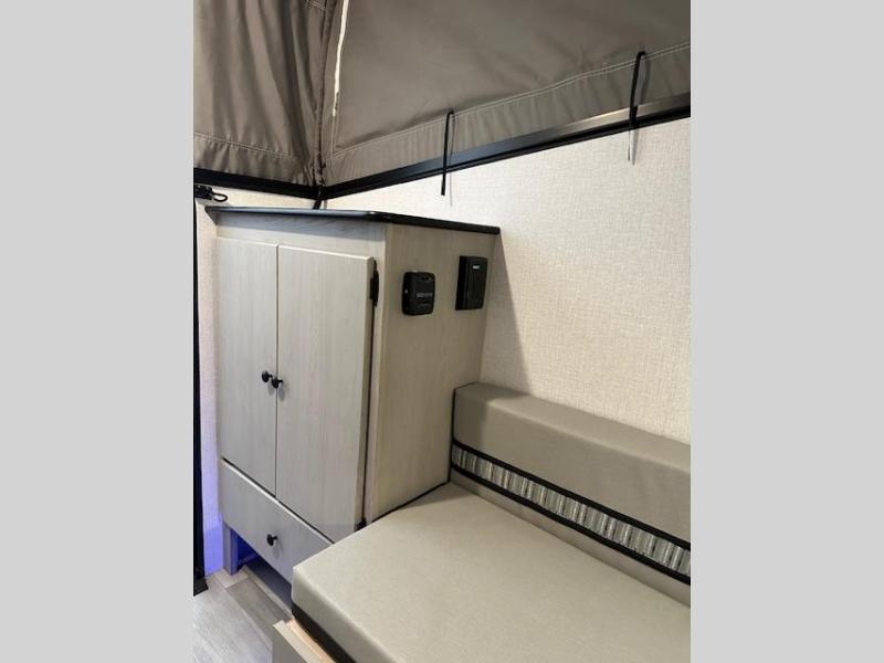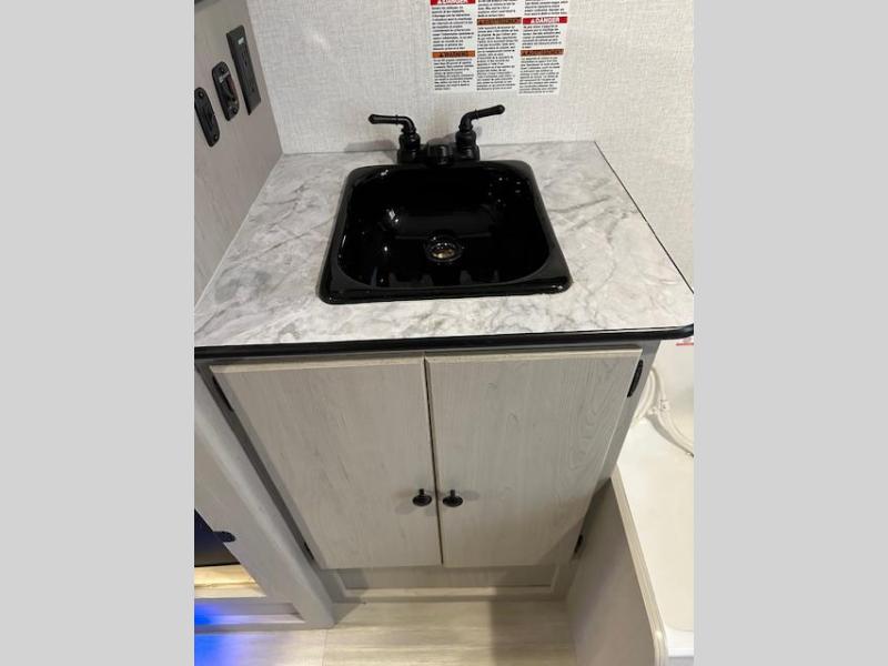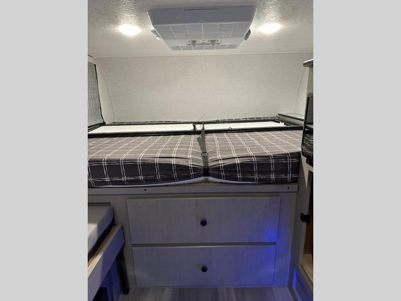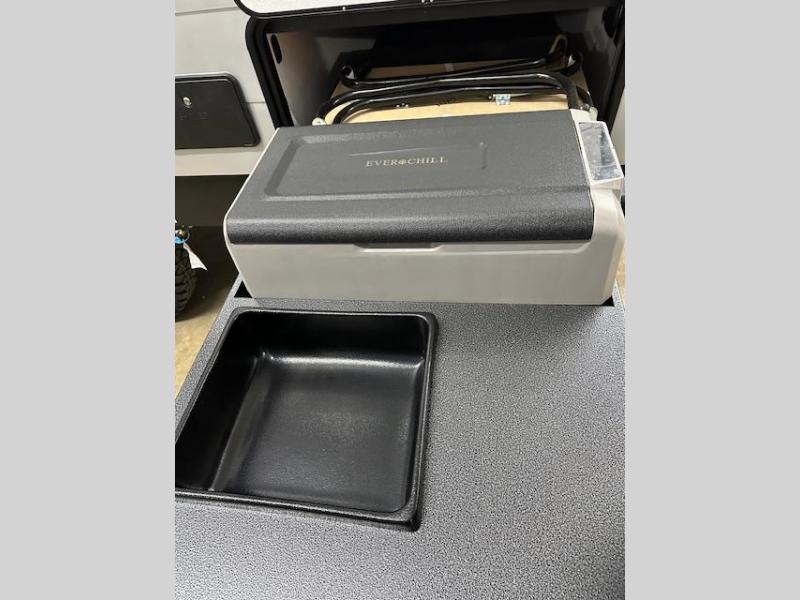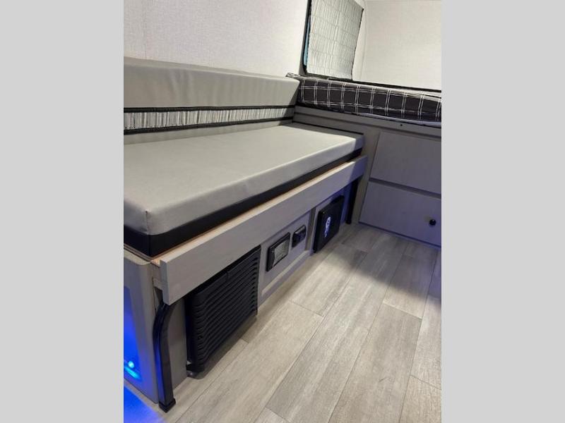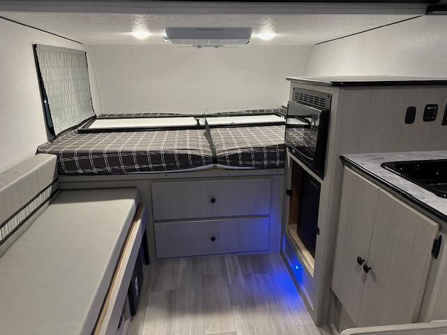 A perfect couples teardrop trailer, or one for a small family to enjoy. The rear entry door provides access to a 56" x 74" bed for two, plus there is a gaucho sofa that can easily be pulled out into a bed as well. The pull-out camp kitchen with griddle makes cooking simple, and the 12 volt cooler will keep your perishables fresh while traveling. There is a wet bath for cleaning up inside, plus a removable sink in the pull-out kitchen for outdoor convenience as well. A wardrobe for your clothing, plus more storage in drawers beneath the bed in front for your things allows you to easily tuck items away when not in use. There is even a 20K furnace if the nighttime gets too cool, and with the off-road package you will appreciate the flipped axle and 15" off-road tires for when you want to go off the beaten path for awhile. The off-grid solar package also allows you to enjoy a little power while unplugged.