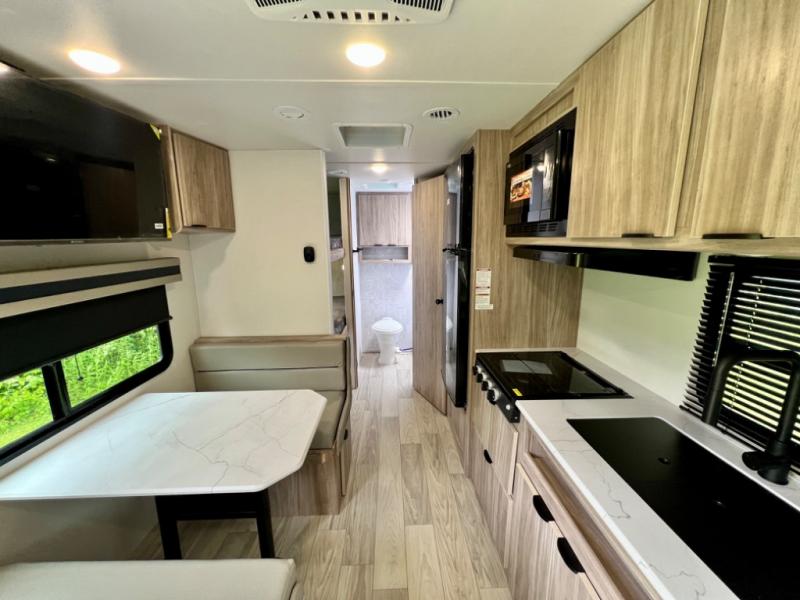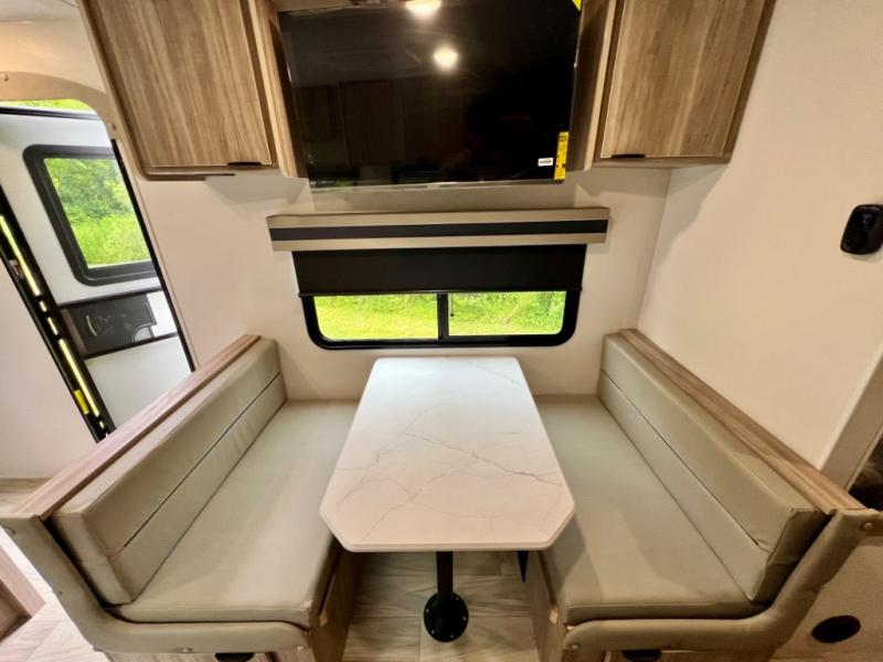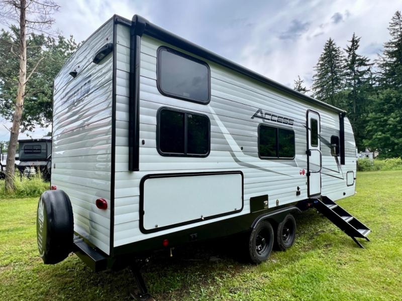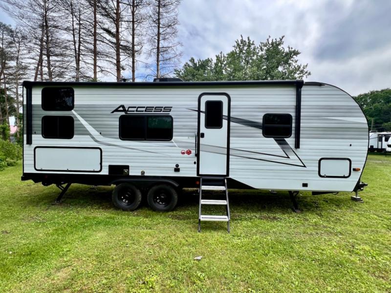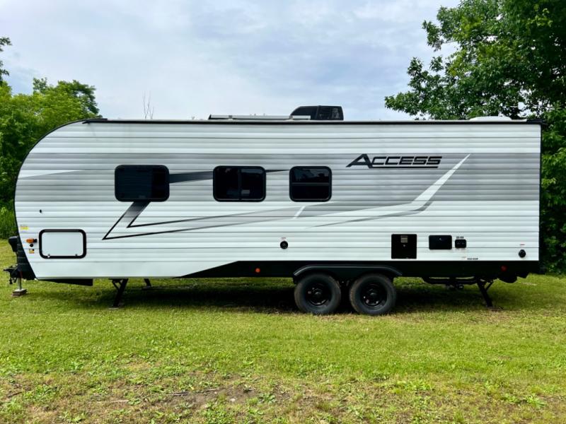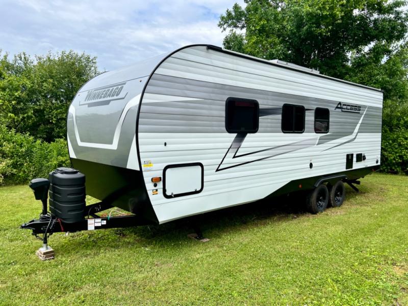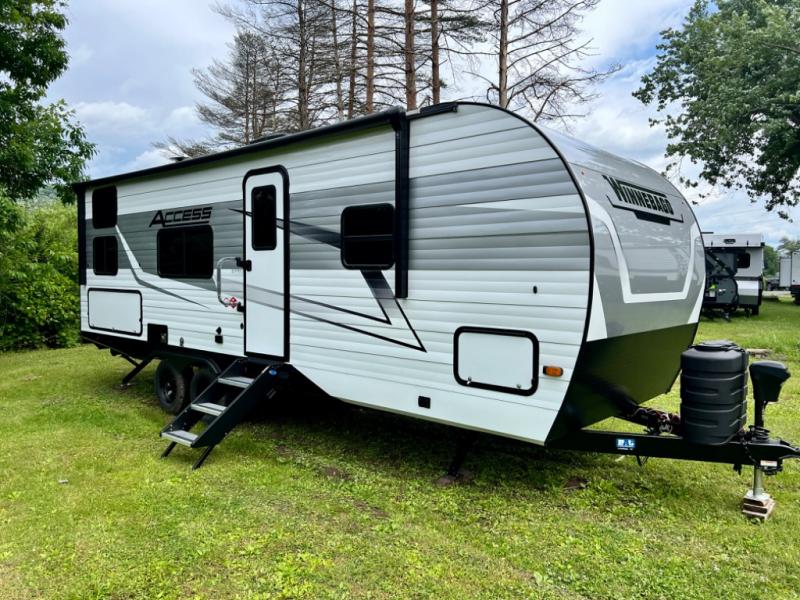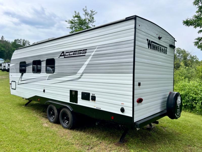 With any Winnebago Access travel trailer you will find thoughtful, clean, and contemporary designs filled with premium features that all have come to expect on any Winnebago towable. The powered stabilizer jacks make setting up camp easy with just the touch of a single button. You will appreciate the stylish exterior front profile and thicker sidewall metal for greater aerodynamics plus strength and durability. With a fully enclosed underbelly you can extend your camping season into the colder months, and the 12 volt tank pad heaters will keep you from having frozen pipes. On the inside, a porcelain toilet, larger skylights for more natural lighting, abundant storage, and spacious living areas make every camping trip more enjoyable. And, the 200 watt solar power reduces the need for shore power which makes it easy to go off-grid. Make your choice today and Access your next adventure!