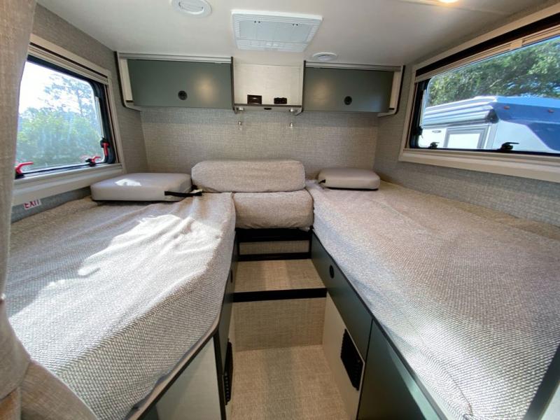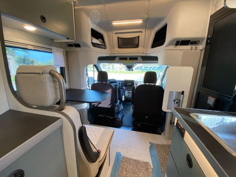 This Ekko all-wheel drive Class C gas motorhome is just unbelievably functional! Not only do you have plenty of storage space for all of your gear with the gear garage, under-bed storage, pantry, and 5.3-cubic foot refrigerator, but you also have a 24" x 30" wet bath with a pivoting lavatory wall so that you can stay clean without having to stop at rest areas along the way. The cab area is excellently appointed with a radio/rearview monitor system, swivel/recline cab seats, and many driving safety features. Since the cab seats can swivel, you can use them as another place to sit down and eat at the fold-down table, and you can also use the swivel/adjustable work table for the passenger cab seat or as an extended countertop in the kitchen. Above the dining area is an access point to the optional pop-top sleeping area which would come in handy if you travel with multiple people.