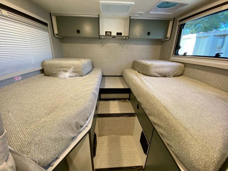 This Ekko all-wheel drive Class C gas motorhome is just unbelievably functional! Not only do you have plenty of storage space for all of your gear with the gear garage, under-bed storage, pantry, and 5.3-cubic foot refrigerator, but you also have a 24" x 30" wet bath with a pivoting lavatory wall so that you can stay clean without having to stop at rest areas along the way. The cab area is excellently appointed with a radio/rearview monitor system, swivel/recline cab seats, and many driving safety features. Since the cab seats can swivel, you can use them as another place to sit down and eat at the fold-down table, and you can also use the swivel/adjustable work table for the passenger cab seat or as an extended countertop in the kitchen. Above the dining area is an access point to the optional pop-top sleeping area which would come in handy if you travel with multiple people.