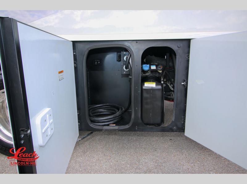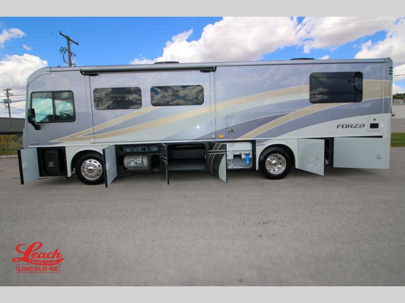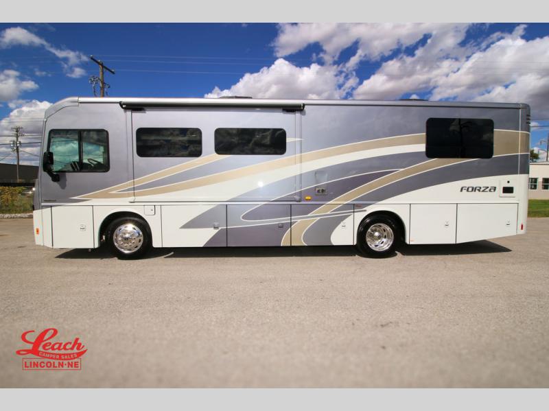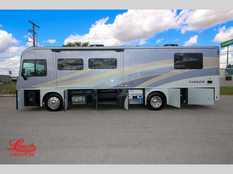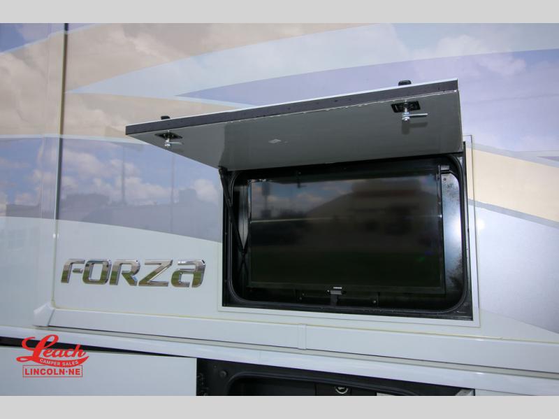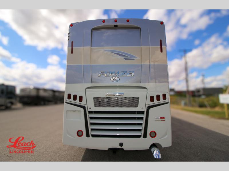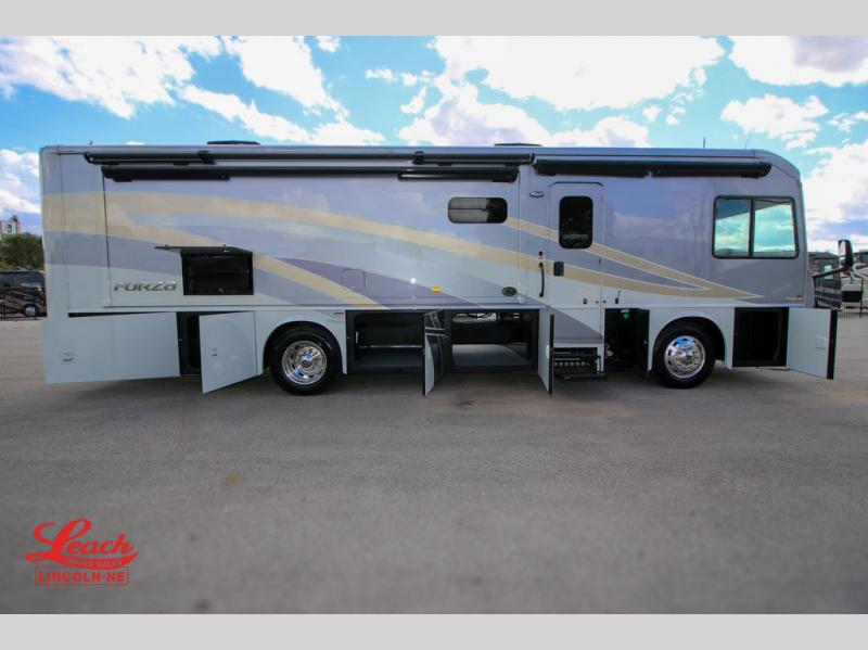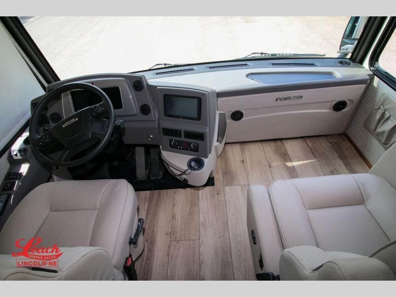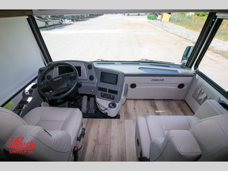 There isn't a thing you won't love about the Winnebago Forza Class A diesel motorhome! These powerful and practical coaches have excellent quality in their construction, and the undercarriage lighting is quite stylish and impressive. You'll find NeWay air suspension with V-Ride, automatic hydraulic leveling jacks, a 10,000-lb. hitch, and automatic entrance steps. Sitting in the cab will be enjoyable with the multi-adjustable swivel and recline seats, the radio/rearview monitor system with 9" LCD color touchscreen, the cellphone interface to radio, and the TRW® tilt/telescopic steering column with foot-actuated pedal. The interior has a Firefly switch panel that lights up when it's dark, and the 6,000W Cummins Onan generator is what you need to power your coach. You will also find vinyl flooring throughout, blackout roller shades, Corian countertops, a textured glass shower door, and many more comforts you'd expect to find at home!