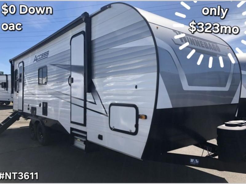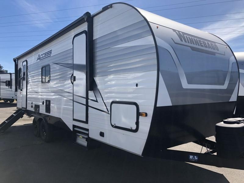 With any Winnebago Access travel trailer you will find thoughtful, clean, and contemporary designs filled with premium features that all have come to expect on any Winnebago towable. The powered stabilizer jacks make setting up camp easy with just the touch of a single button. You will appreciate the stylish exterior front profile and thicker sidewall metal for greater aerodynamics plus strength and durability. With a fully enclosed underbelly you can easily extend your camping season into the colder months, and the 12 volt tank pad heaters will keep you from having frozen pipes. On the inside, a porcelain toilet, larger skylights for more natural lighting, abundant storage, and spacious living areas making every camping trip more enjoyable. And, the 200 watt solar power reduces the need for shore power which makes it easy to go off-grid. Make your choice today and Access your next adventure!