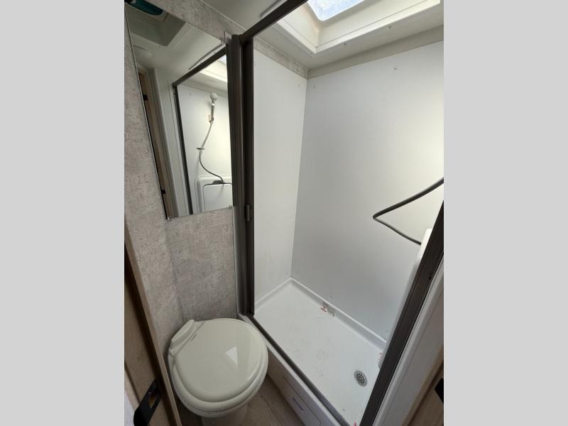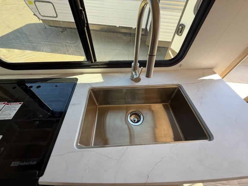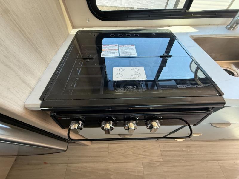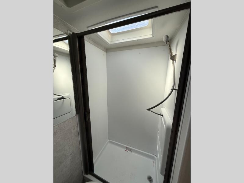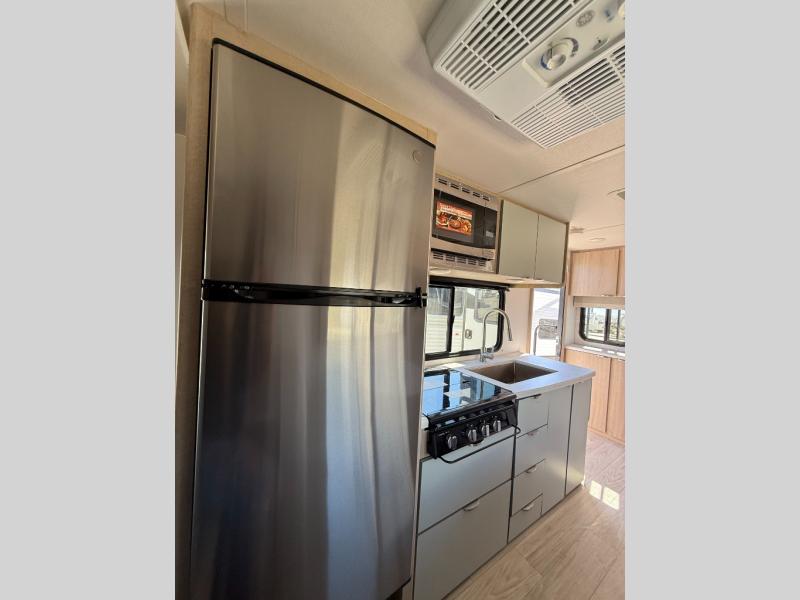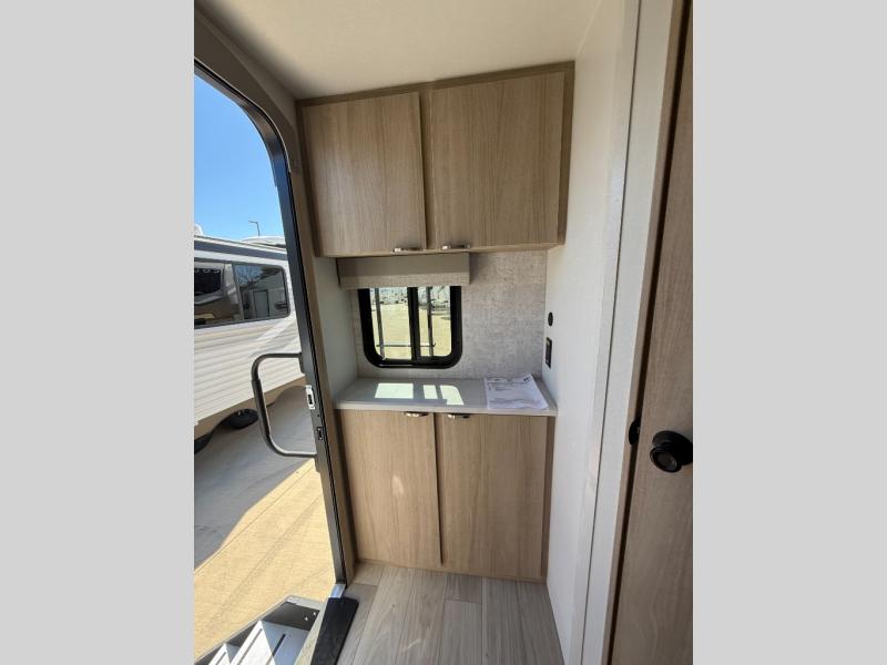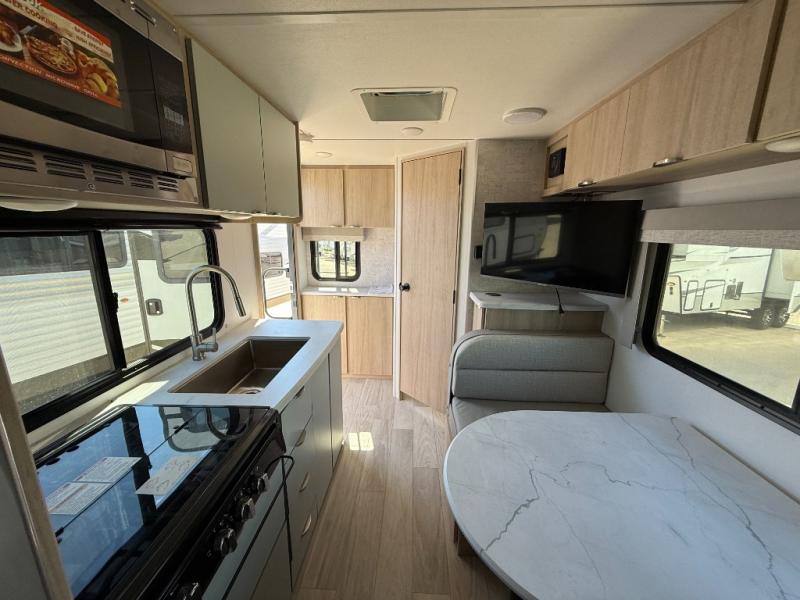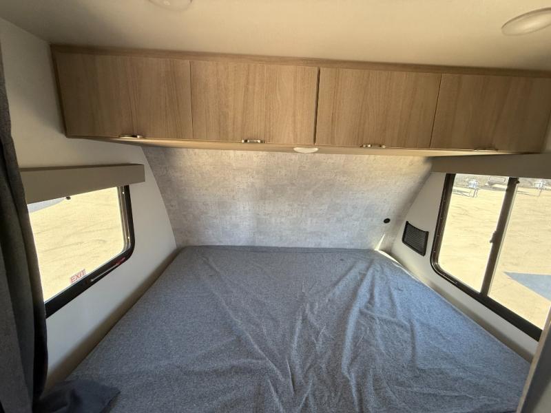 You will love this efficient floorplan that has everything you need! The front 54" x 74" full-size bed provides a great place to sleep after a long day of adventure. The galley kitchen is well-equipped for meals and includes a flip-up counter extension that will expand your work space or can be stowed away for more room. A pantry cabinet provides additional storage space. After cooking, you can enjoy dining at the spacious 74" x 32" booth dinette. A rear corner bath with angled entry door fits in a roomy 24" x 36" shower plus a fold down sink.