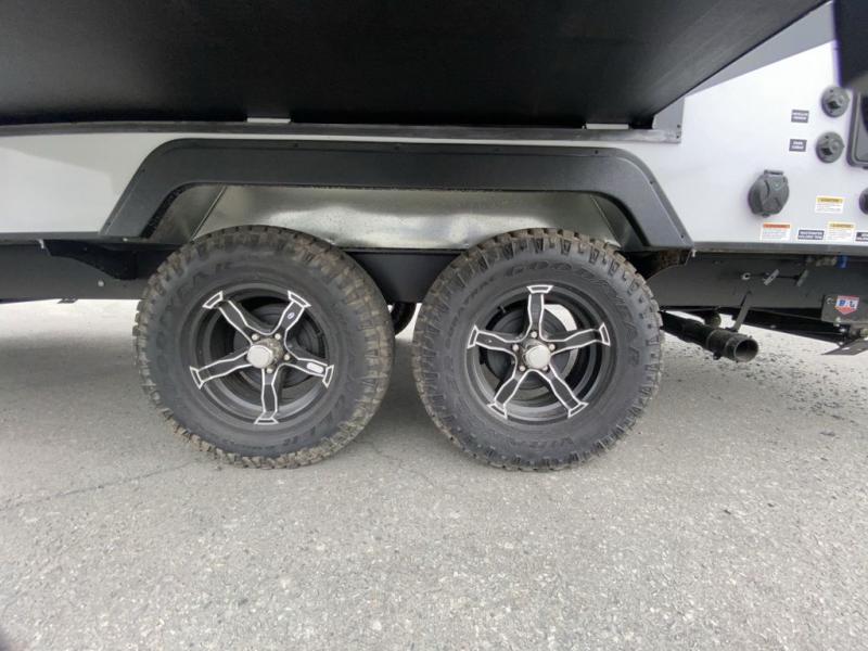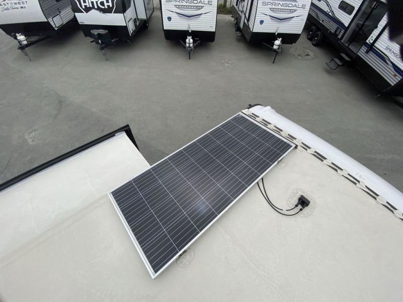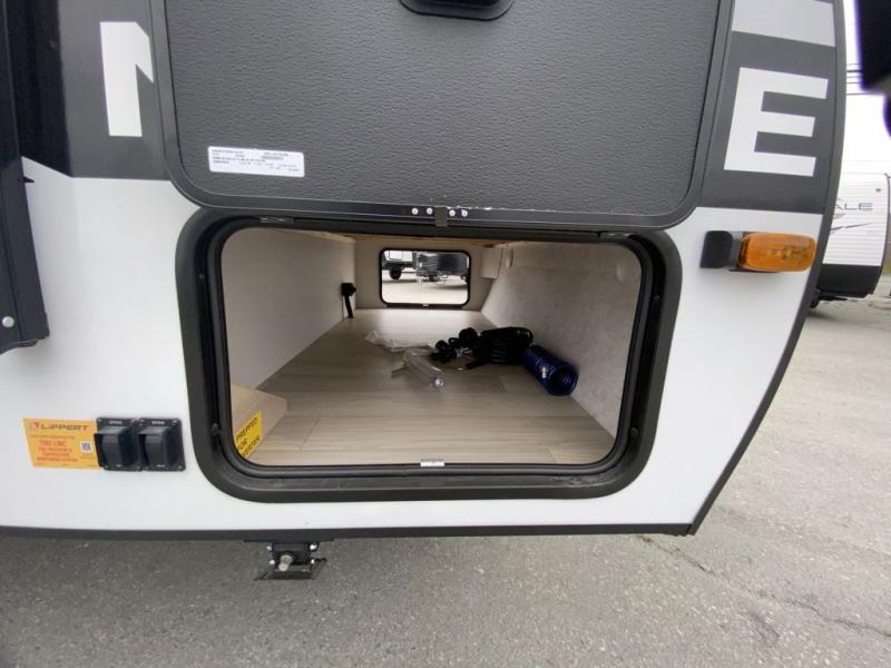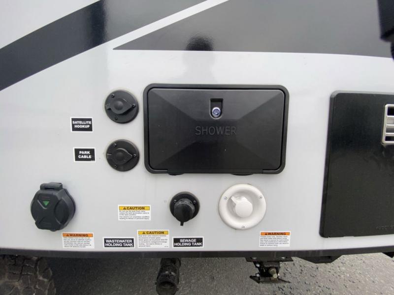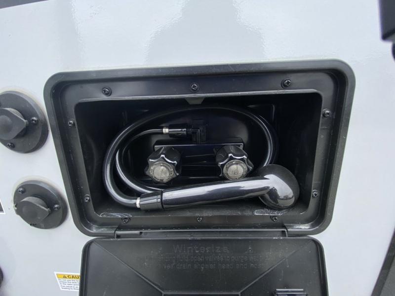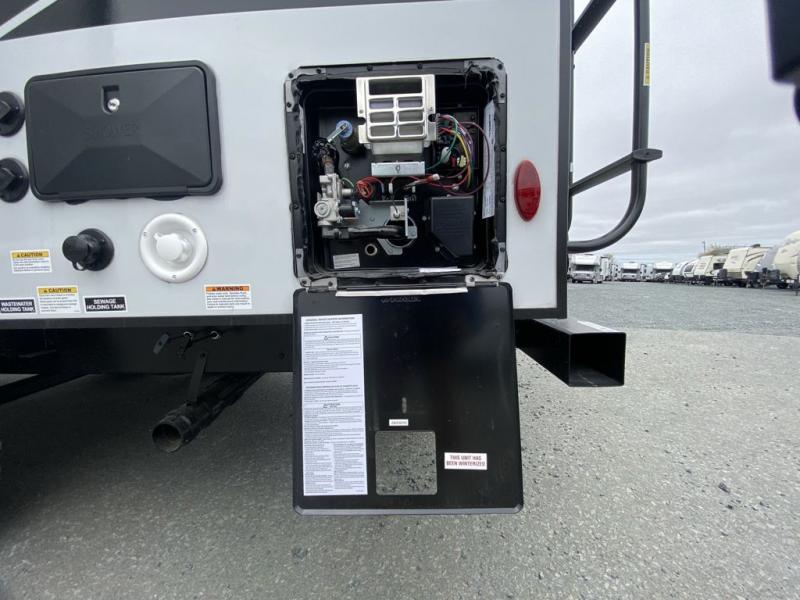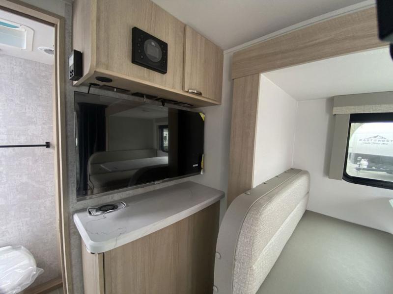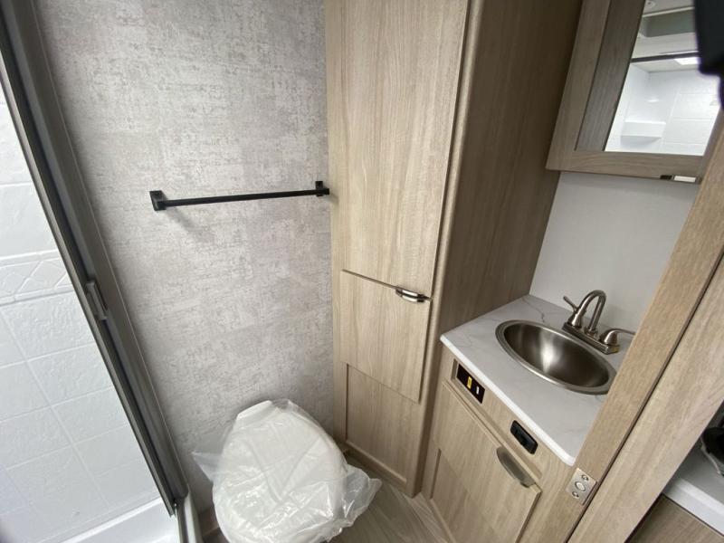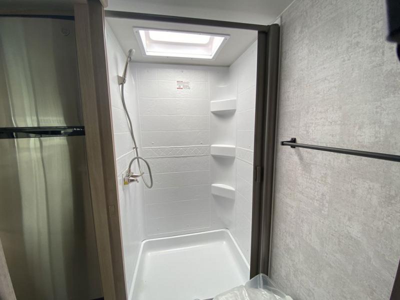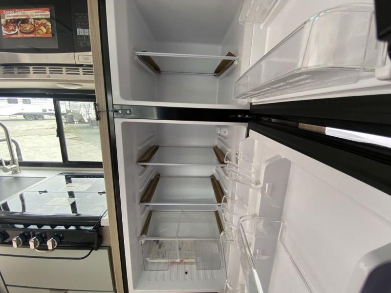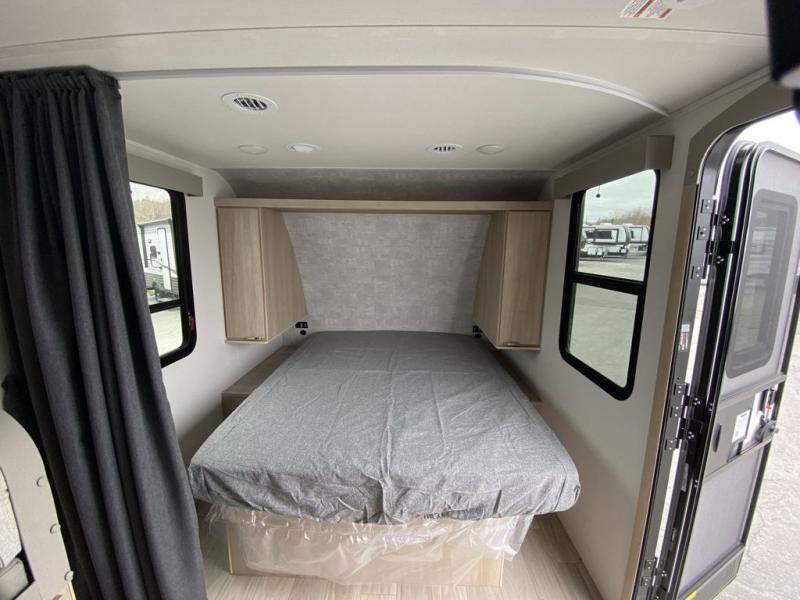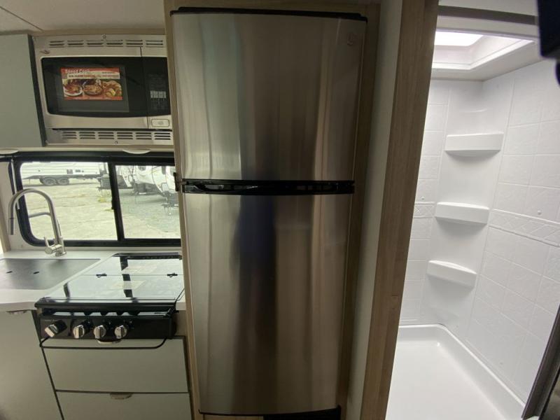 Pack your bags and head to the campground with this travel trailer! You will love all that it has to offer from the full rear bathroom to the front 60" x 74" RV queen-size bed with dual wardrobes on either side of the bed. The 44" x 72" booth dinette slide is not only a great place to enjoy your meals at or play card games, but it can also be transformed into an extra sleeping space if you want to bring along a guest. When you don't feel like making dinner, you can easily pop in some leftovers or a bag of popcorn into the convection microwave and relax while you watch a movie on the Smart TV!