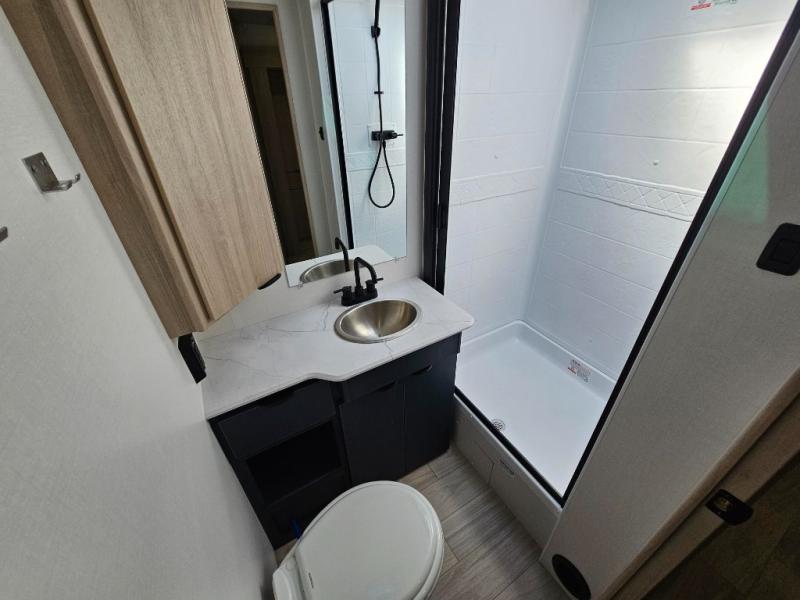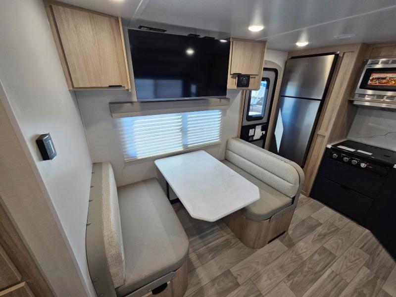 This travel trailer will feel just like home with its front private bedroom with its own exterior entry door, a full bath, plus a rear kitchen to cook up your best meals. Once lunch is made, you can dine at the booth dinette, or take your plate outdoors to sit under the 18' power awning with LED lights. The large slide out will provide more space to let the dog nap on the floor, and there is a Smart TV to watch a movie on those rainy camp days. You'll also find plenty of storage space throughout this travel trailer for all your belongings, and exterior storage for camp gear!