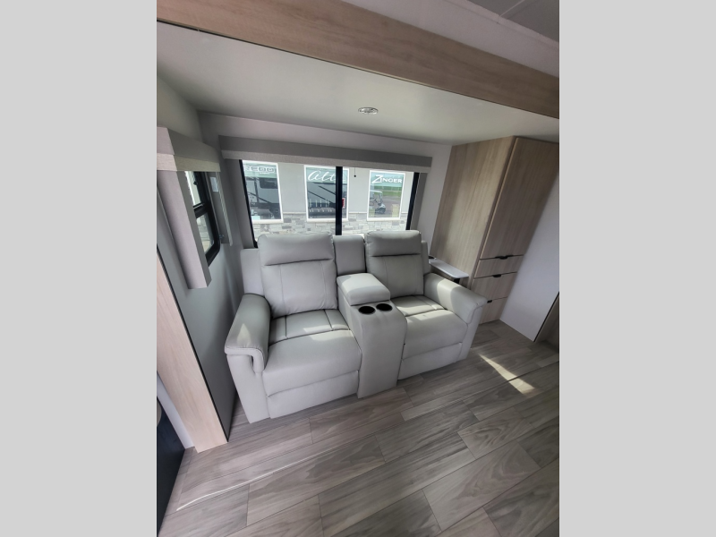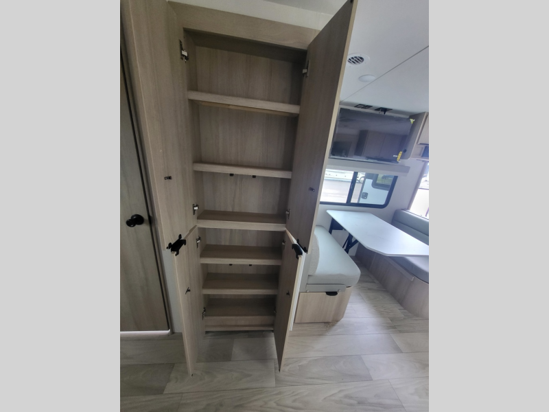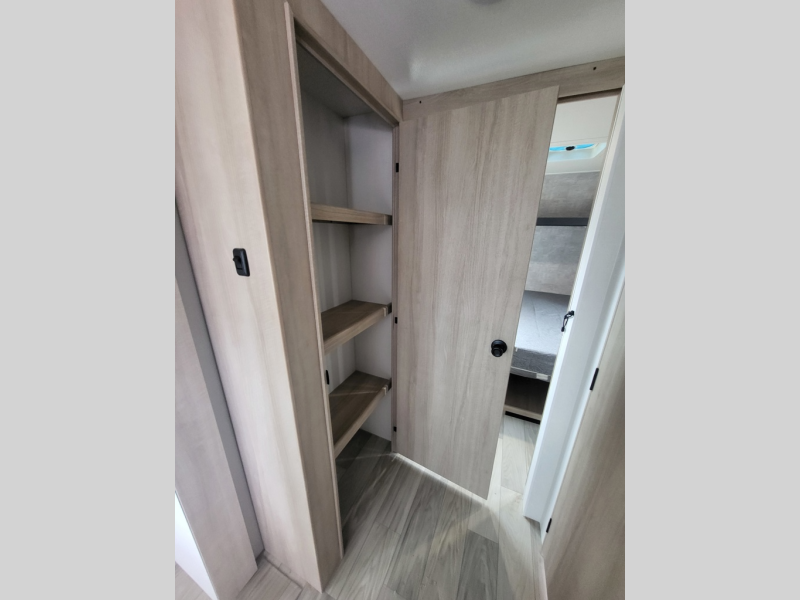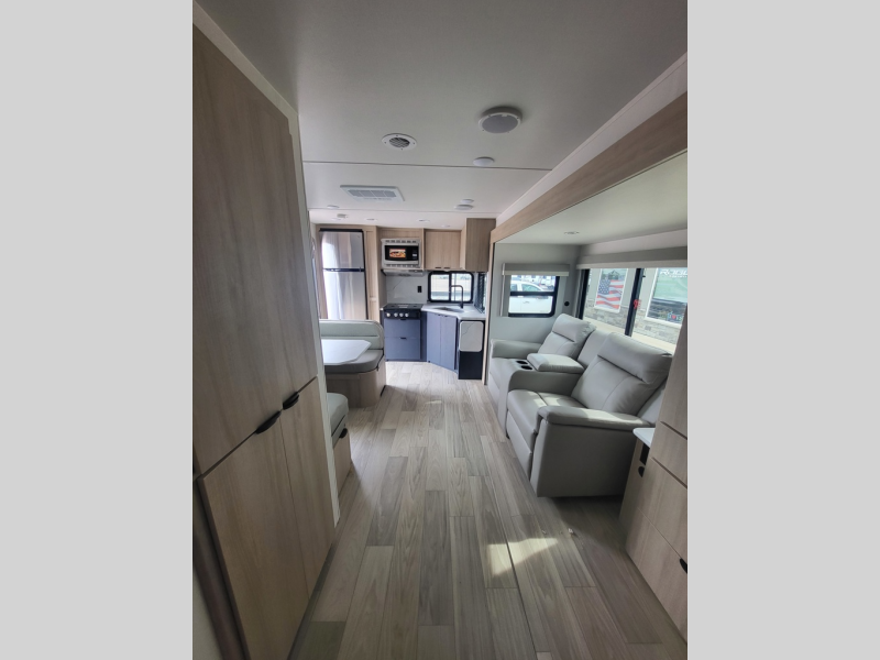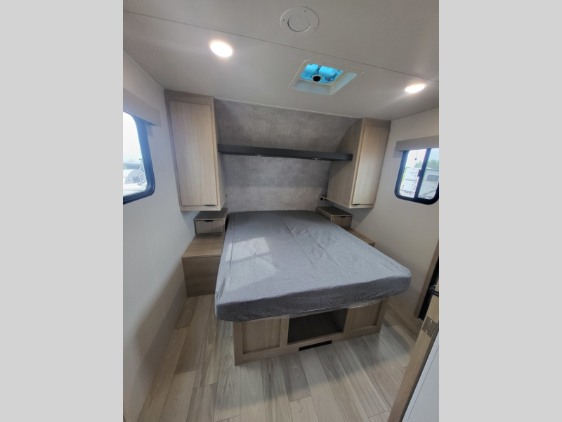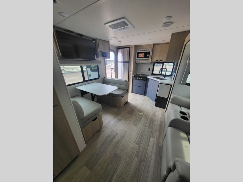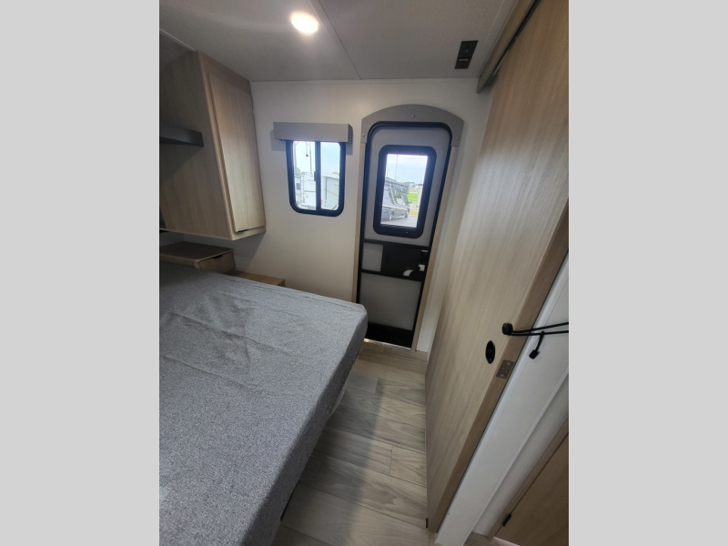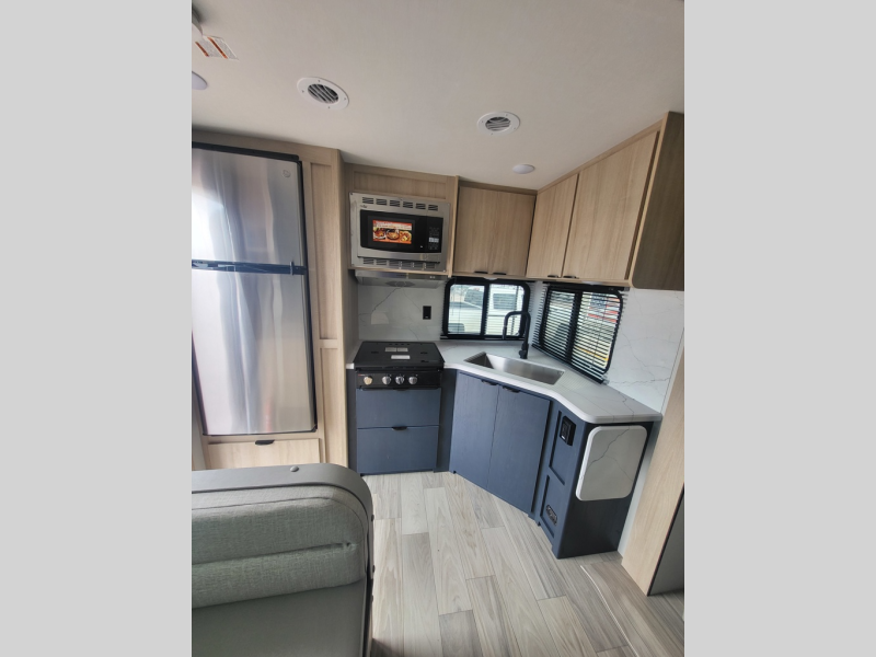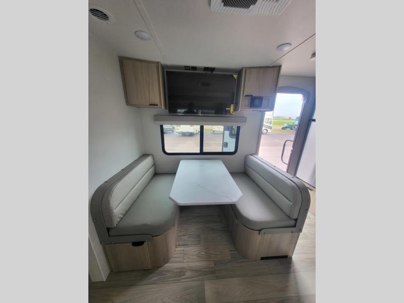 This travel trailer will feel just like home with its front private bedroom with its own exterior entry door, a full bath, plus a rear kitchen to cook up your best meals. Once lunch is made, you can dine at the booth dinette, or take your plate outdoors to sit under the 18' power awning with LED lights. The large slide out will provide more space to let the dog nap on the floor, and there is a Smart TV to watch a movie on those rainy camp days. You'll also find plenty of storage space throughout this travel trailer for all your belongings, and exterior storage for camp gear!