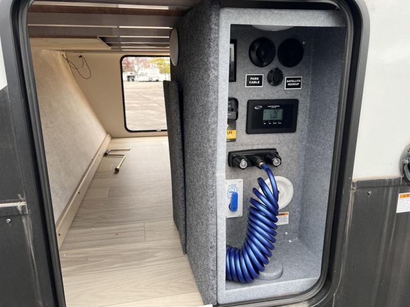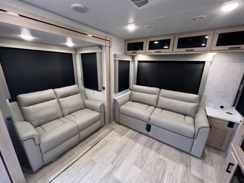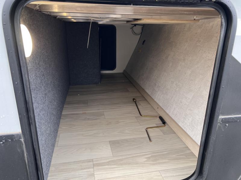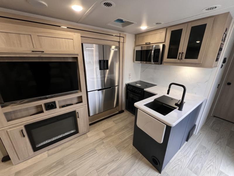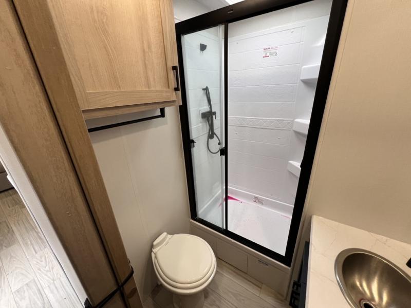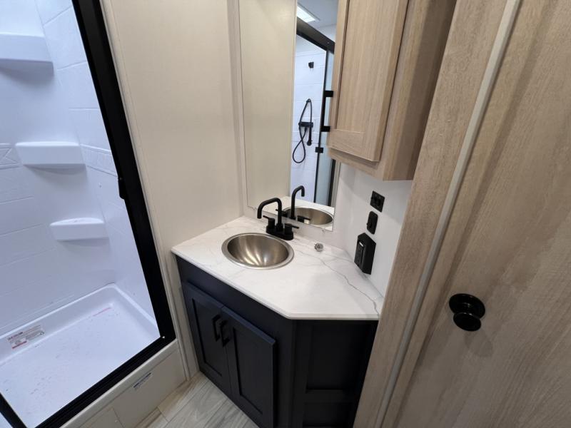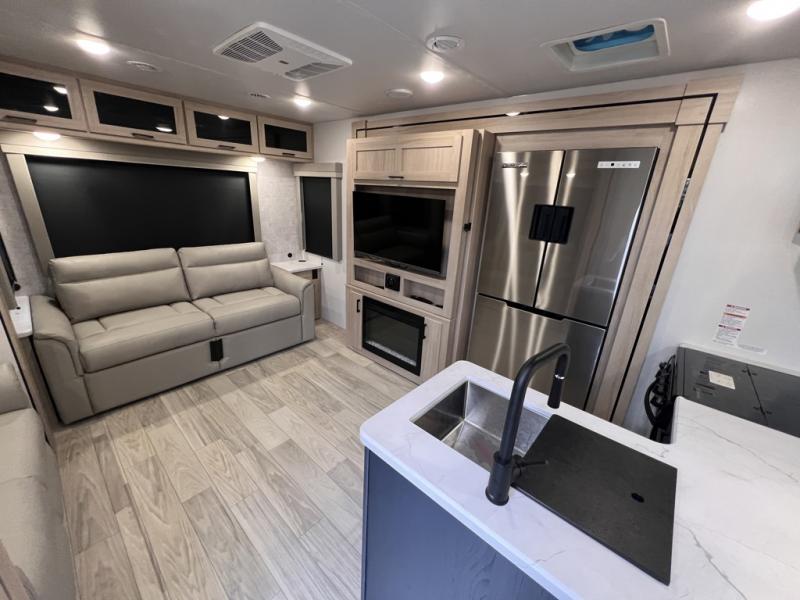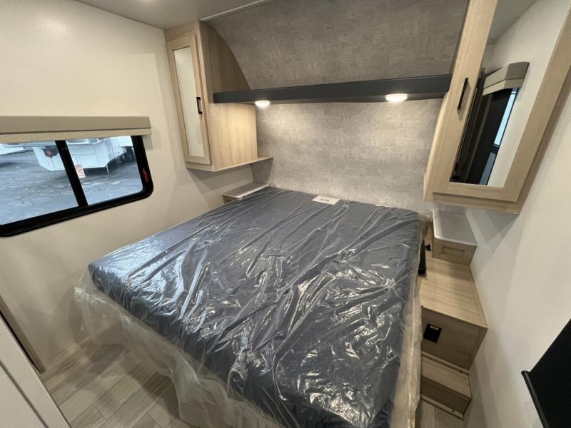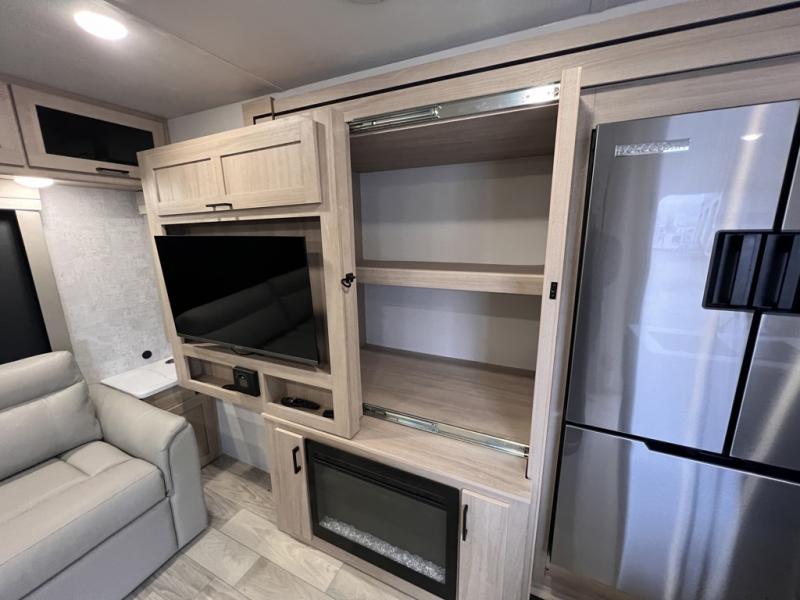 Looking to unwind indoors when you aren't hiking scenic trails? This trailer has extra gathering space in the rear living area because of the opposing slides that hold the theater seating on one side, and the hidden pantry behind the entertainment center and Smart TV with fireplace below and the 15 cubic foot refrigerator on the other side. There is also a 72" tri-fold sofa in the rear with a sofa table so that you can easily keep your drinks nearby. As you get cleaned up in the full bathroom, you'll love that the large skylight brings in some extra natural lighting, and the front private bedroom will be a welcome retreat after a full day of camping. The dual bedside nightstands and wardrobes will allow you to keep things neat and tidy.