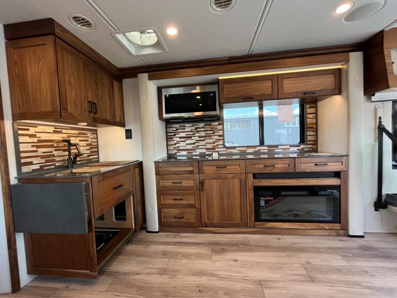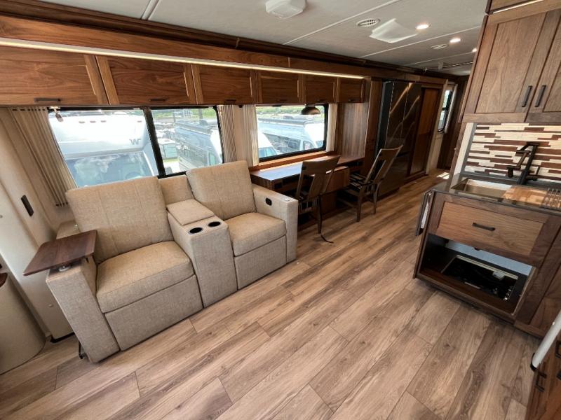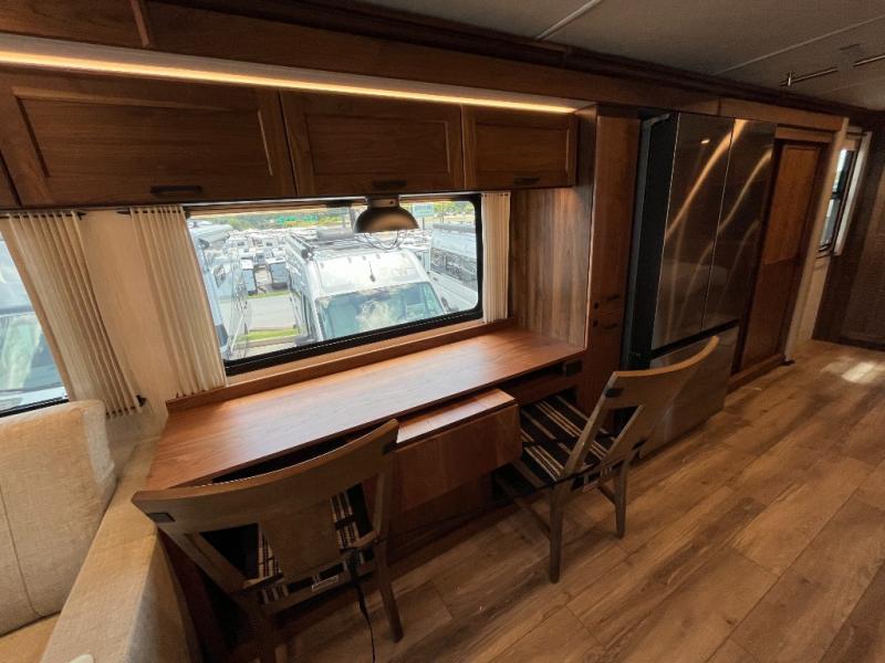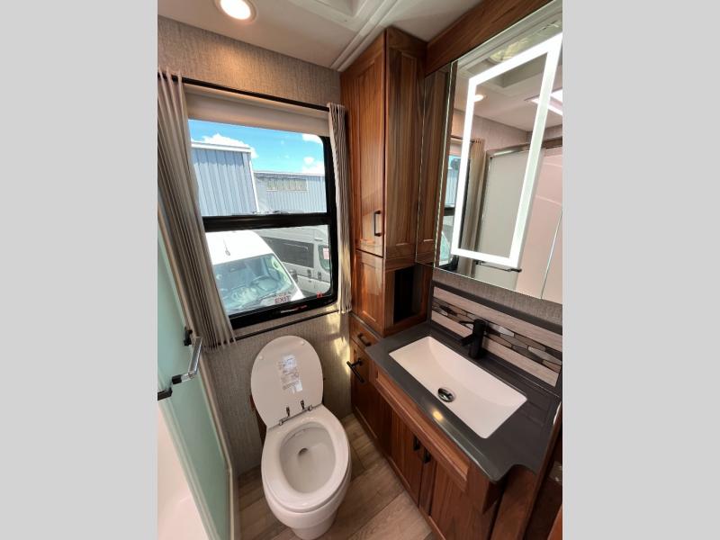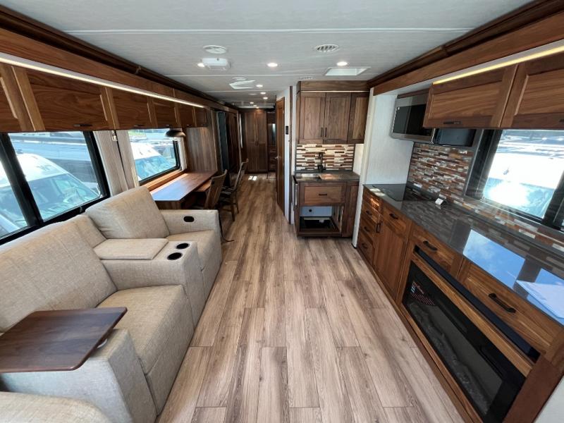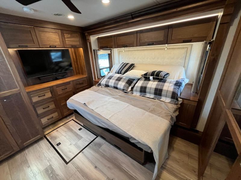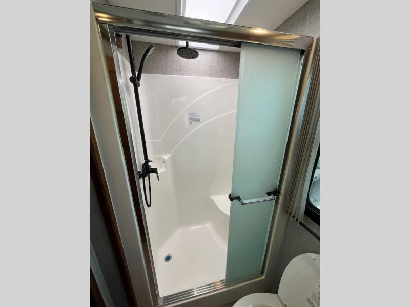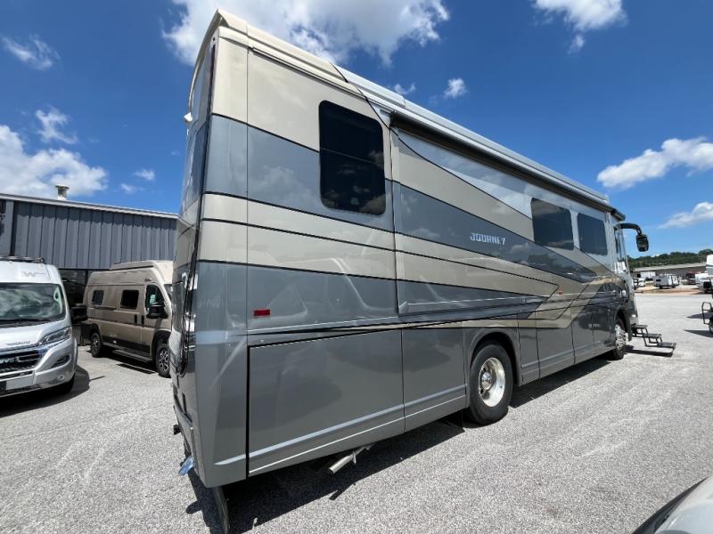 Prepare to be blown away by this Journey motorhome packed with stylish features. You will love the interior space you have thanks to the triple slides, and you'll find plenty of seating space on the Rest Easy sofa, the Glide & Dine dining table and chairs, and the swivel captain's seats. The chef of the family can prepare home cooked meals using the two burner induction cooktop, plus there is a pull-up countertop extension for extra counter space and a buffet. The pop-up TV allows you to enjoy movie night with popcorn, and there is also a bedroom TV to watch the evening news in bed. You will enjoy the rear private bedroom with its slide out king bed, customizable wardrobe, convenient medical device storage, and dual nightstands just like at home. The luxury shower features a large shower with a seat, an electric flush porcelain toilet, and plenty of storage space for all your necessities.