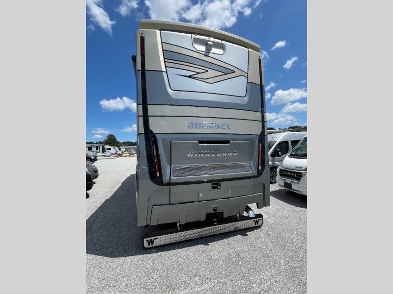 The journey is just a sweet as the destination in a Journey Class A diesel motorhome by Winnebago. You will love the Opitview all-digital dash and instrument panel, and the Xite radio with a 12.3" color touch screen, infotainment/GPS navigation system to make each trip hassle-free. The dual-pane, tinted and frameless contoured windows create a panoramic view, and the luxury plank residential flooring throughout will make it feel more like home. You will find convenient USB chargers throughout to keep your tablet or phone ready to go. Outside, the 22' Carefree Apex awning expands outward12' for extra outdoor living space to invite more friends, and each model includes an exterior wash station, a pet leash tie down, plus best-in-class storage for all your belongings. Wherever you decide to roam, you will enjoy luxury travel and stylish appointments at every turn with a Journey Class A diesel motorhome!