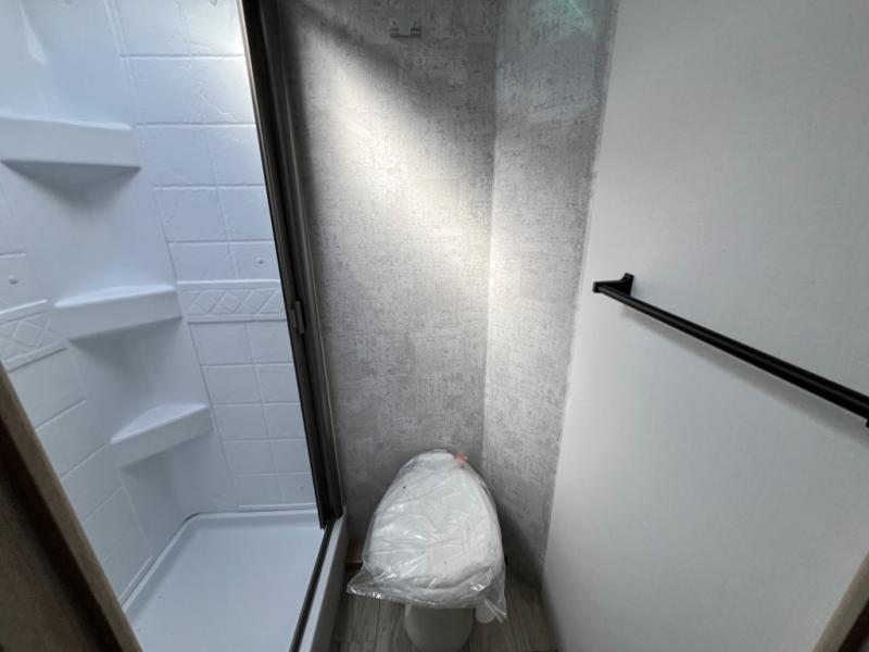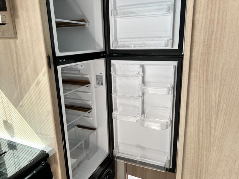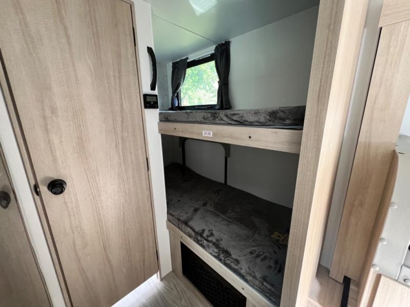 Get ready for a fun family weekend in the great outdoors with this trailer only steps away to enjoy inside comforts! The cook will love having everything to make warm meals, and can easily store leftovers in the 10.3 cu. ft. 12V refrigerator, plus the flip-up counter gives them more space to prep or dry the dishes. The front 54" x 74" full bed has a divider curtain for privacy at night and the rear corner 28" x 72" bunk beds are conveniently next to the private toilet and shower room. The booth dinette slide gives you a place to dine as well as sleep one more person, plus you will love the extra floor space that it provides. You might like to choose the EZ Glide Sofa Sleeper and table option in its place, the option is yours!
