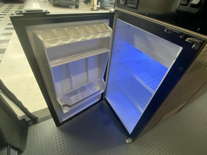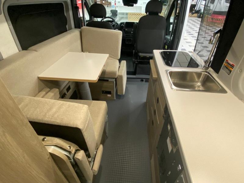This camper van is perfect for independent travel or if you've got a camping partner to take along with you! The convertible dinette bed can transform into a twin-size bed for one or a double-size bed for two. The three seating modes include a belt mode, sofa mode, or lounge mode for even more comfort. You will find all you need in the kitchen to prepare meals each day, including a two burner range with a glass cover for more counter space and a 3.0 cu. ft. 12V single door compressor-driven refrigerator/freezer for food storage. There is a shower with a wall surround in the rear wet bath, along with a removable cassette toilet, a medicine cabinet with a mirror, and a wardrobe cabinet with added storage. This space could also be used as a mudroom after a day of exploring, or utilize it for storage!