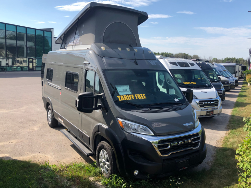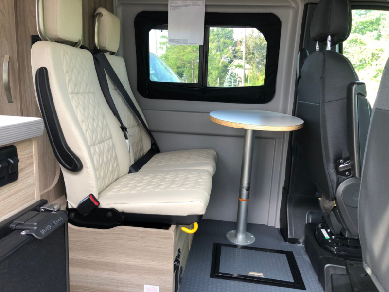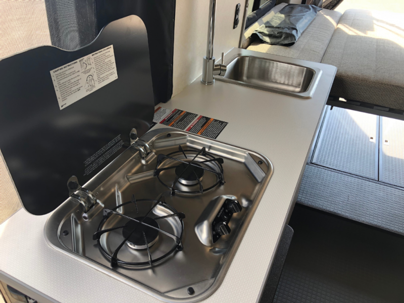 Enjoy a weekend ride in the mountains or make it an overnight stay with versatile sleeping options in this camper van. You'll find the Murphy+ bed in the back will provide a great night's rest, or you can choose the optional sofa/bed with added belted seating if you have more tag-alongs. And of course the little ones will love the pop-top sleeping area to climb into each night. After you've freshened up in the convenient wet bath, prepare breakfast on the two burner range, and the milk and eggs can go back in the 3.0 cu. ft. single door refrigerator/freezer. This model also includes rear double doors with screens to let the breeze in and keep bugs out!